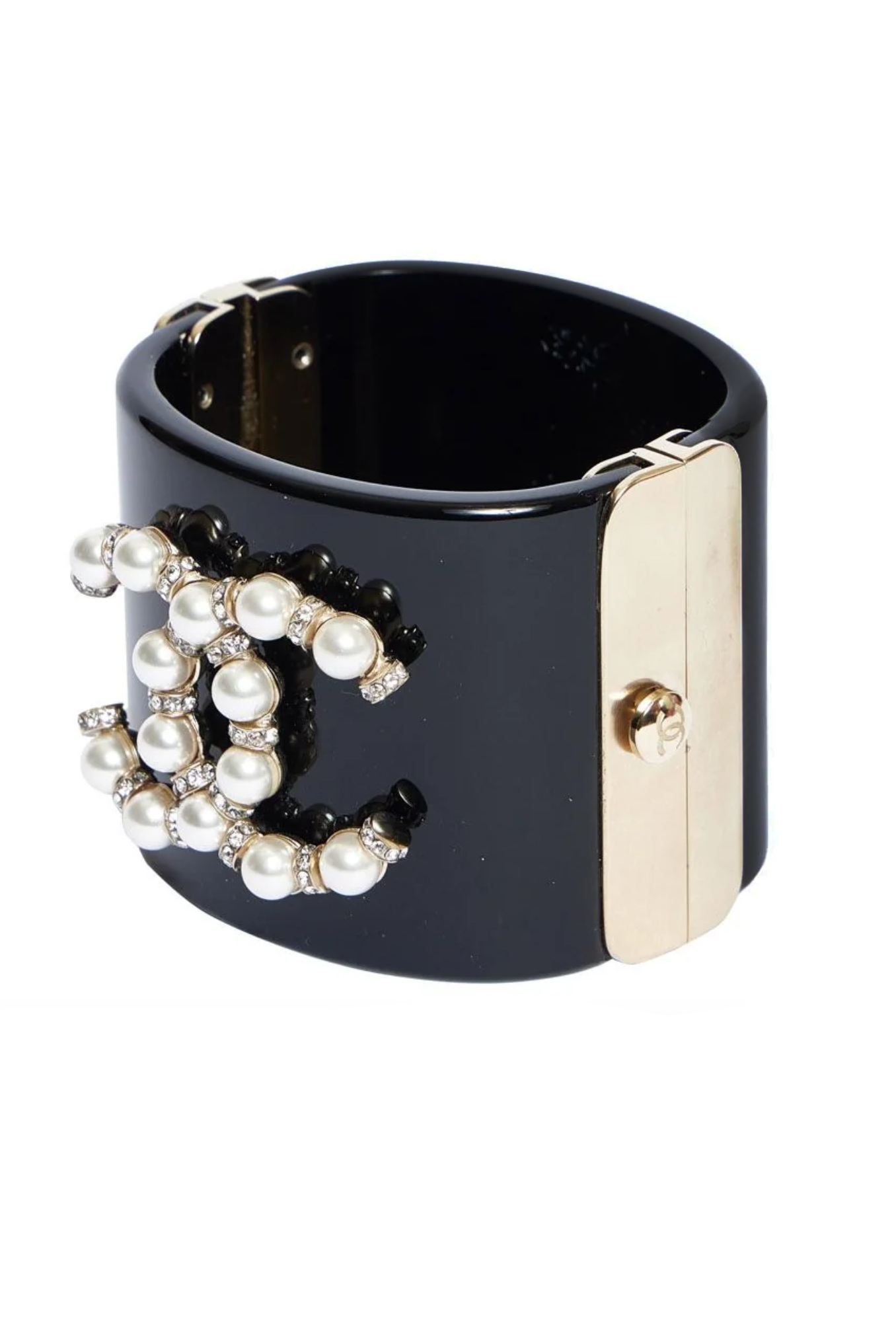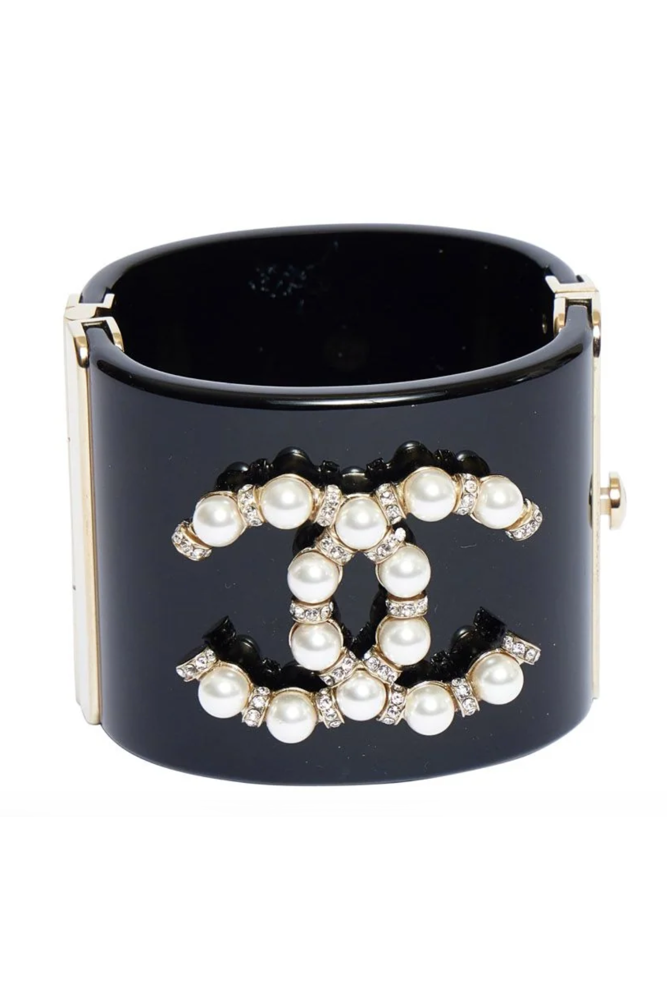 Chanel Black Resin CC Pearl Logo Cuff Bracelet