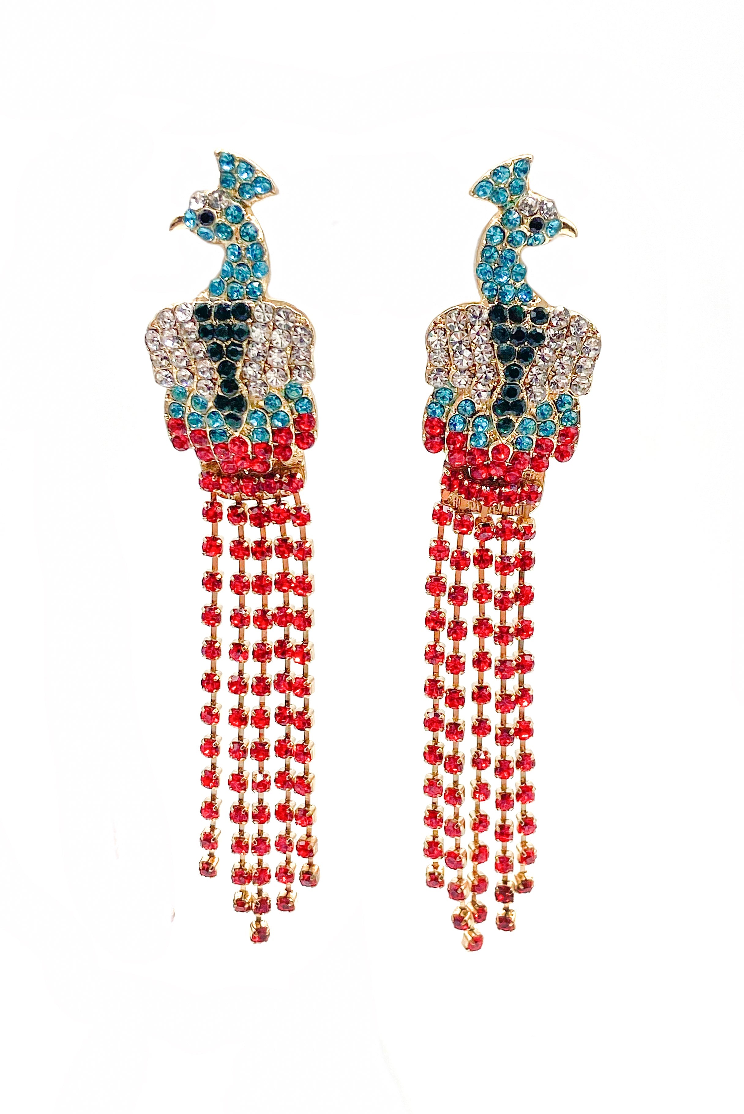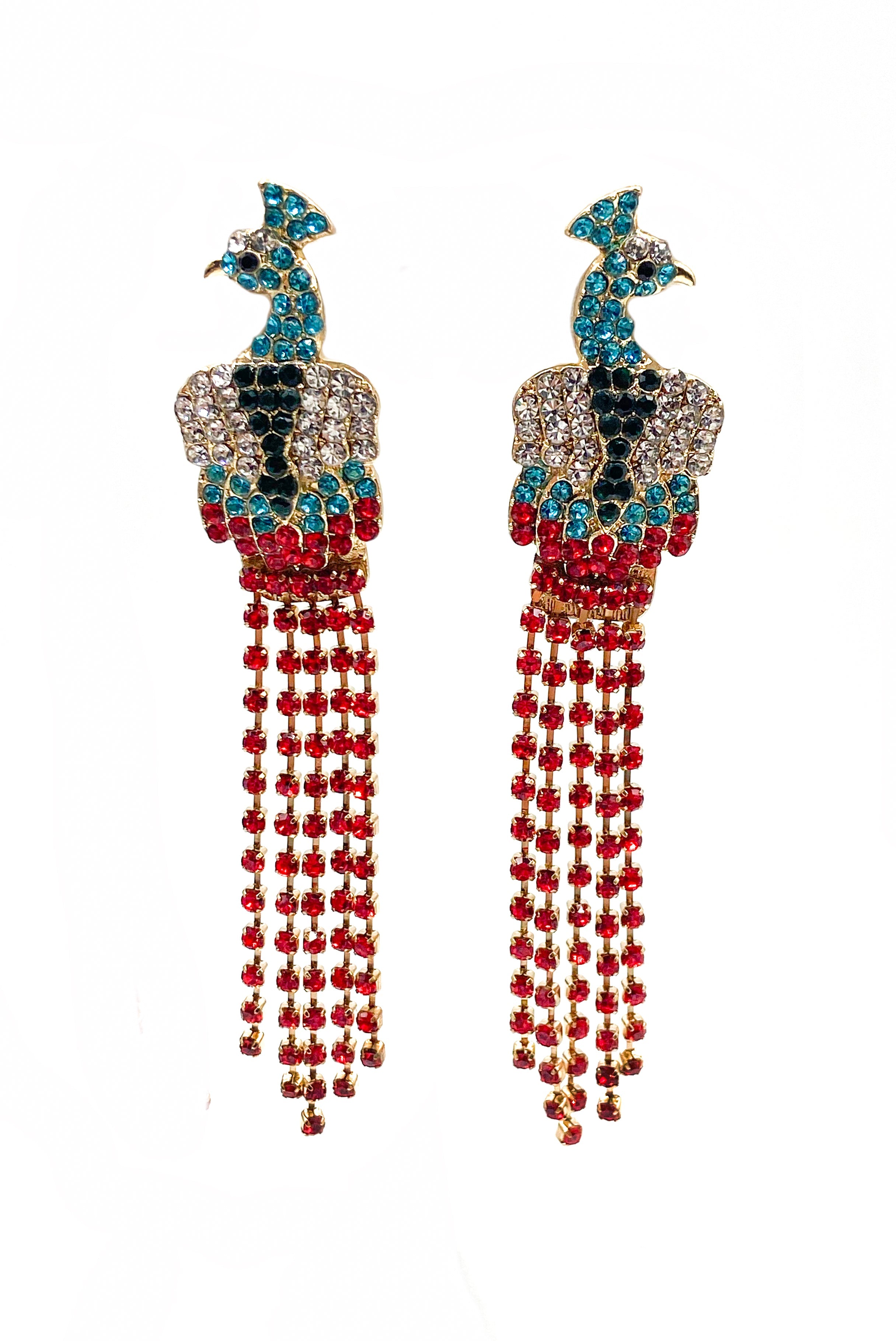 A pair of vintage multicolor crystal earrings that create two elegant peacocks very much in the style of Van Cleef & Arpel. The earrings have red cascading "tail feathers" that cascade down from the earrings and measure 4 inches. The earrings have push through backing.