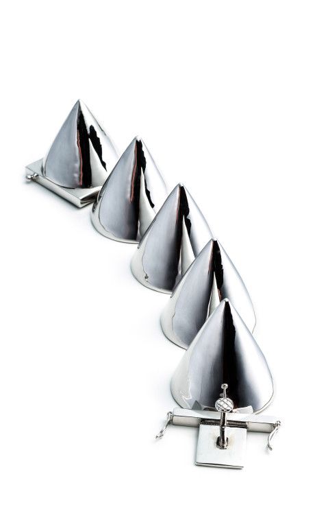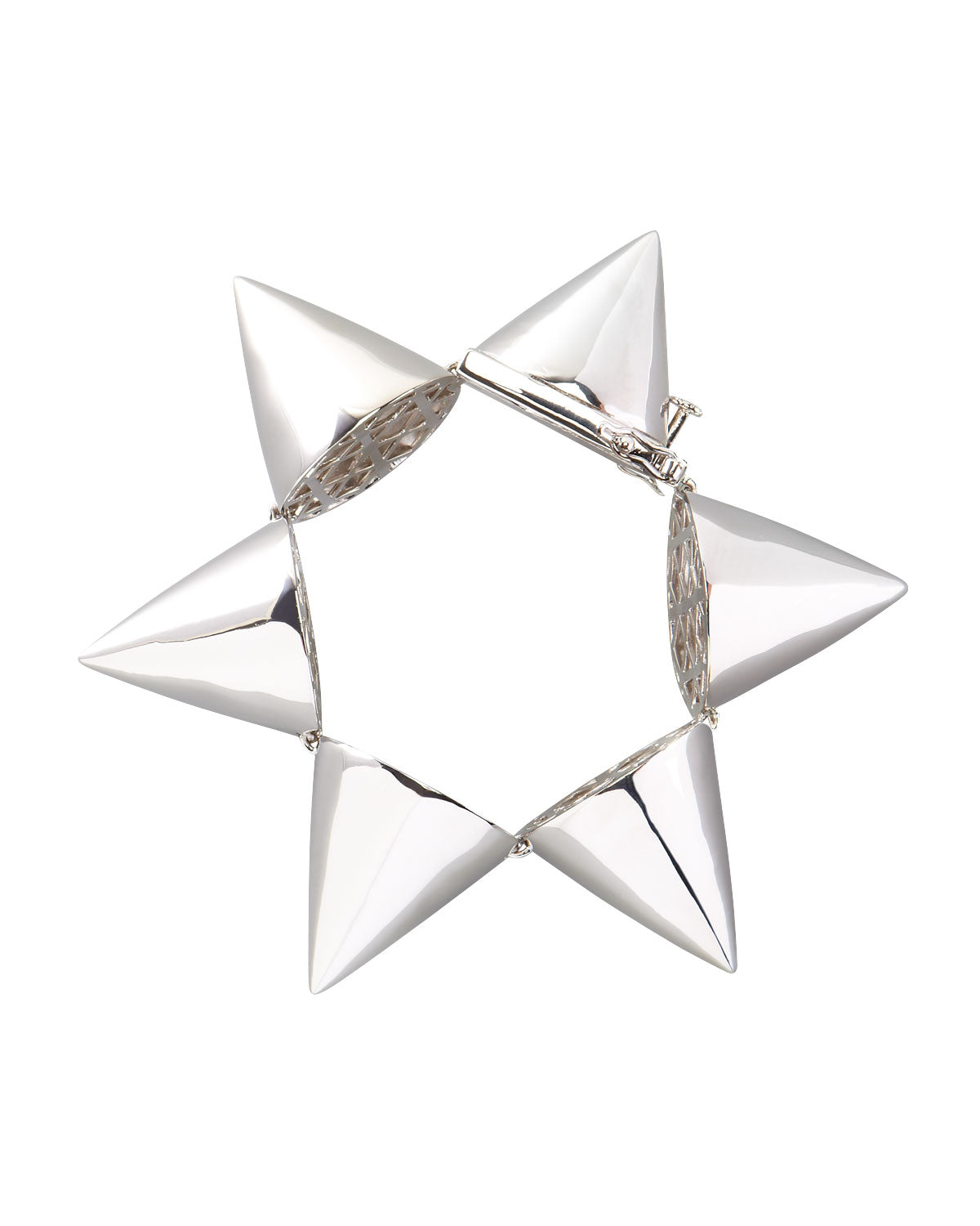 An Eddie Borgo silver toned extra large cone statement bracelet. The bracelet is created from 6 oversize cone spikes with a push lock clasp and security latch for closure.