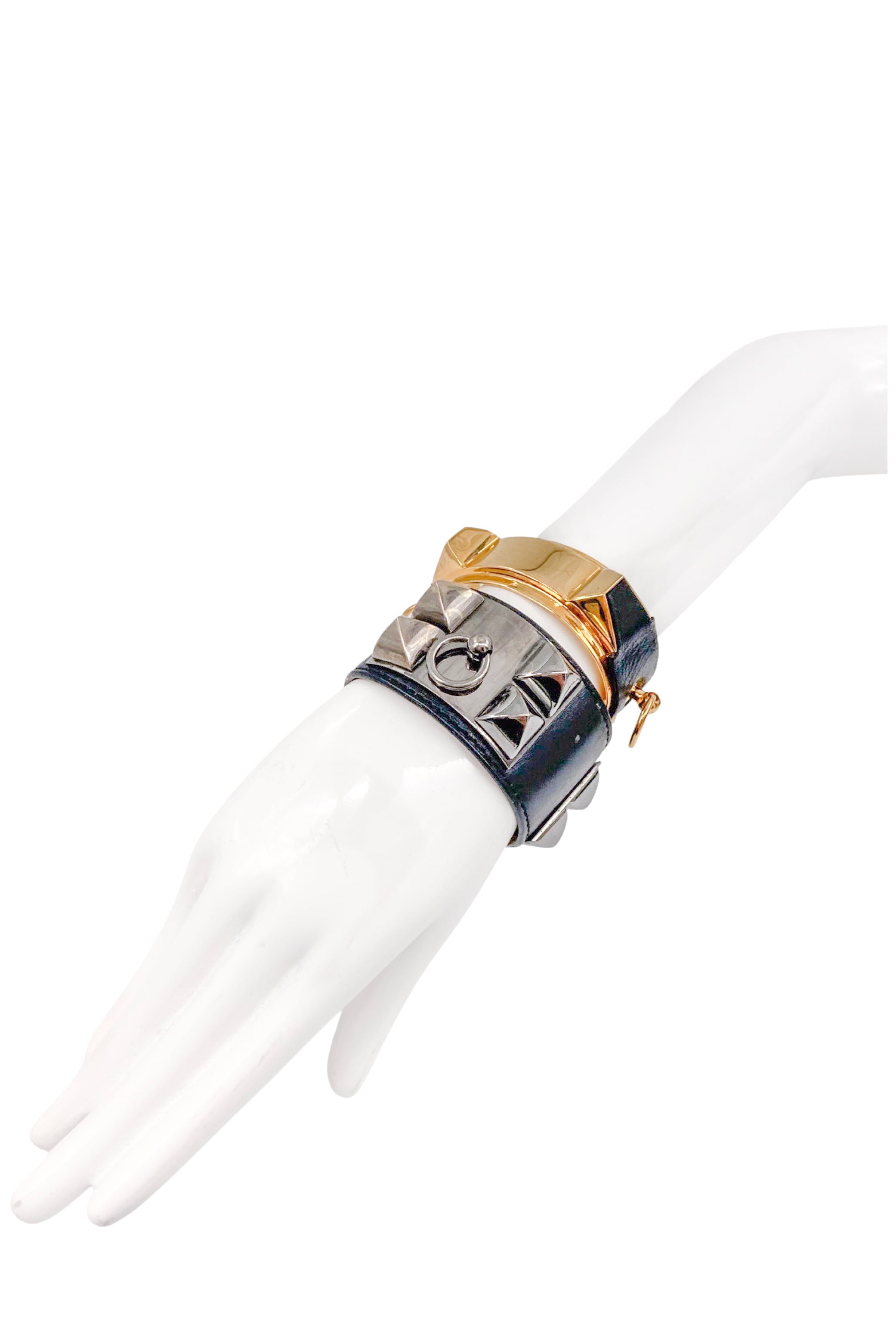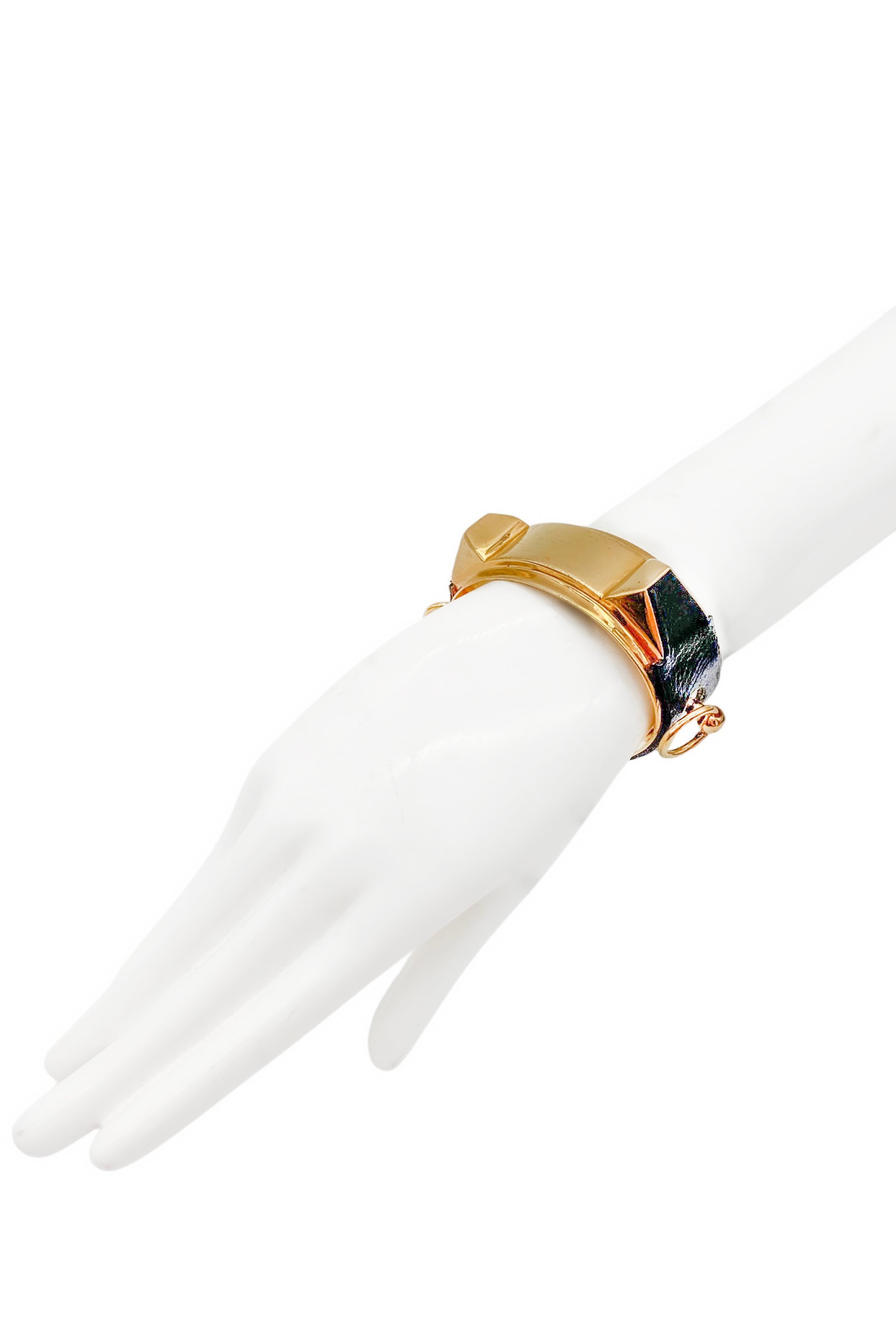A Faith Connection gold cuff bracelet with black leather details. The cuff has gold pyramid style large studs and a gold o-ring hardware detail.