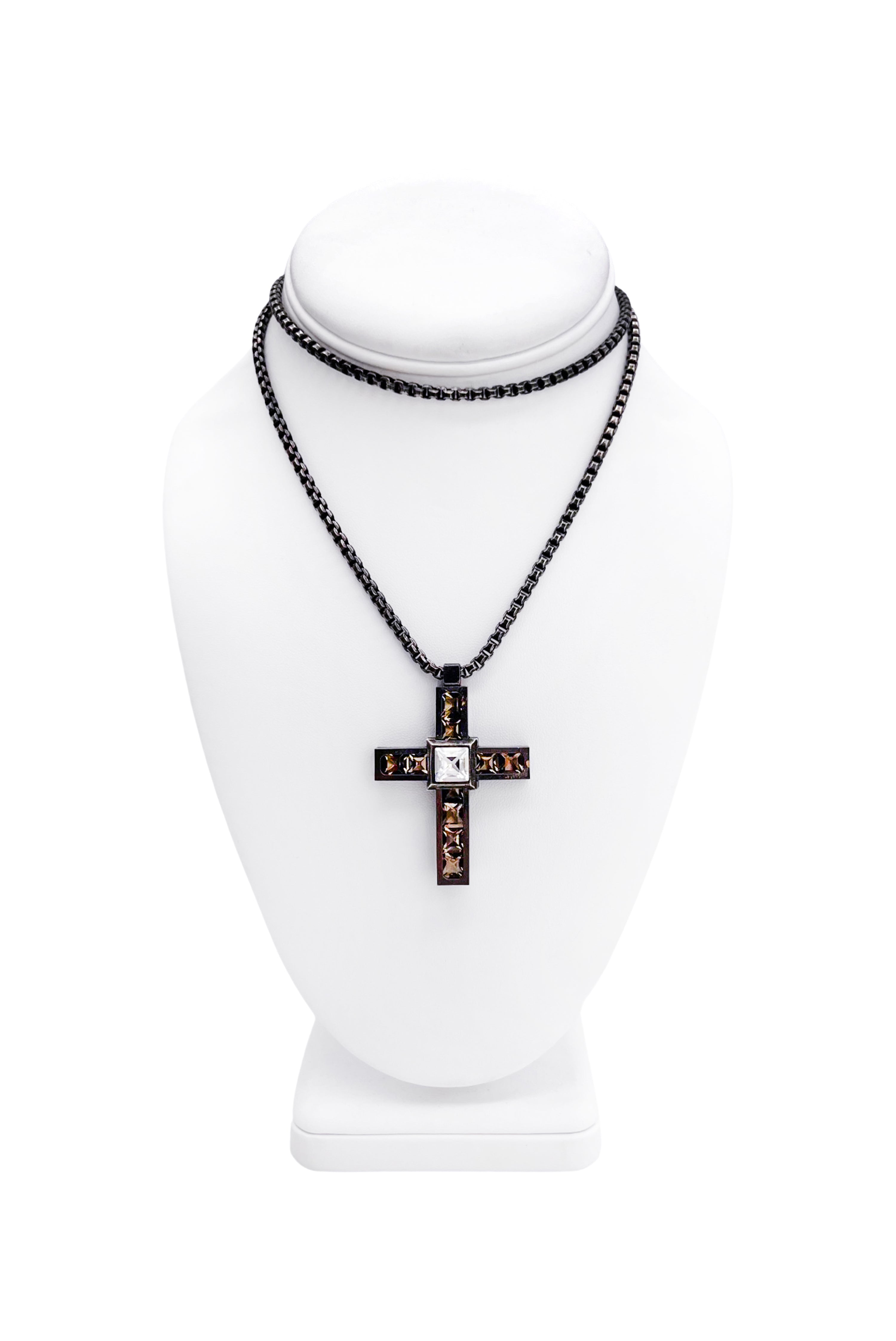 Lanvin Square Clear Crystal and Dark Crystal Cross Pendant Necklace on a Dark Silver Chain