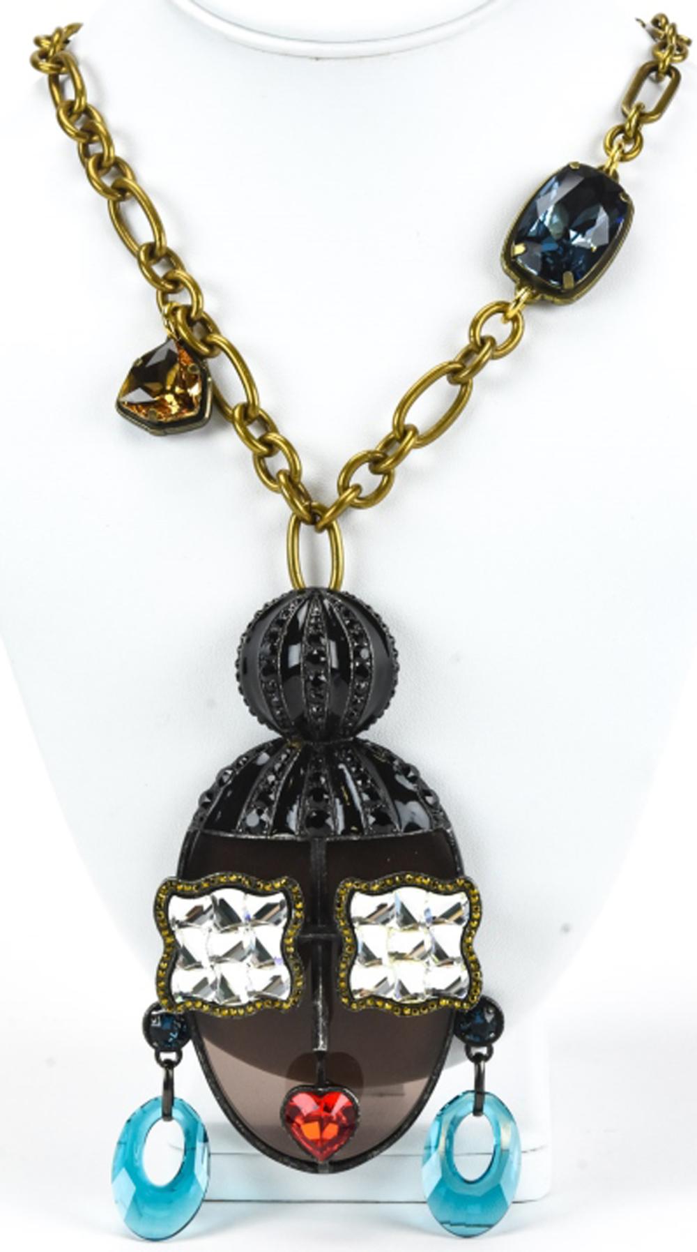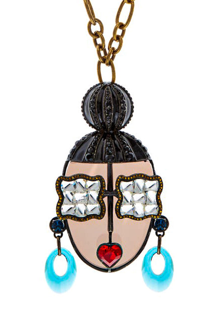 A Lanvin "Zandra" necklace with a geometric woman's face pendent. The pendent is a clear resin of a woman's face with clear crystal oversize sunglasses, ruby crystal lips and aquamarine crystal statement earrings. The top bun hairstyle has black crystals embellishing. The pendent hangs on a gold chain with varying size links interlocked with two crystals. From the Lanvin by Alber Elbaz Pre-Fall 2015 collection.