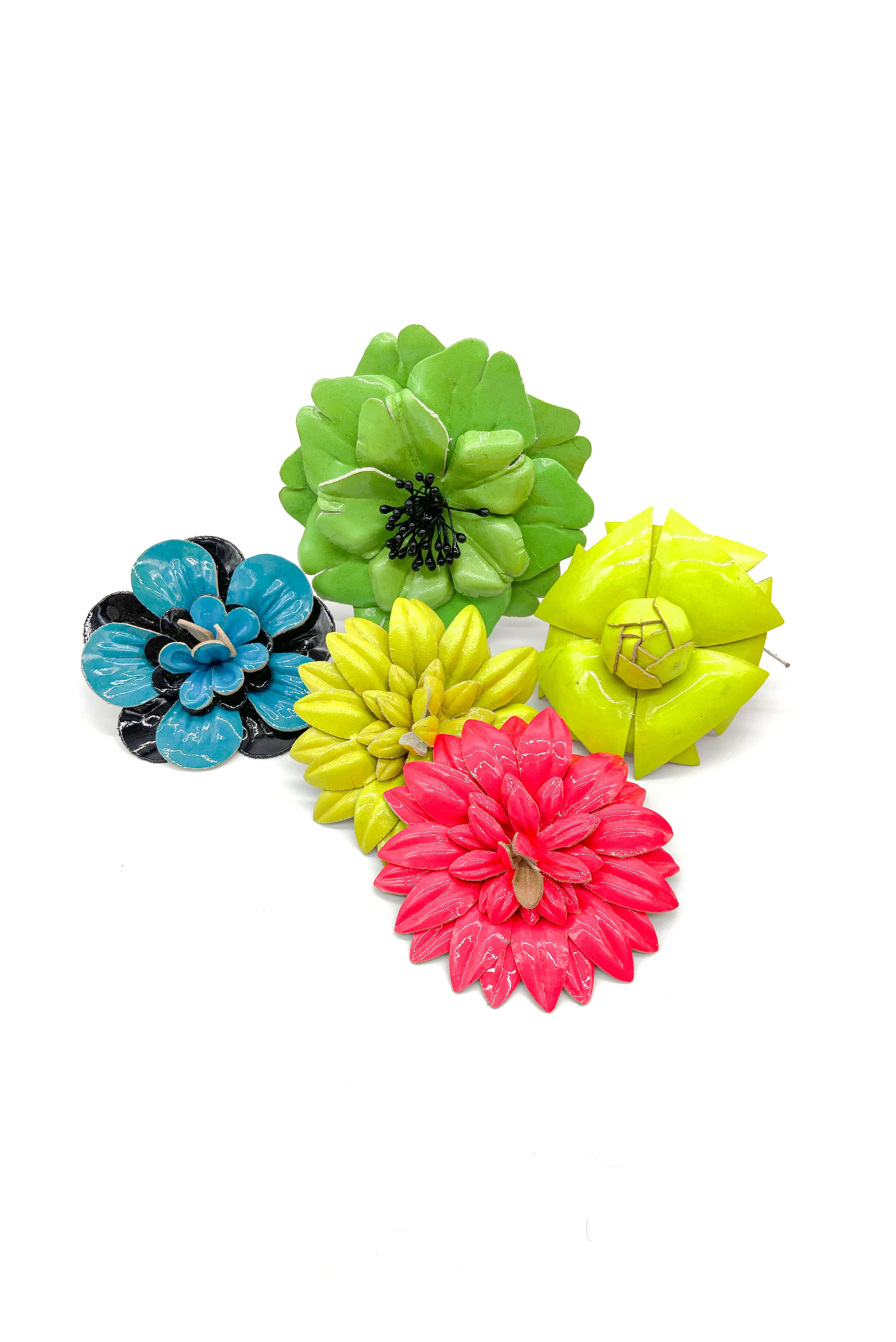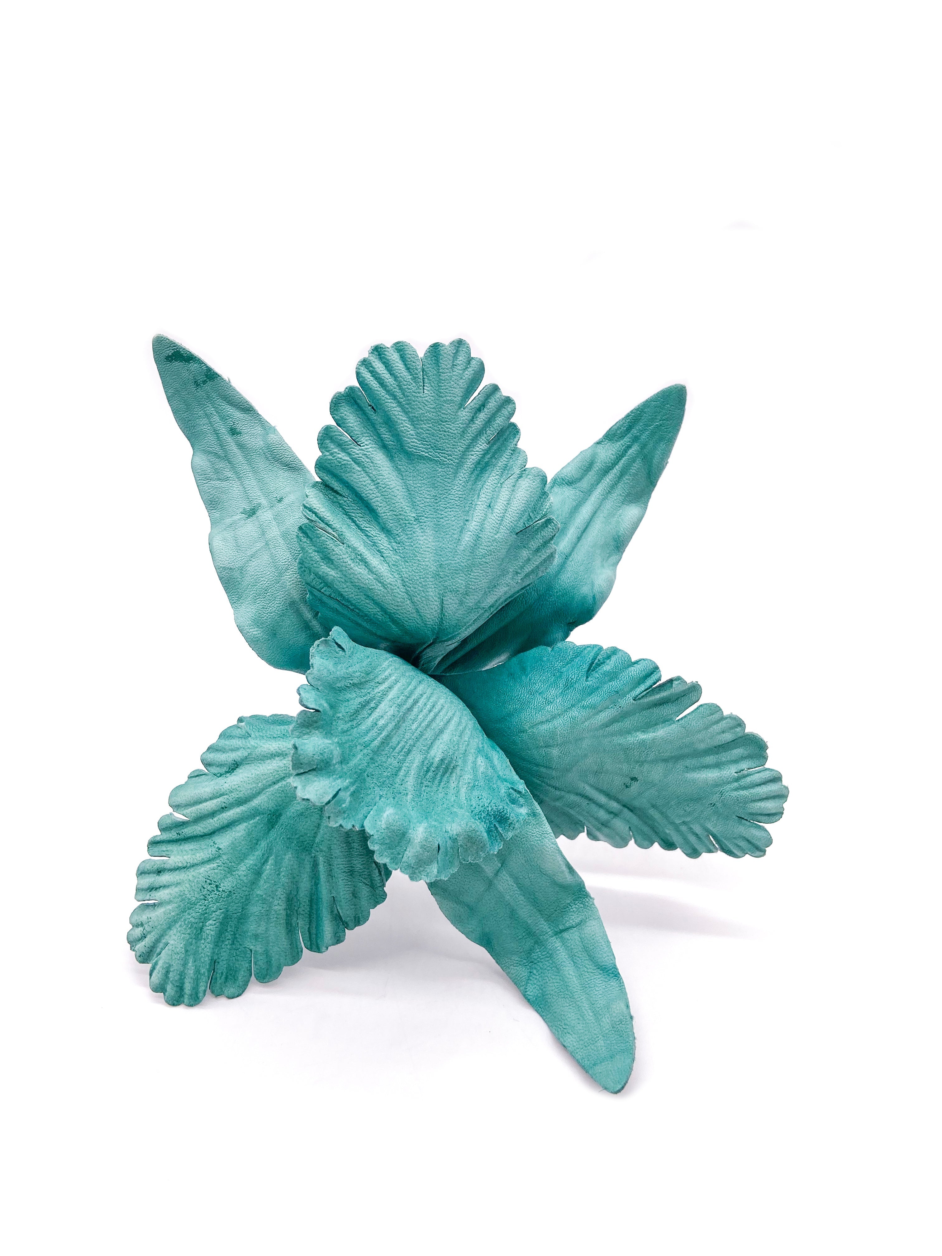 A M&S Smallberg electrically bright coral pink fabric orchid. The collection also includes a teal leather orchid and an assortment of neon color leather camellias as seen in the photos. The orchid can be worn as a corsage, broach or in the hair as a fascinator. The orchid is part of a collection that can be rented separately or together. Please inquire for more information.
