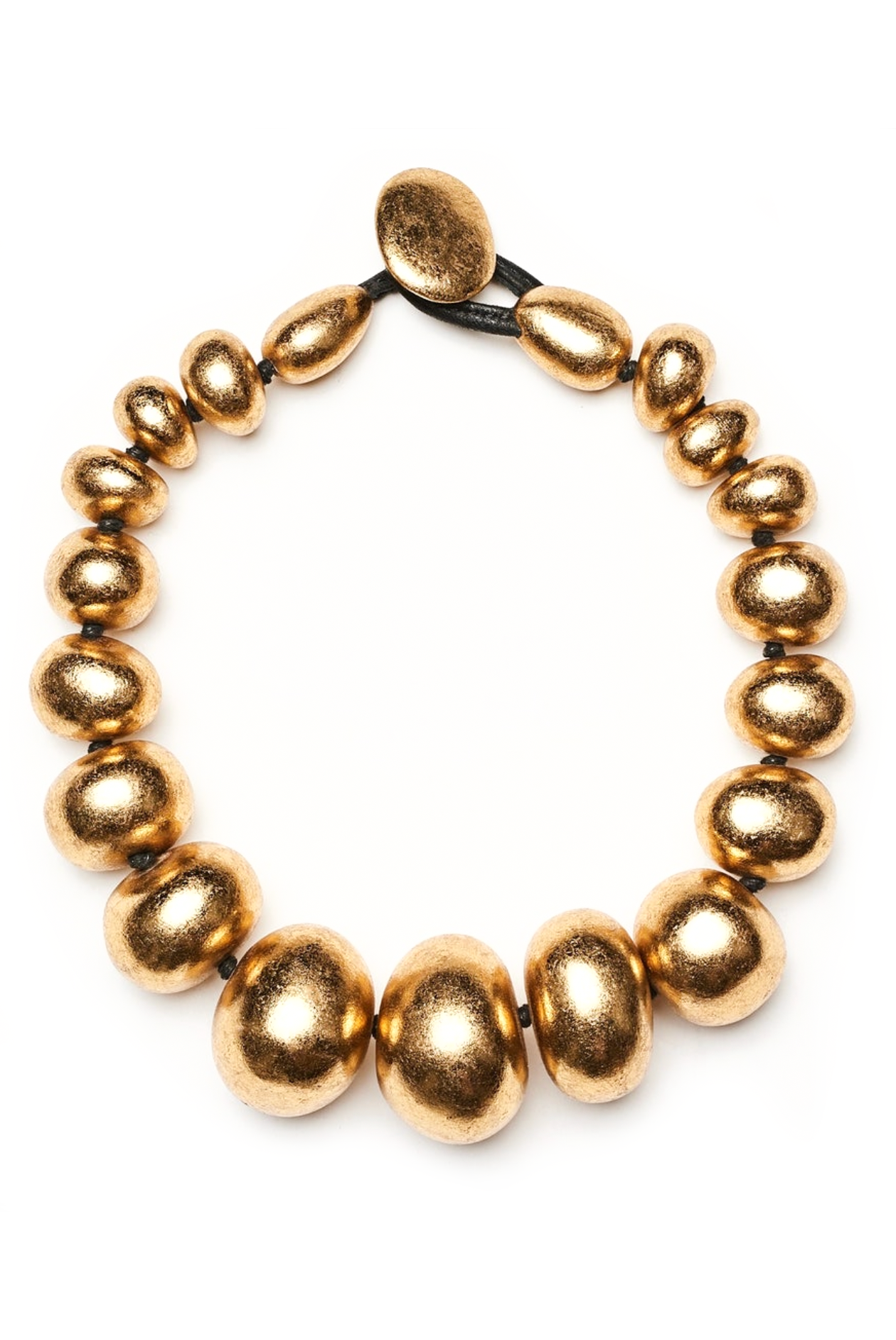 A Monies necklace with large round spherical beads covered in gold foil. The statement necklace has a hook closure.