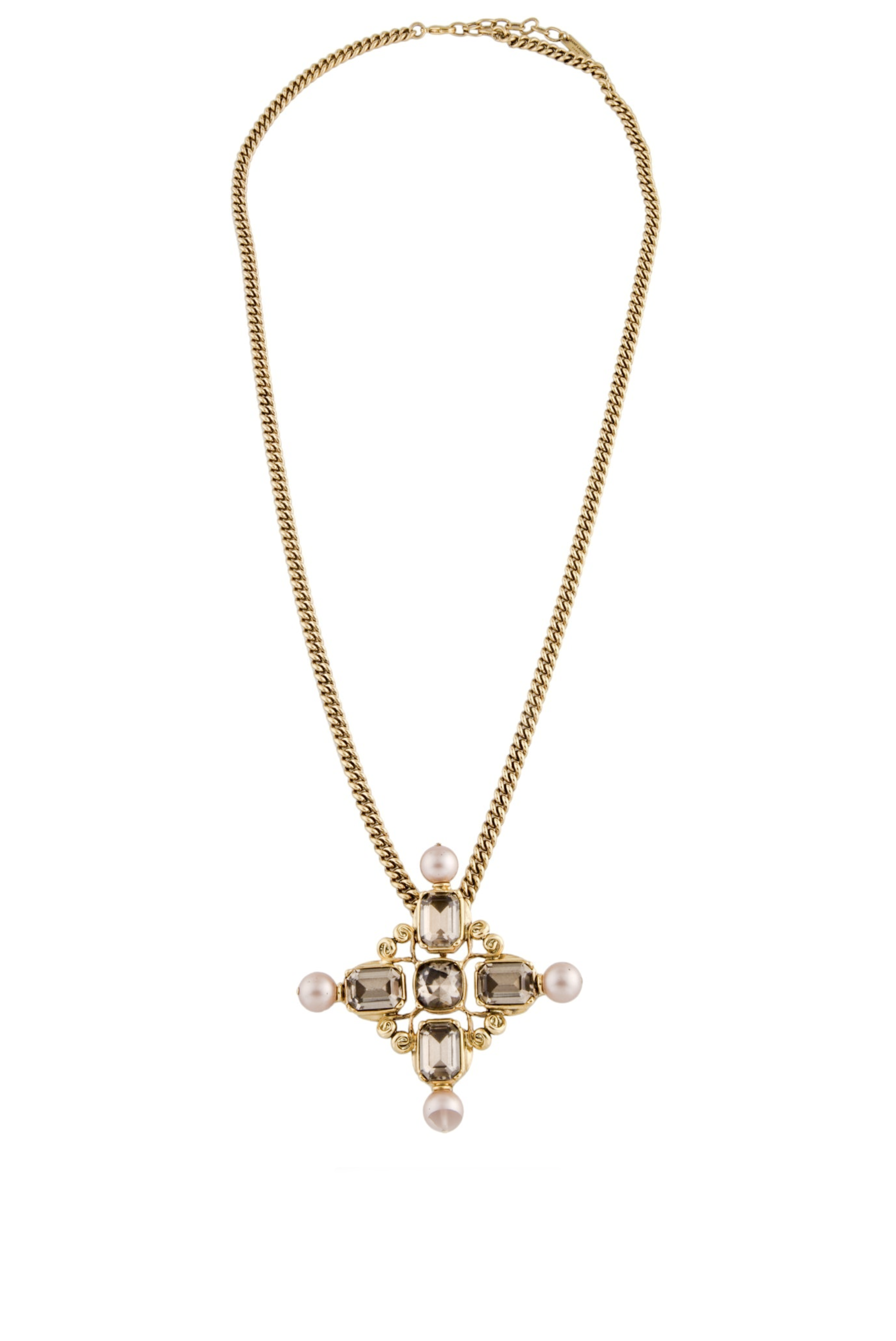 Saint Laurent Gold Gemstone Pearl Gripoix Style Cross Pendant Necklace