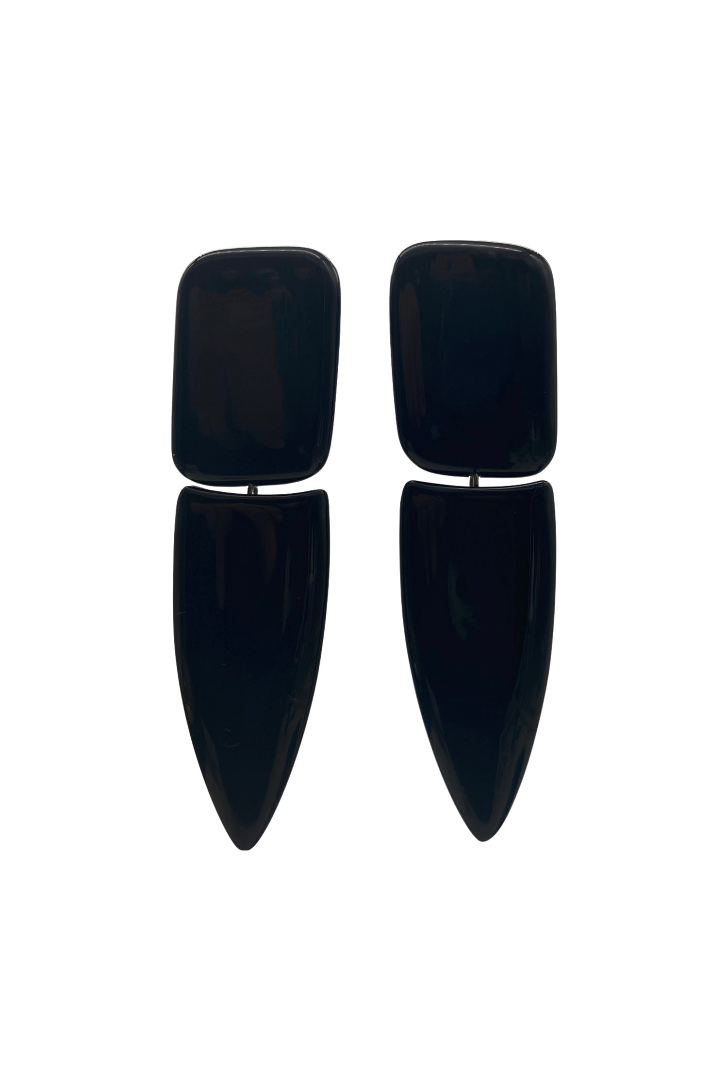 Saint Laurent Paris "Le Smoking" rounded square black resin with a clip on earring backing and triangular drop detail to give the earrings a dramatic flair. From the Saint Laurent Paris by Anthony Vaccarello Fall / Winter 2018 collection. An homage by Vaccarello to Yves Saint Laurent's 1980s costume jewelry cocktail attire.