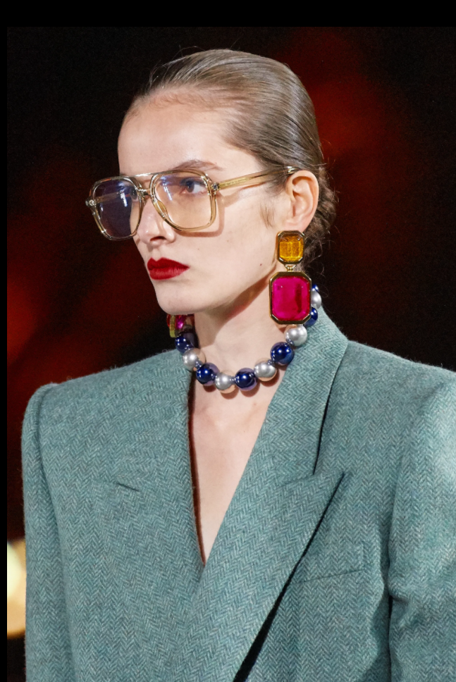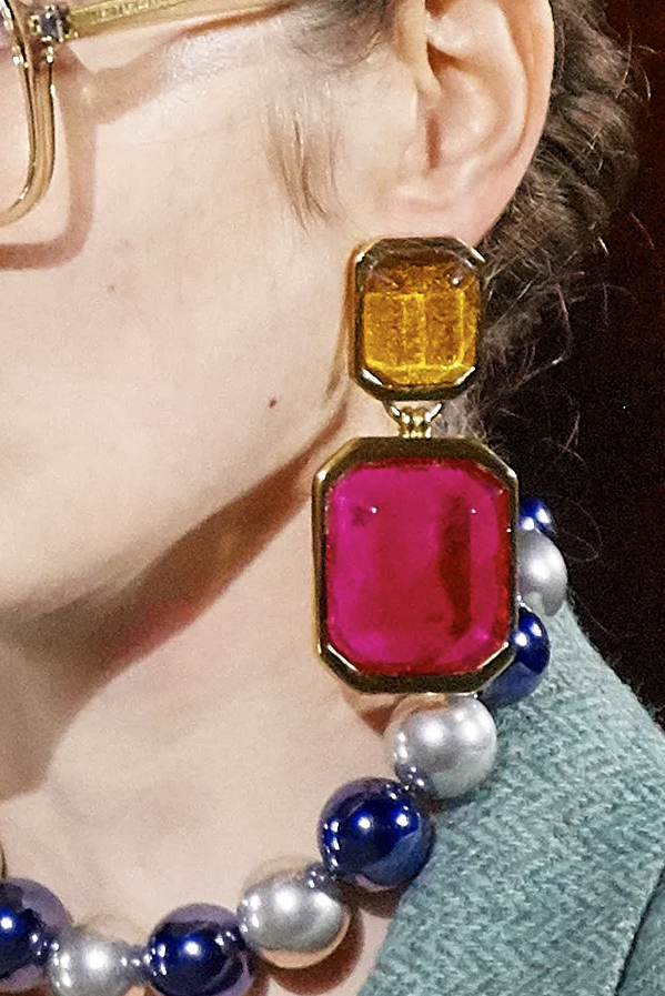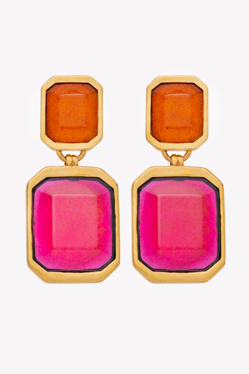 Saint Laurent Paris orange and pink jewel statement earrings set in a gold-tone setting. From the Saint Laurent Paris by Anthony Vaccarello Spring / Summer 2022 Ready-To-Wear collection.