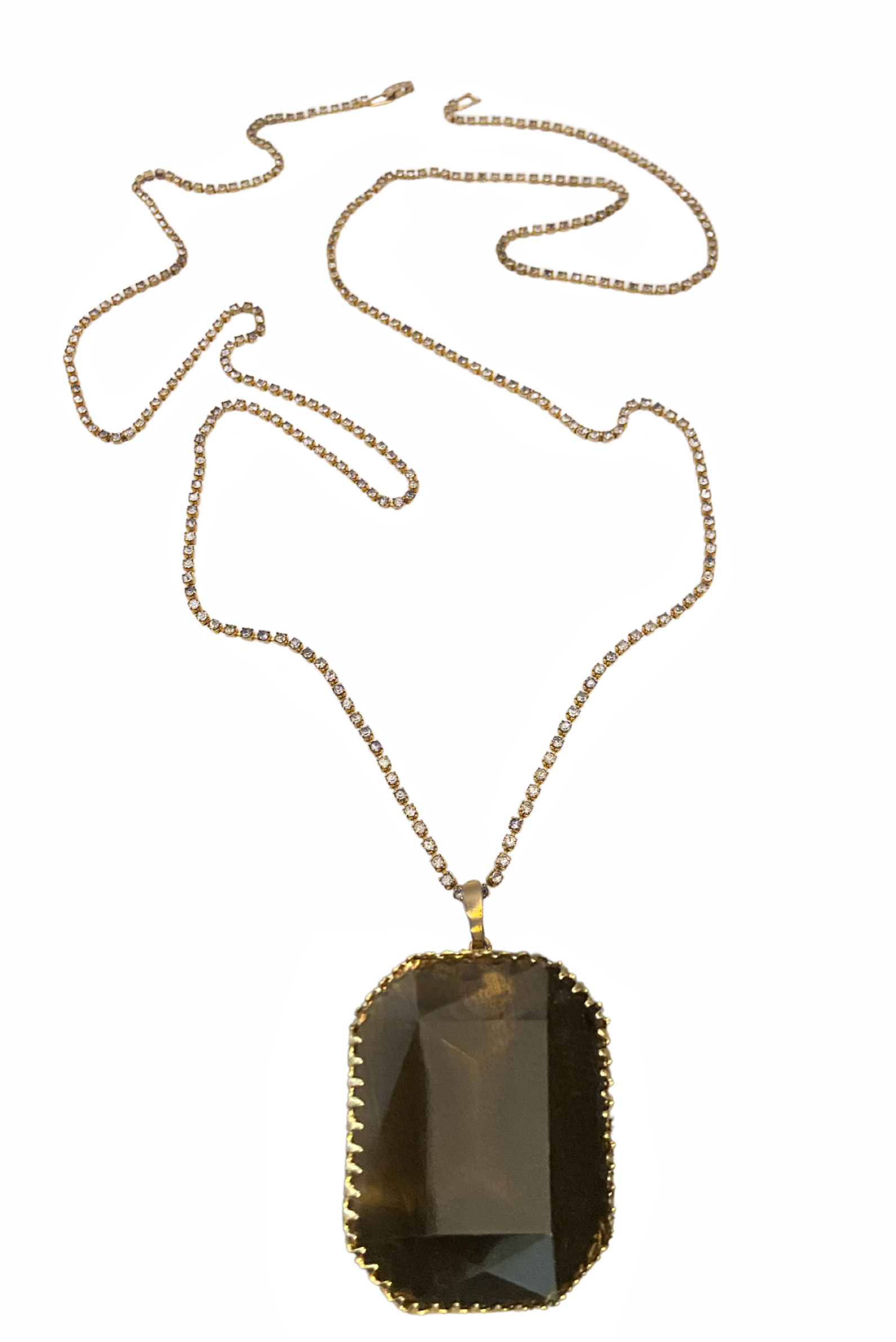 Vintage Brown Tourmaline Large Emerald Cut Pendant On Long Gold Diamond Necklace