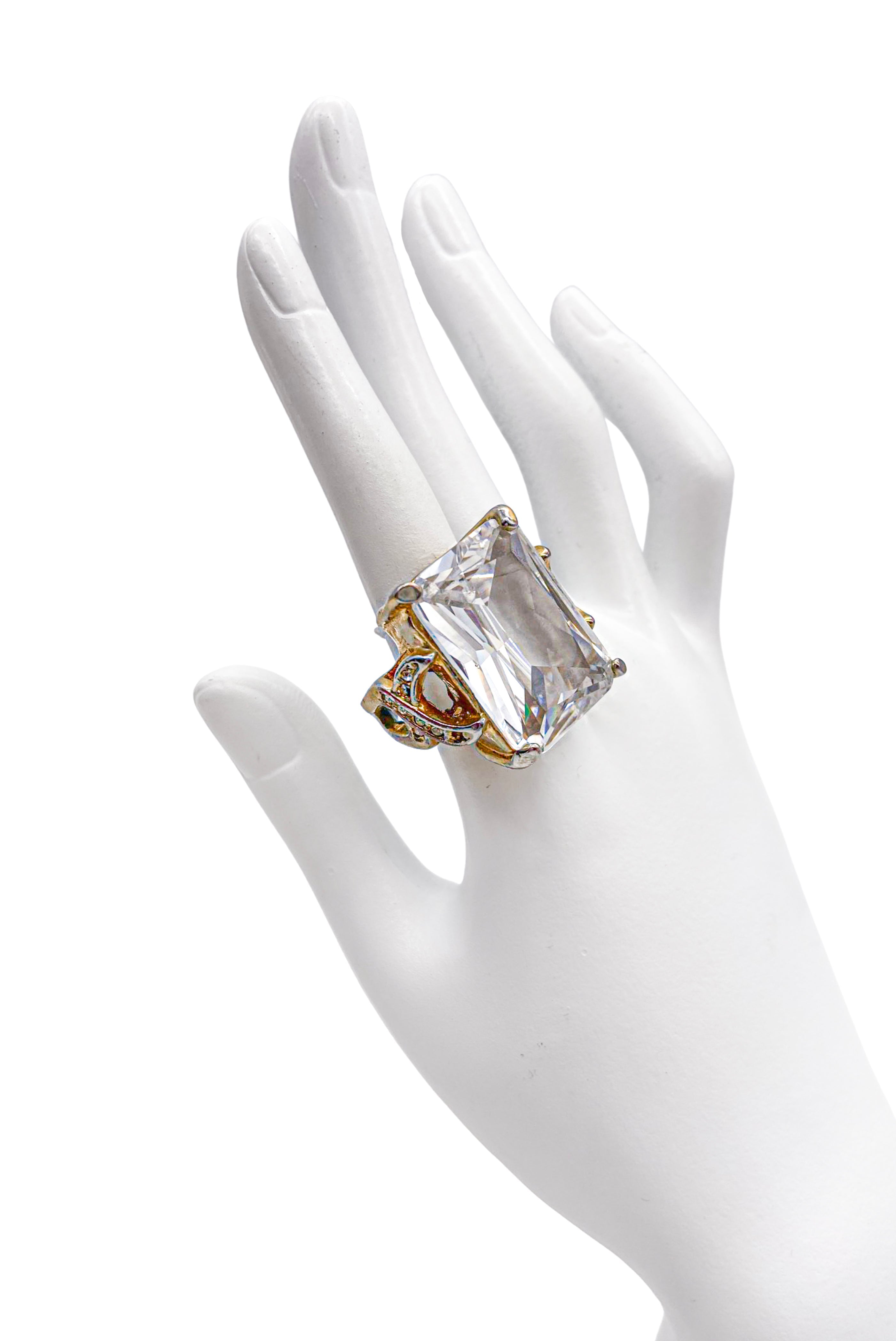 A vintage massive clear crystal diamond costume cocktail ring set in a gold-tone setting. The estate ring has small crystals on the side of the ring.