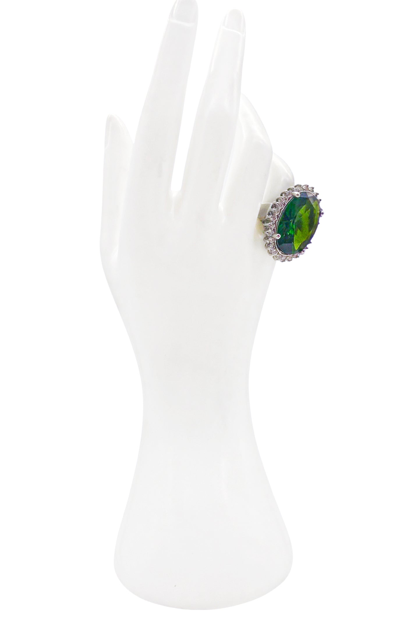 Vintage Emerald Green Silver Oval Diamond Framed Cocktail Ring