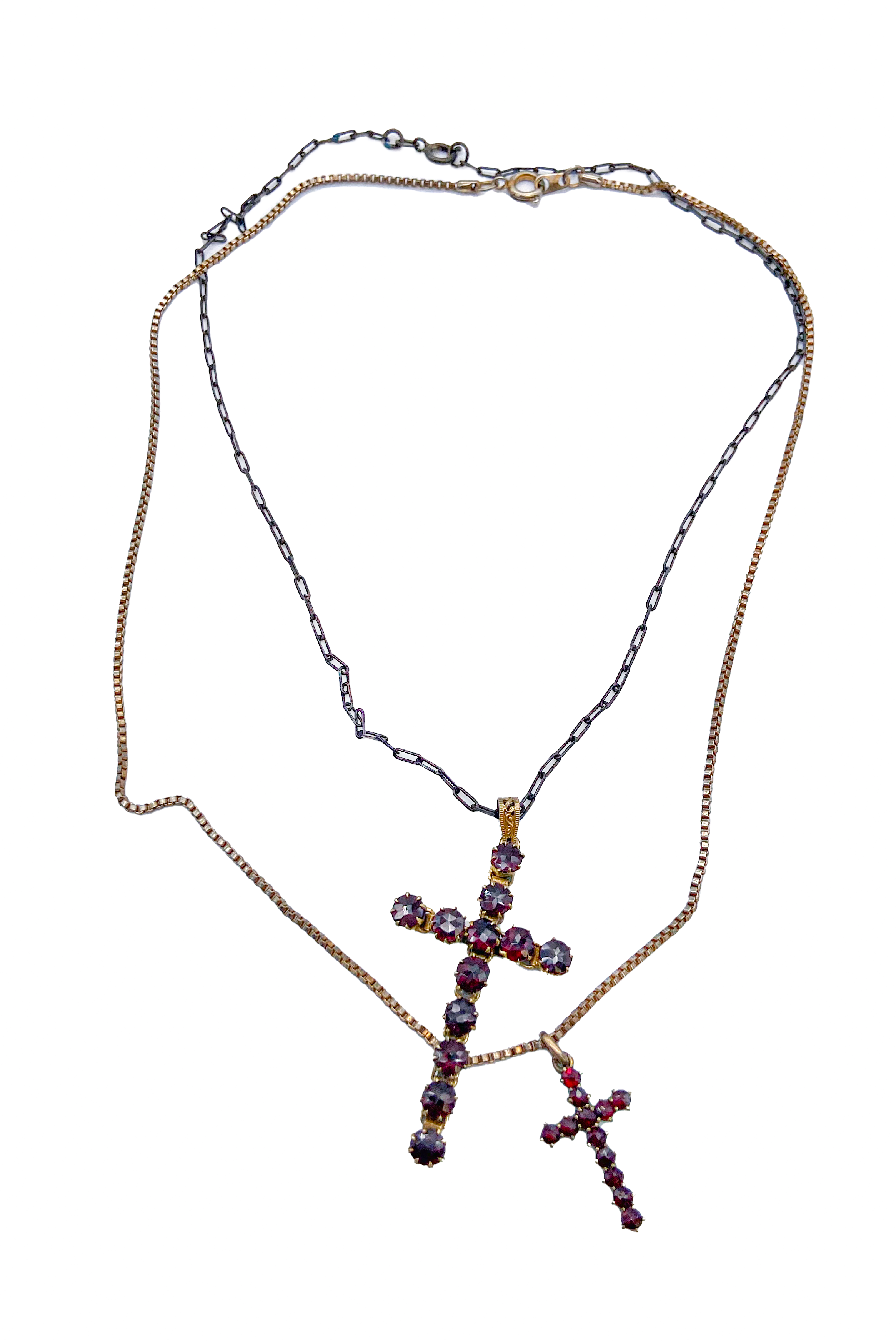 A set of two vintage garnet cross necklaces - a medium and a mini small one.
