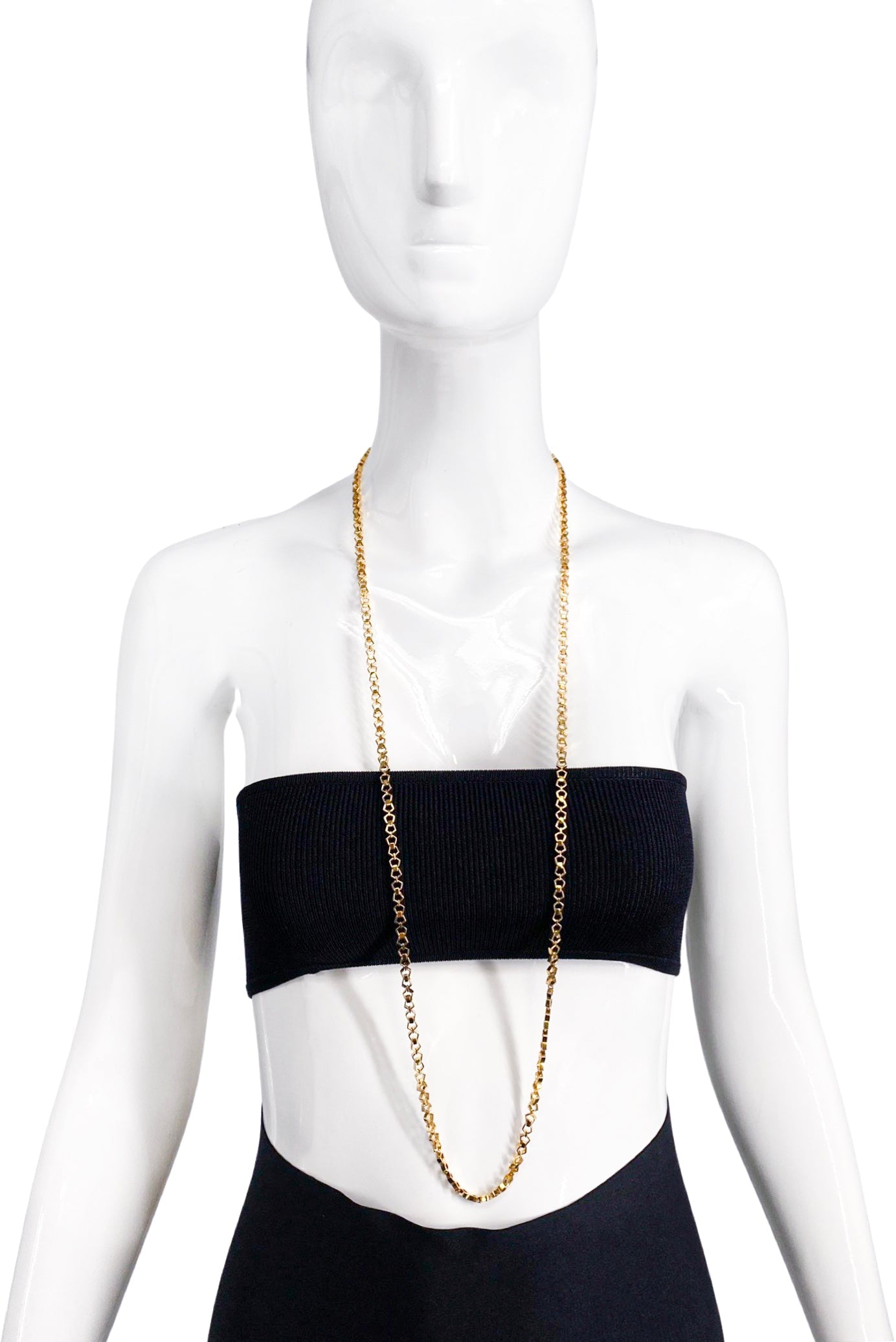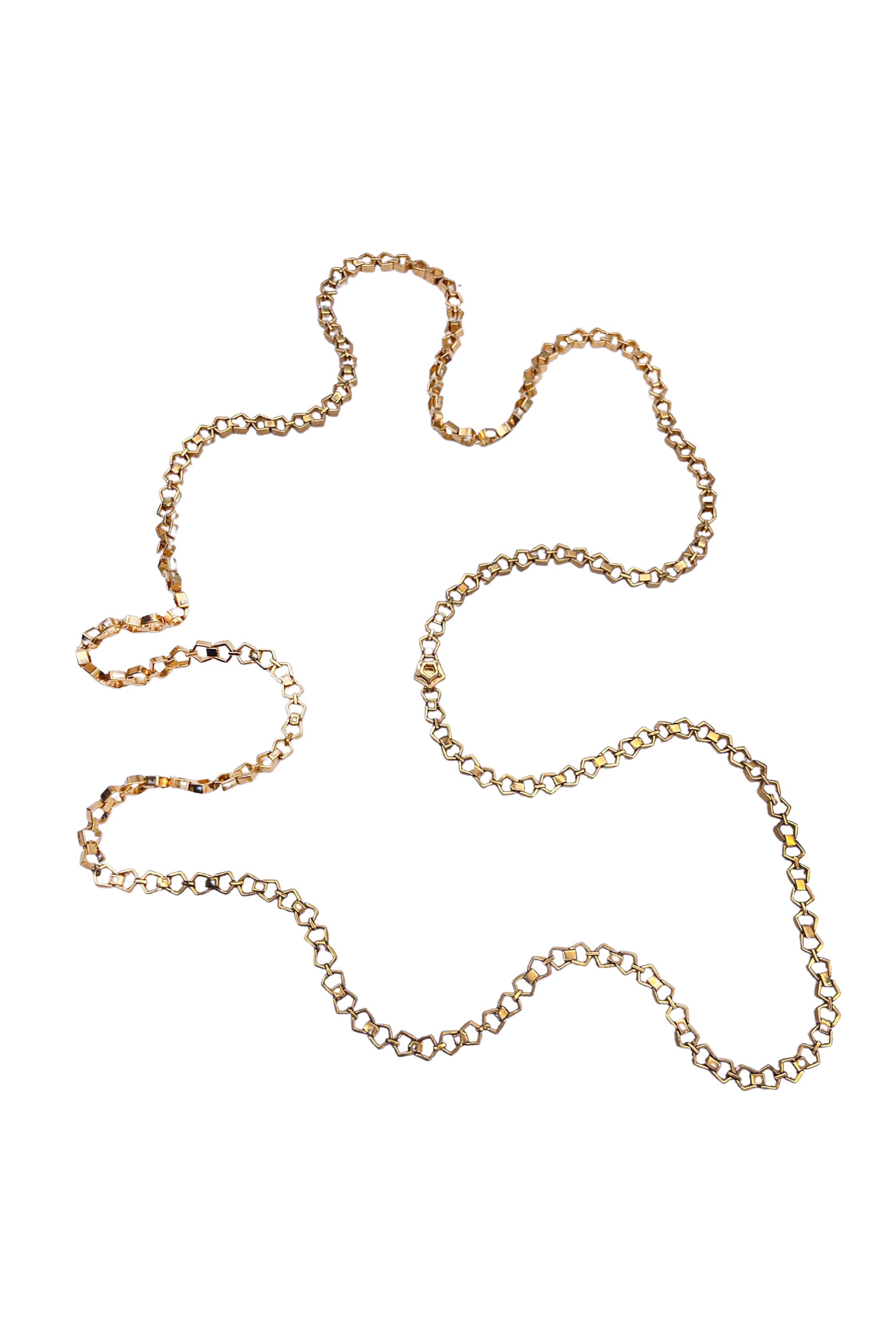 A vintage gold chain necklace composed of delicate hexagon shaped chain links.