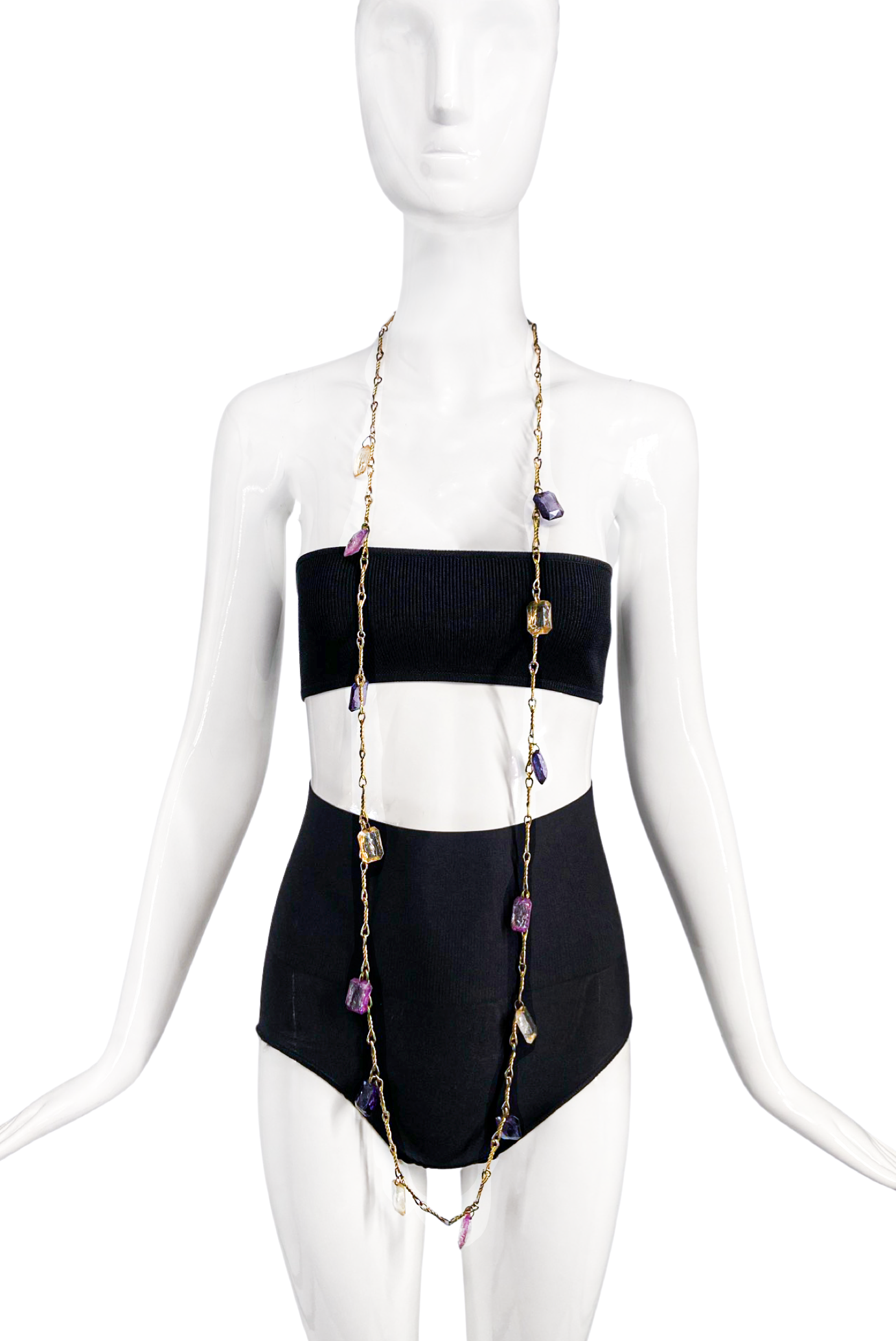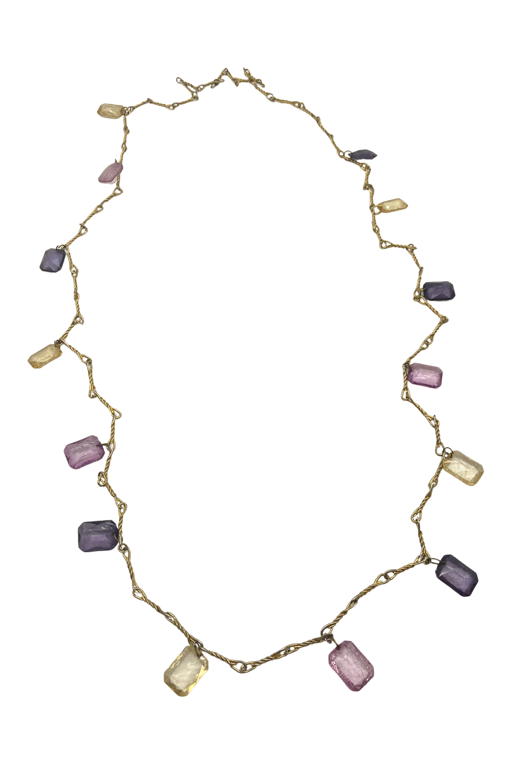 Vintage Gold Long Chain Necklace with Faux Amethyst Amber Rose Quartz Gem Stones