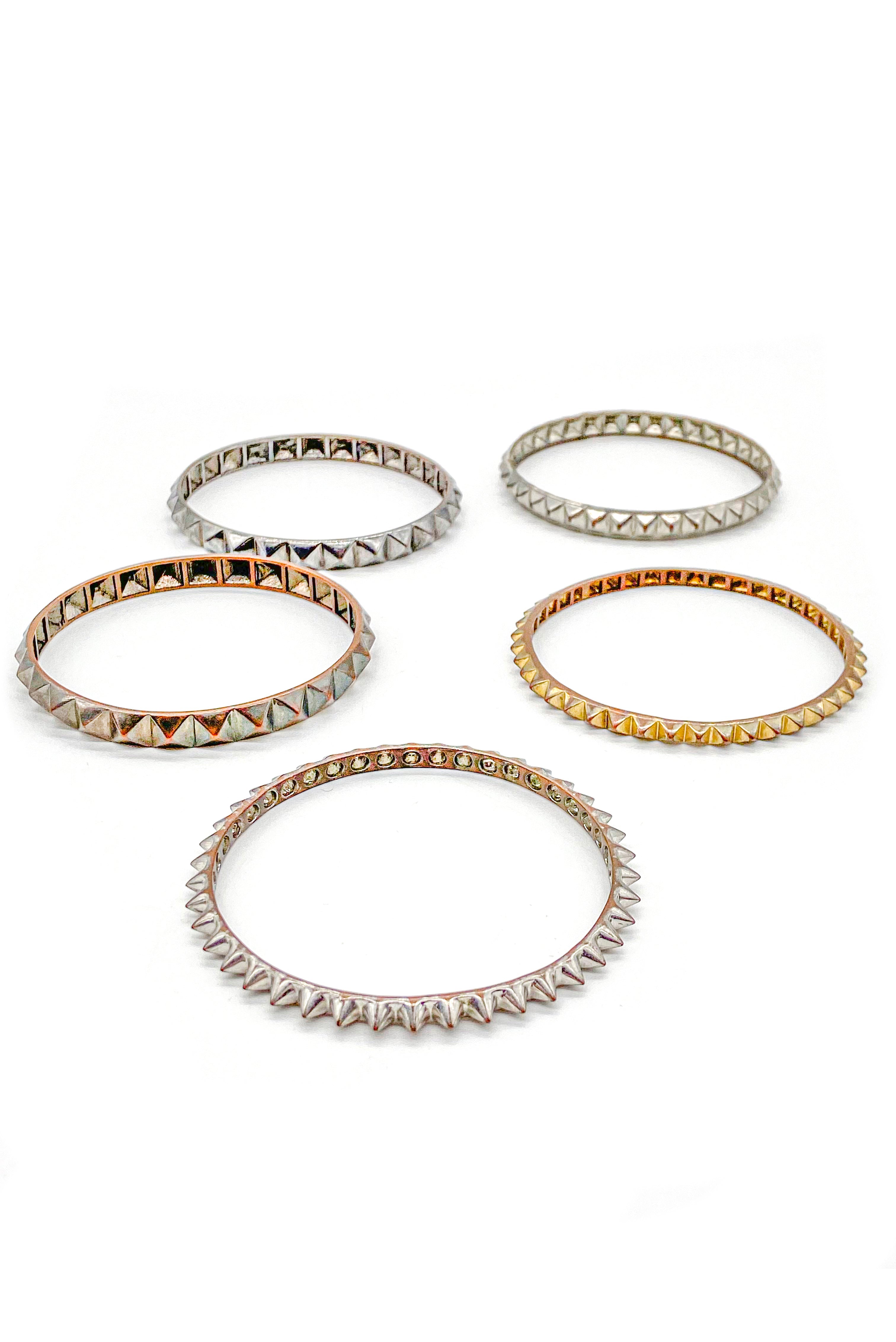 A collection of vintage metal bangles with with raised spike stud details on each bangle. The collection of bangles has that early 1980's Madonna "Holiday" era feel. The collection is composed of five separate bangles.