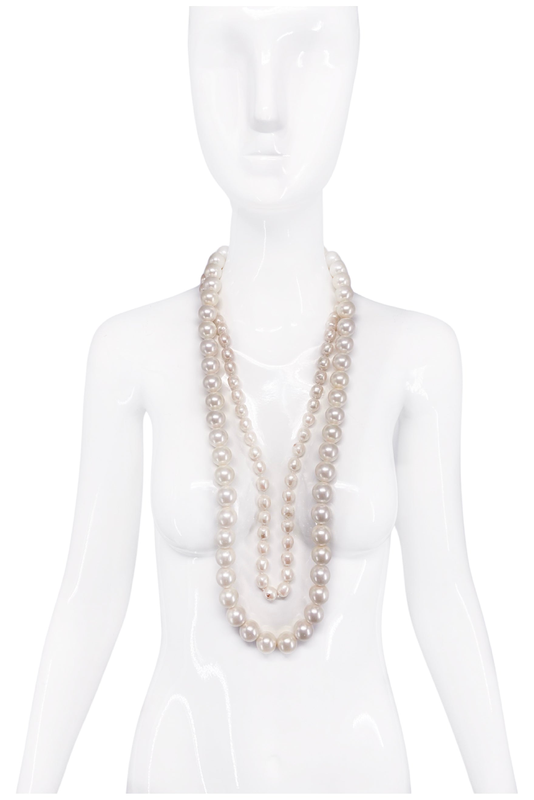 A vintage costume pearl necklace with a gold clasp.