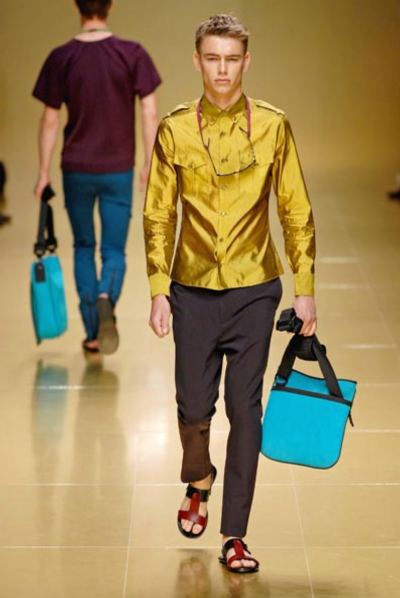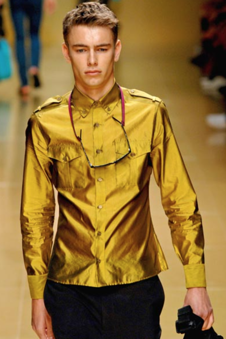 A Burberry Prorsum Menswear golden yellow military style button-up shirt with two pockets on the front and epaulet details at the shoulder. From the Burberry Prorsum by Christopher Bailey Menswear Spring / Summer 2008 collection Look 15.