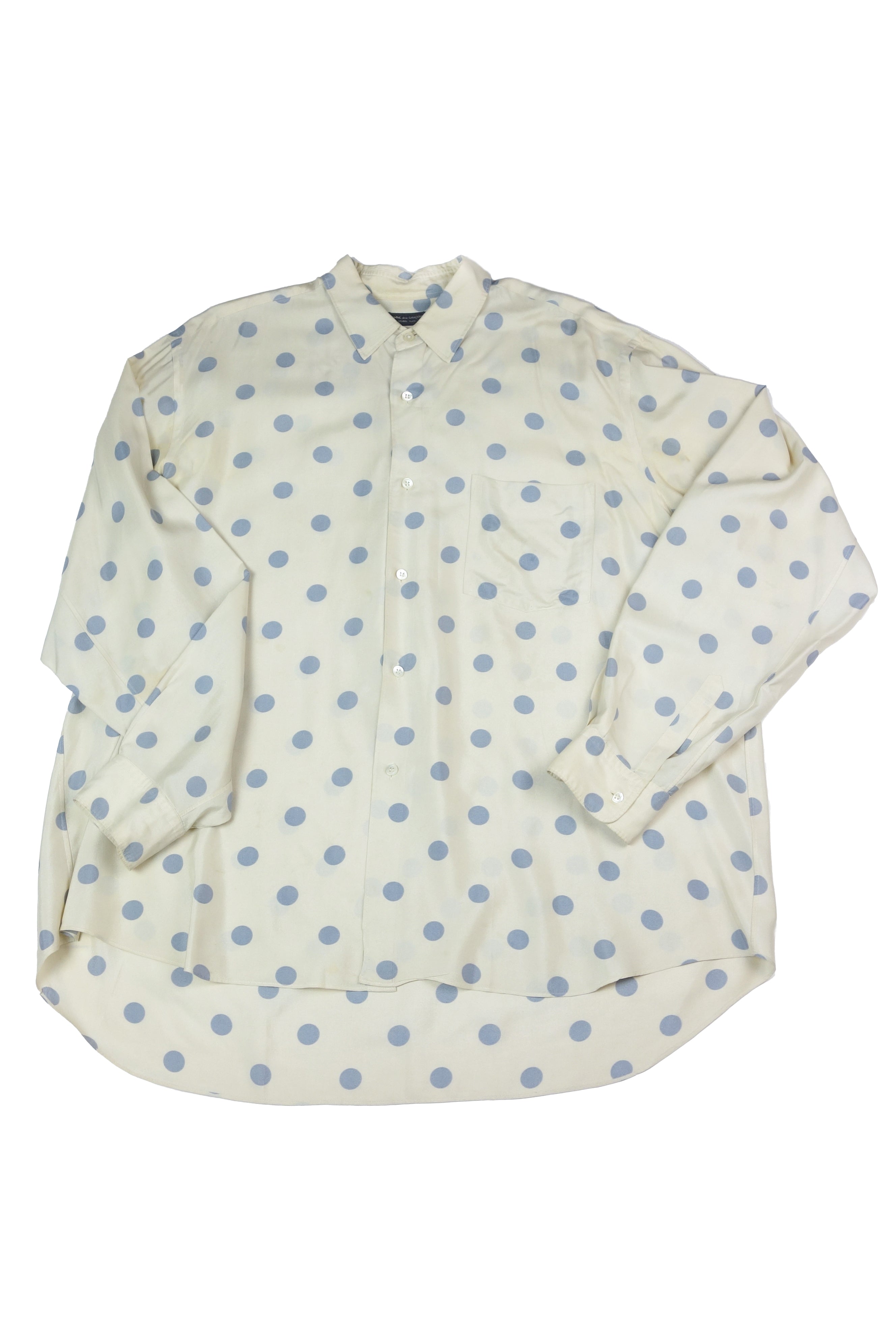 A Comme des Garçons ivory overysize button-up menswear shirt with a light azure blue polka dot pattern. The shirt is an oversize fit with white pearlescent buttons down the front of the shirt and one button closure at each cuff.