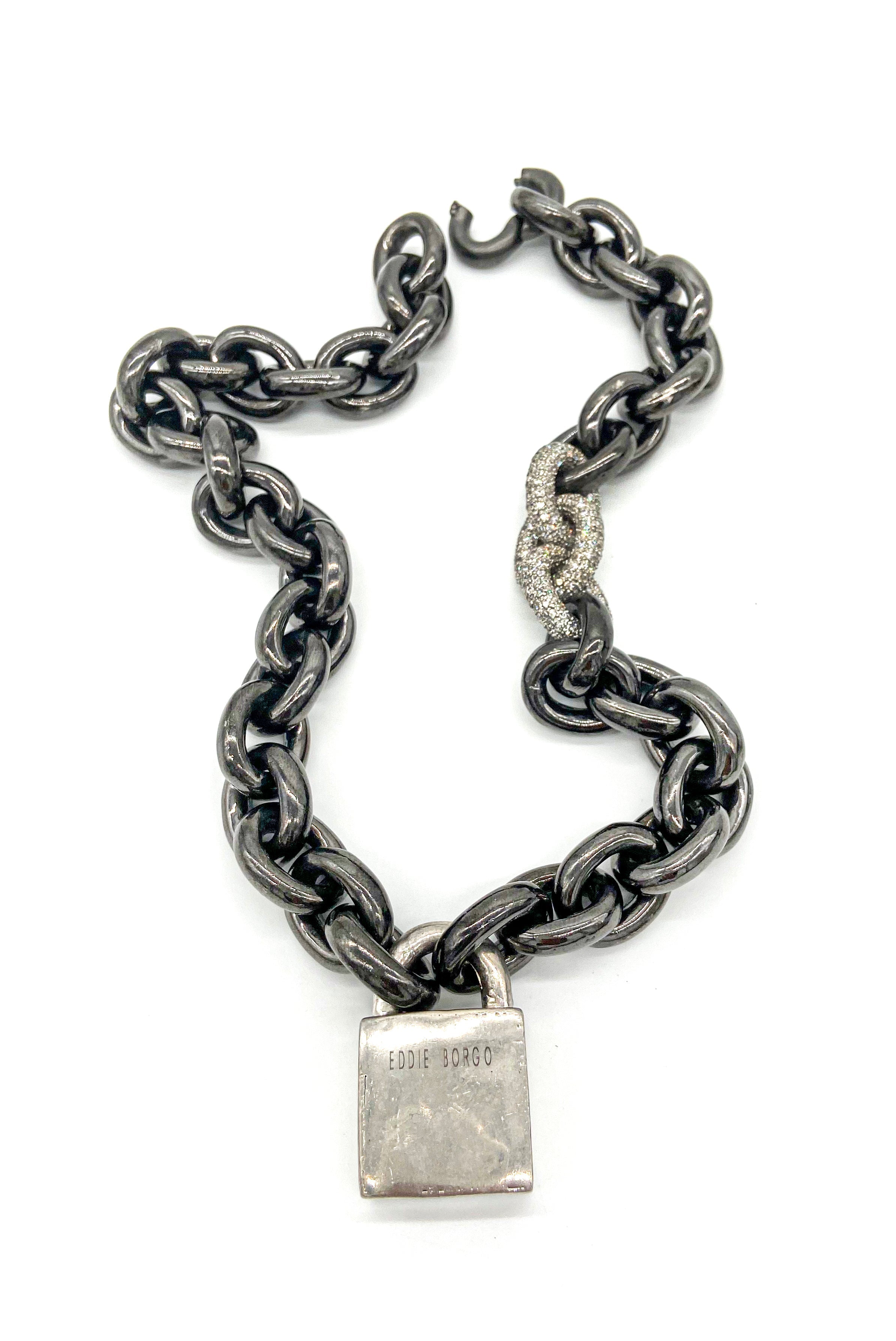 Eddie Borgo medium sized gunmetal chain necklace with two chain links covered in pavé crystals.The necklace holds a gunmetal padlock pendent that is stamped Eddie Borgo. Necklace has a clasp that is removable.