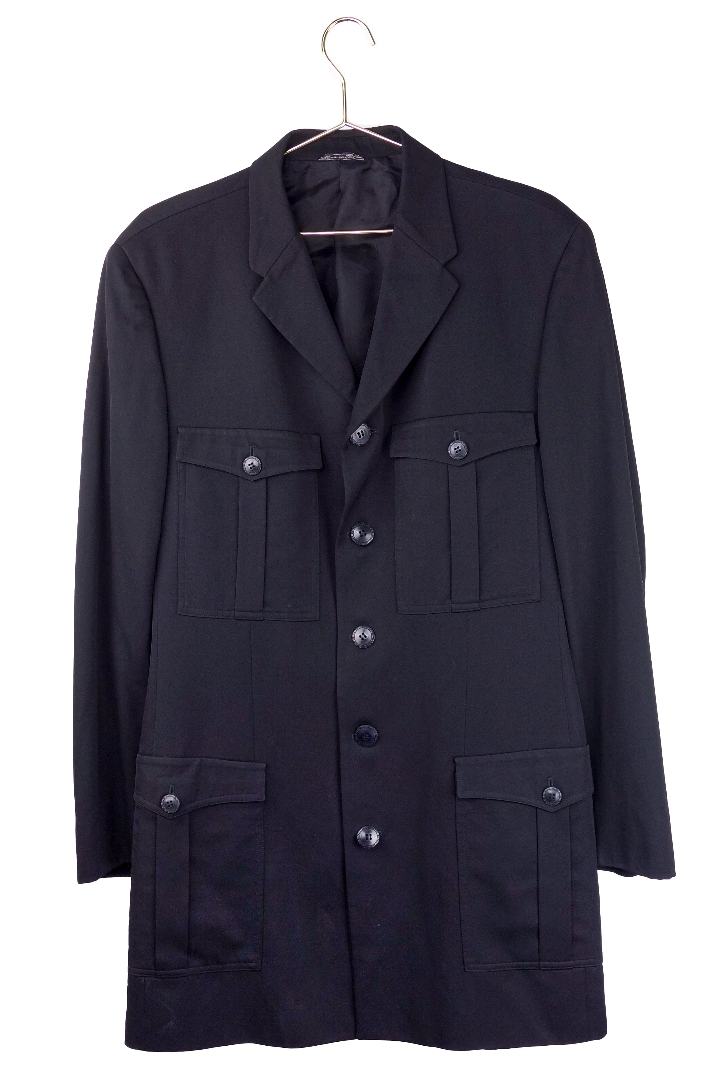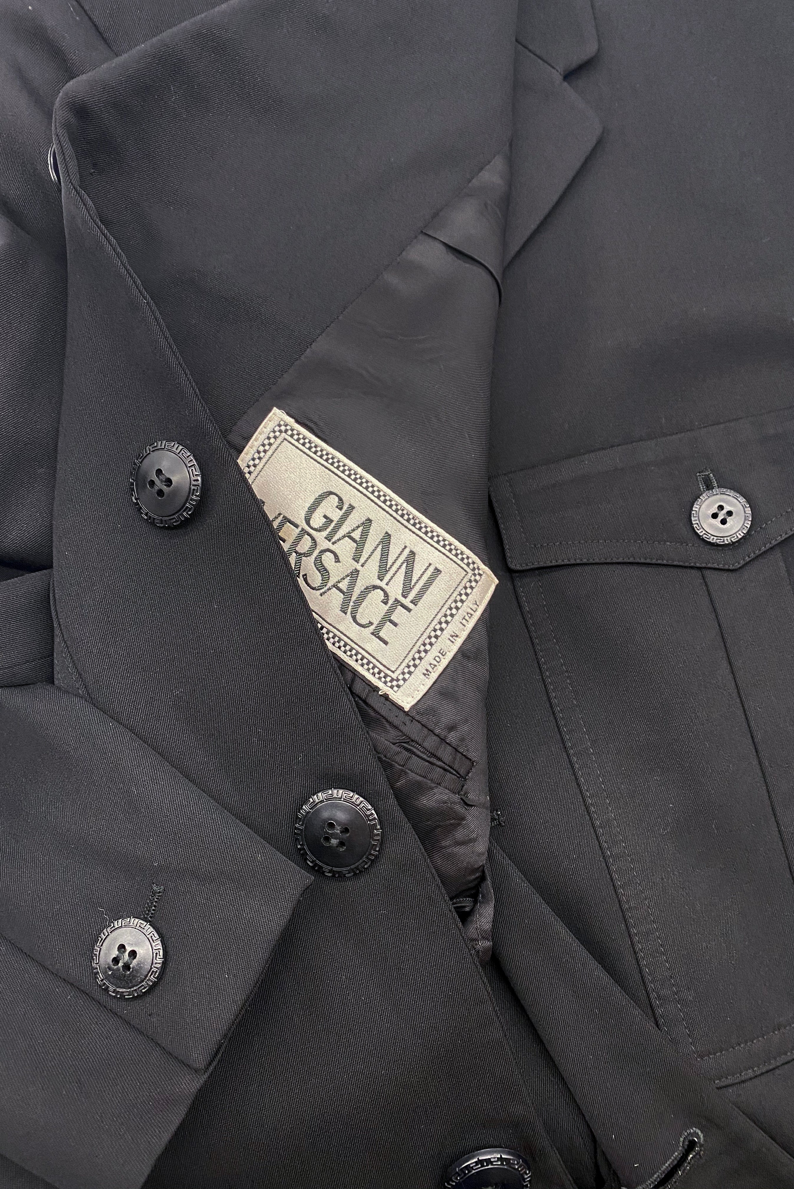 A Gianni Versace menswear label black four pocket military "officer" coat. The single breasted jacket has a notched lapel and five black buttons down the front of the jacket all engraved with the iconic Versace greek key geometric design. The four flap pockets have the greek key patterned buttons with each pocket having a box pleat detail.