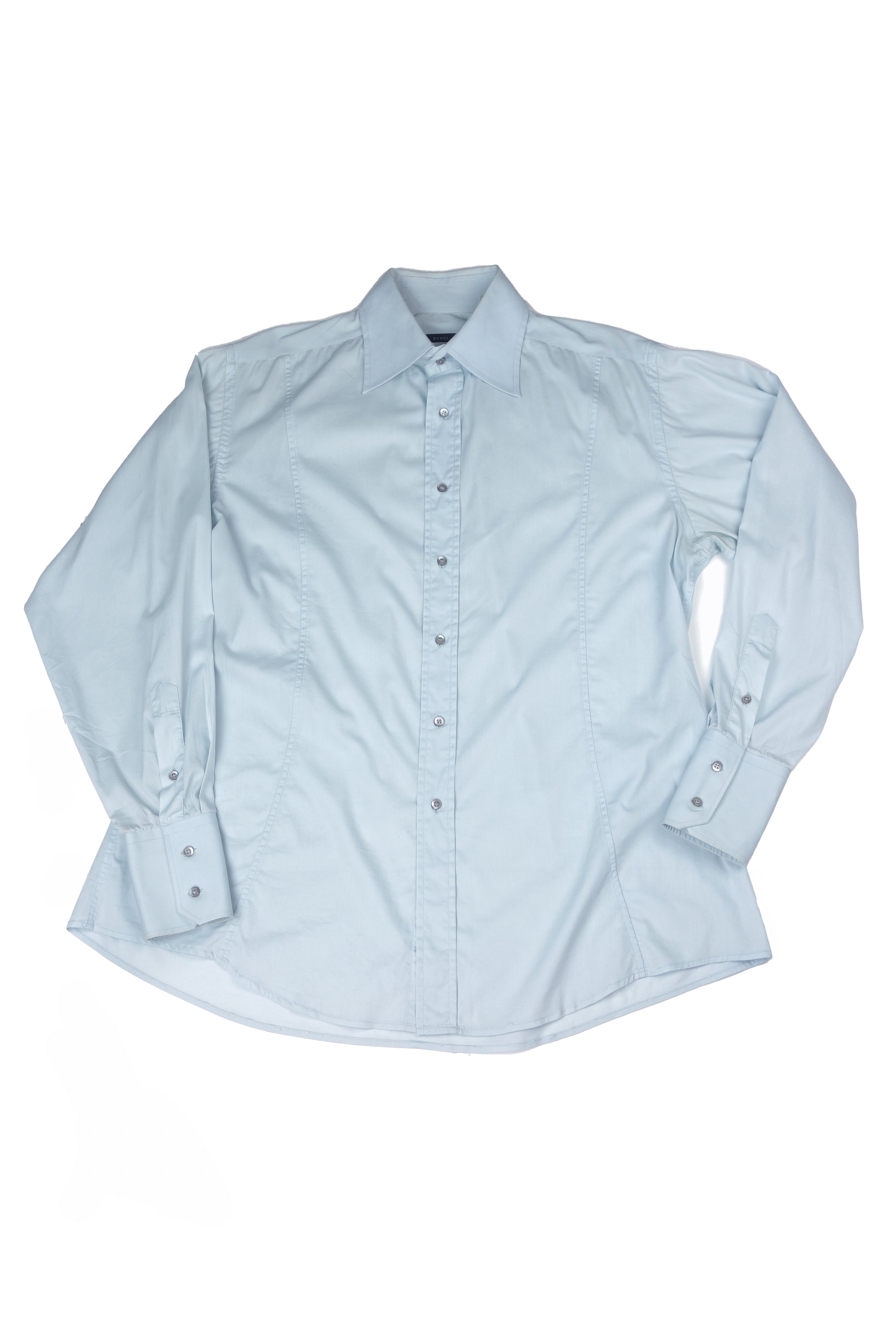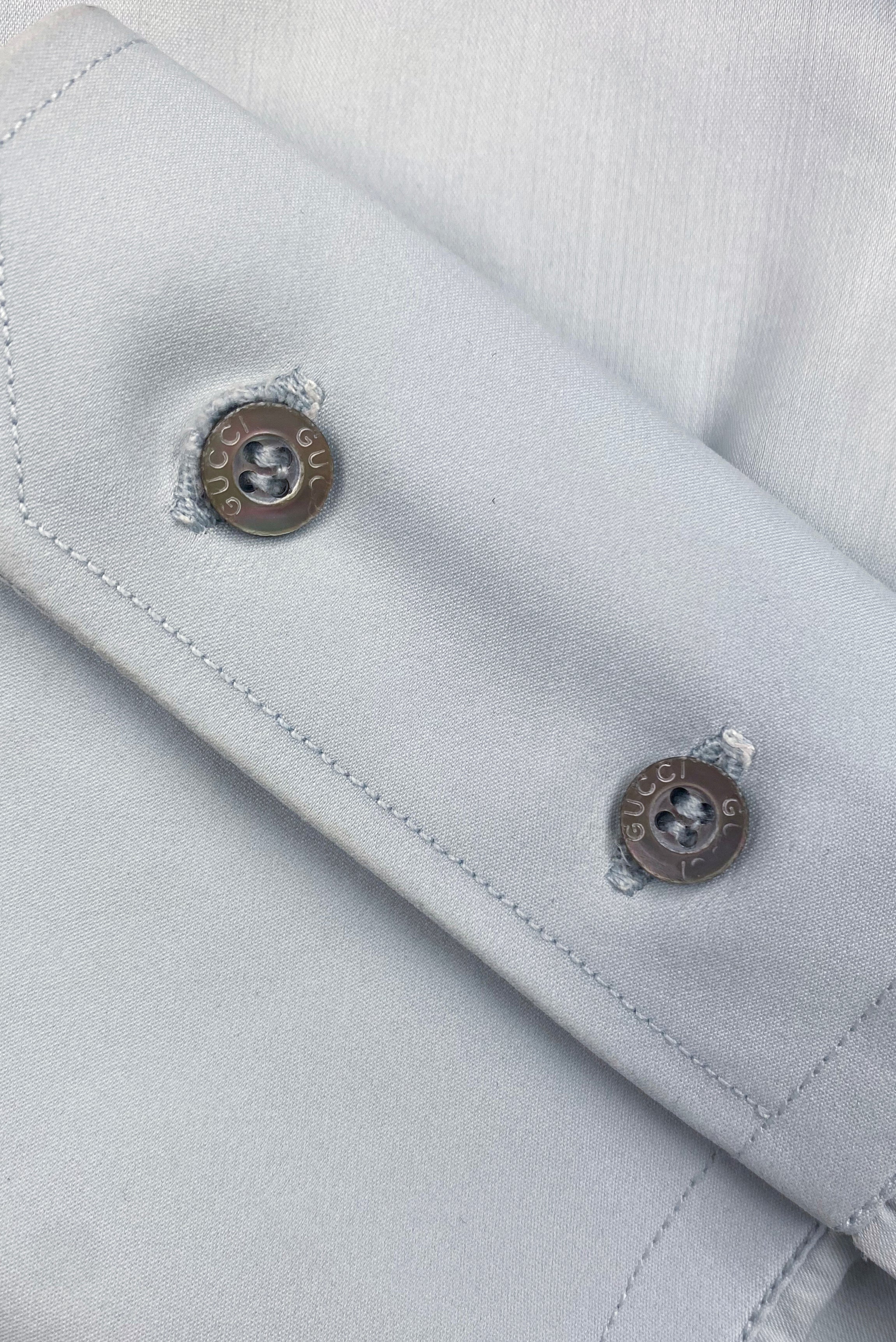 A Gucci Menswear baby blue cotton button-up shirt. The shirt has a 70's leisure suit style collar and has a fitted construction. The grey opalescent buttons are stamped Gucci with oversize cuffs.