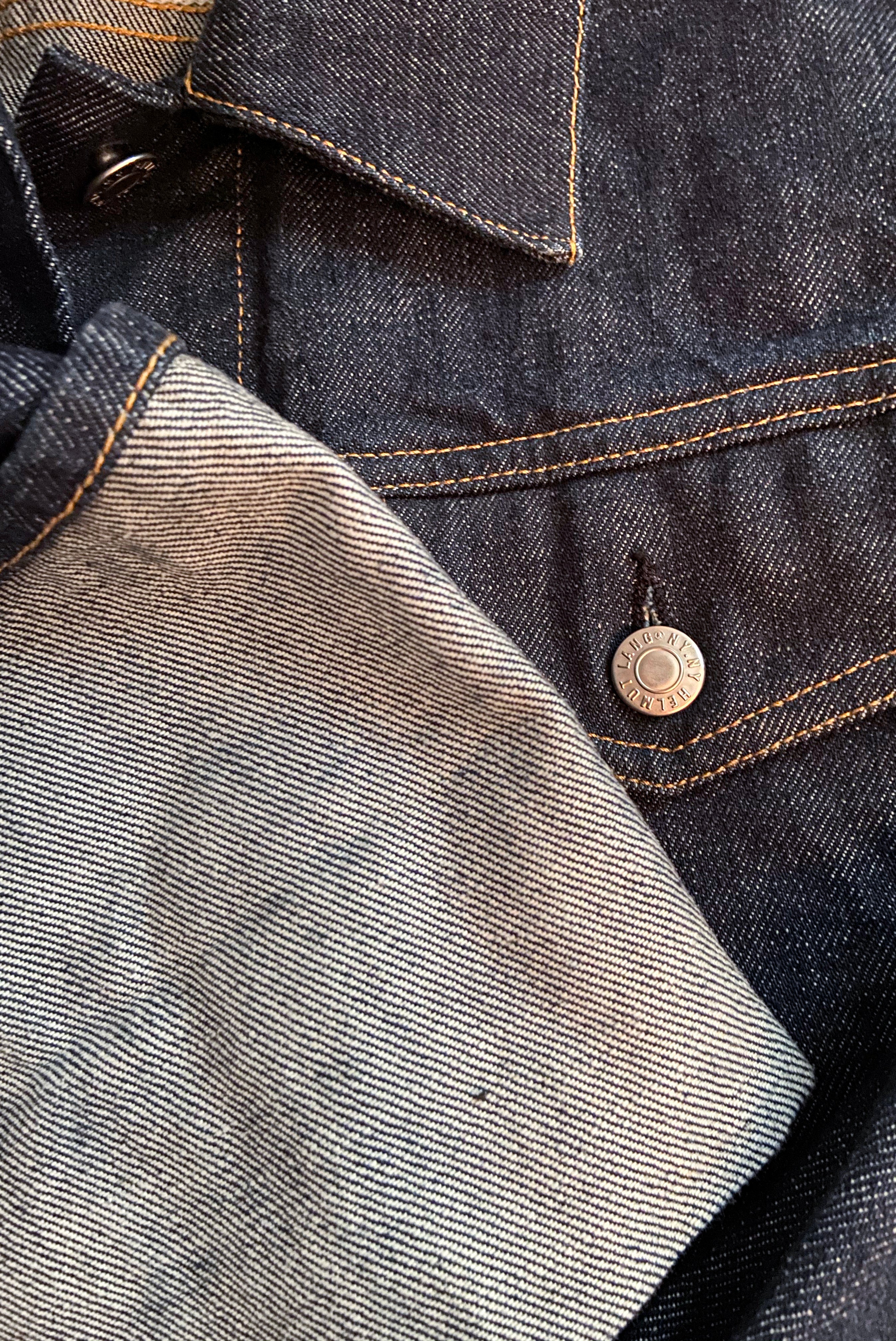 A Helmut Lang blue denim jacket with the iconic over-exaggerated flipped sleeve cuffs. The jacket has silver buttons down the front with Helmut Lang stamped onto them.
