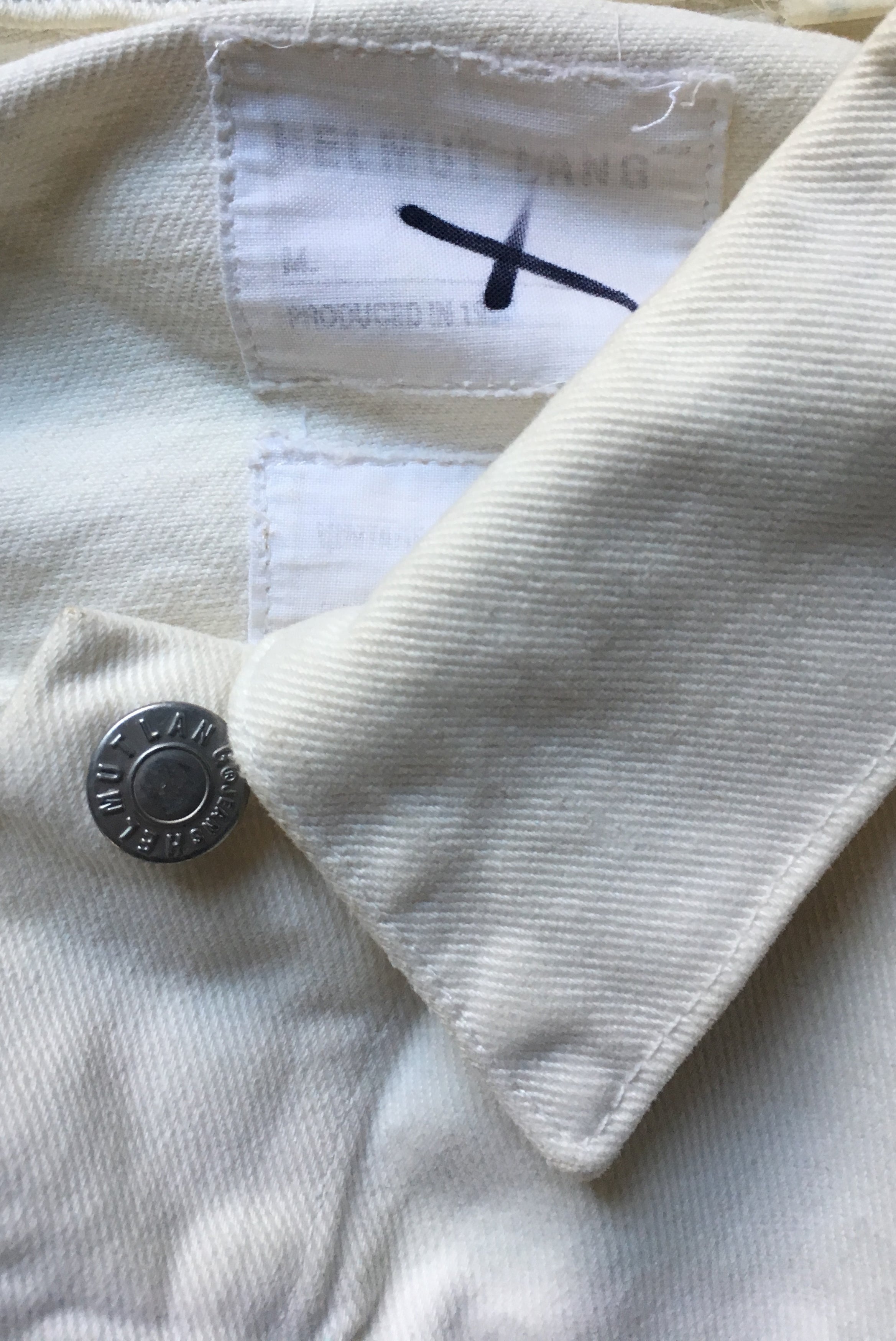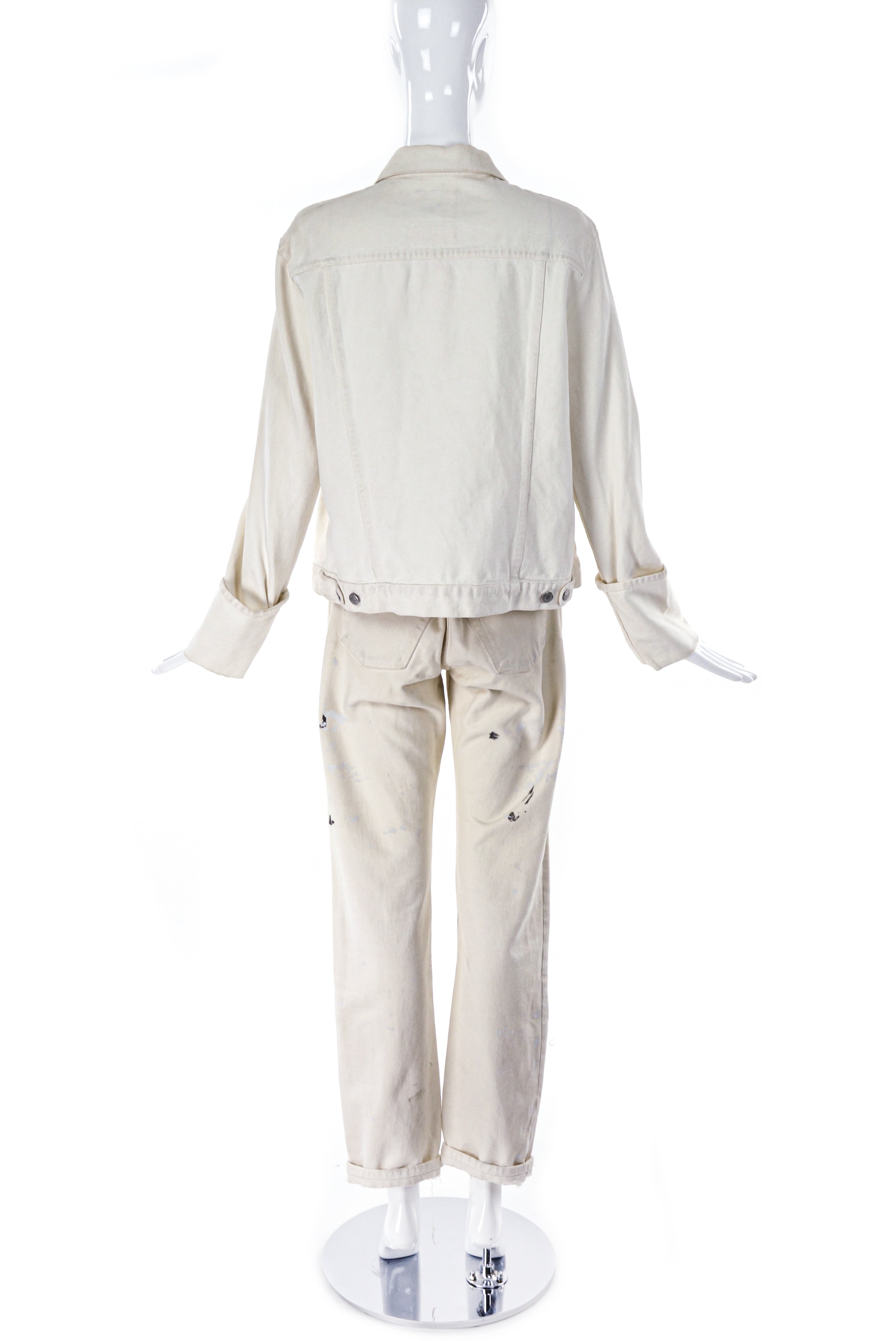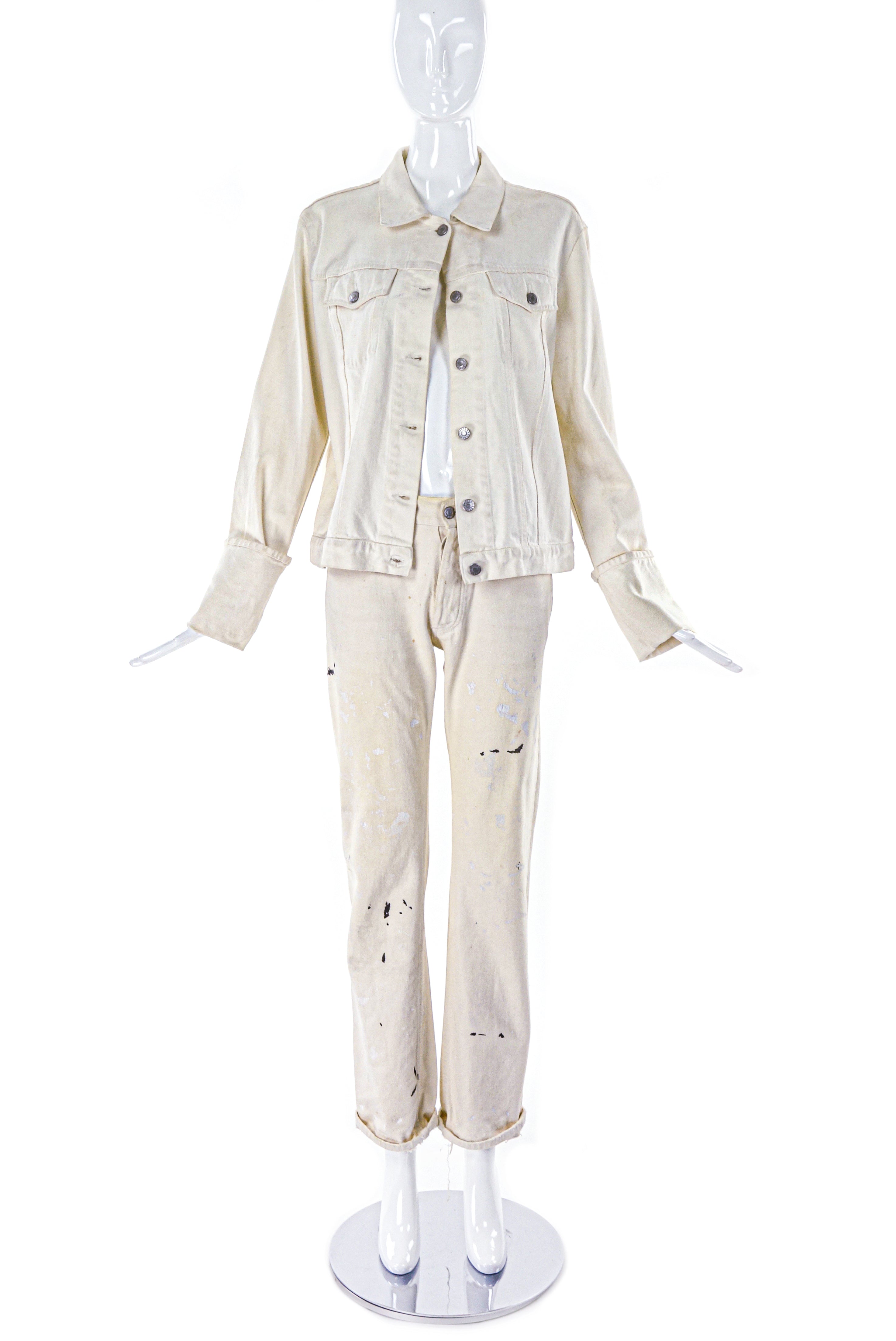 A set of Helmut Lang pieces from the Spring / Summer 1998 Collection. The ivory denim cotton jacket and straight leg trouser have the iconic paint splatter associated with the famous SS1998 collection. The jacket has the classic Helmut Lang oversized sleeve cuffs.