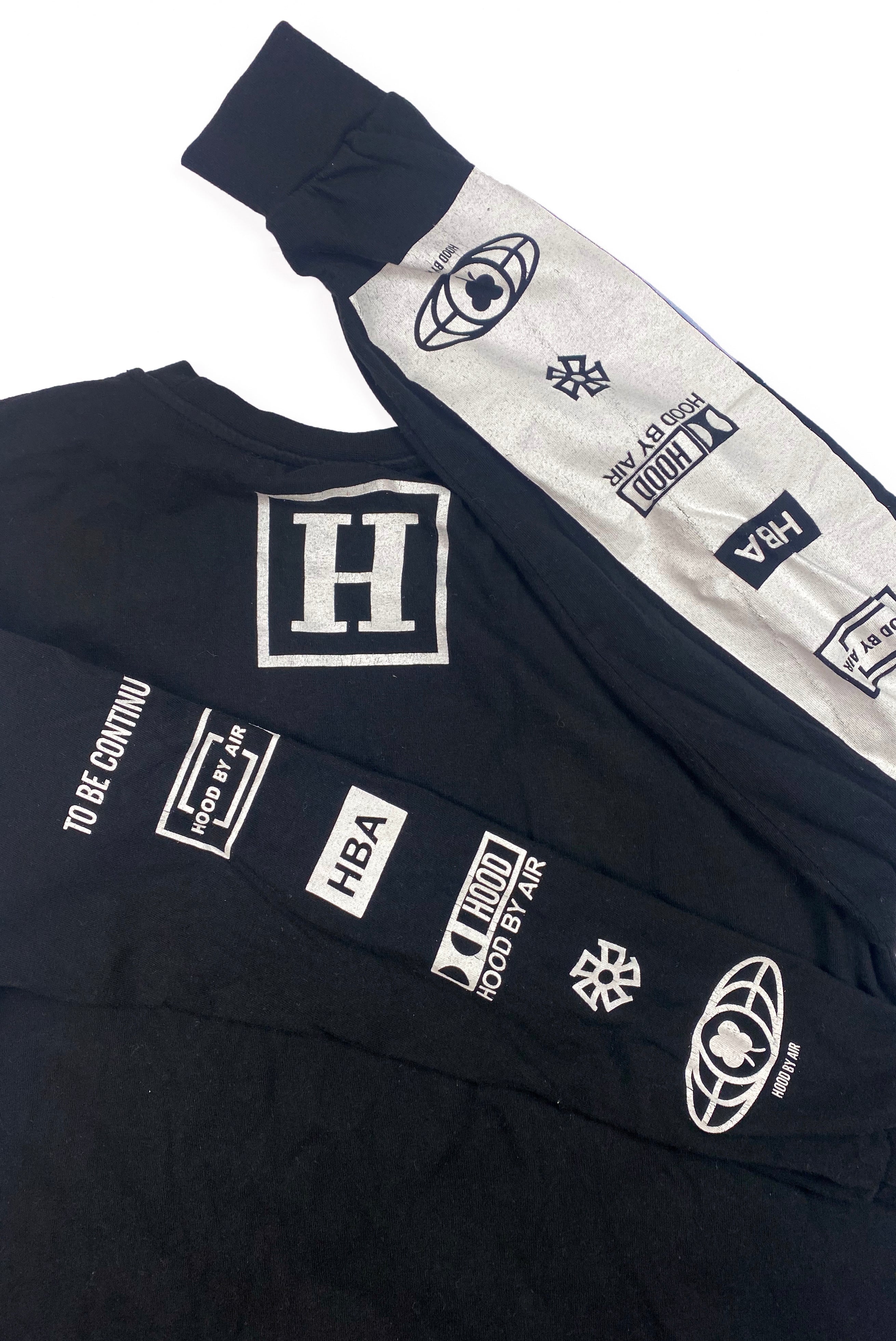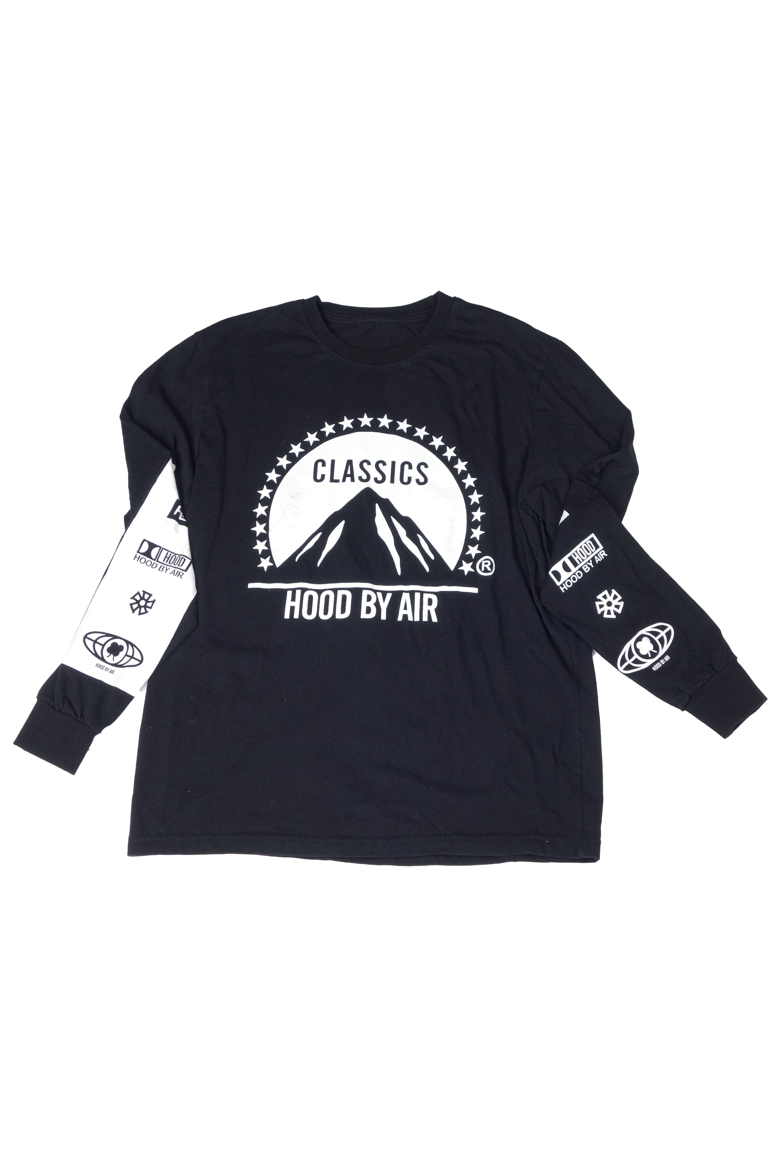 A Hood by Air black cotton with white "Paramount Classics" logo long sleeve t-shirt. The long sleeves of the t-shirt have white screen print details and rib knit cuffs.
