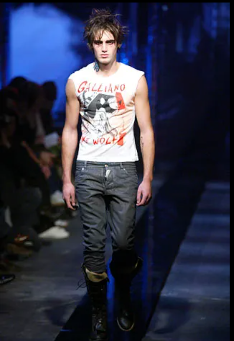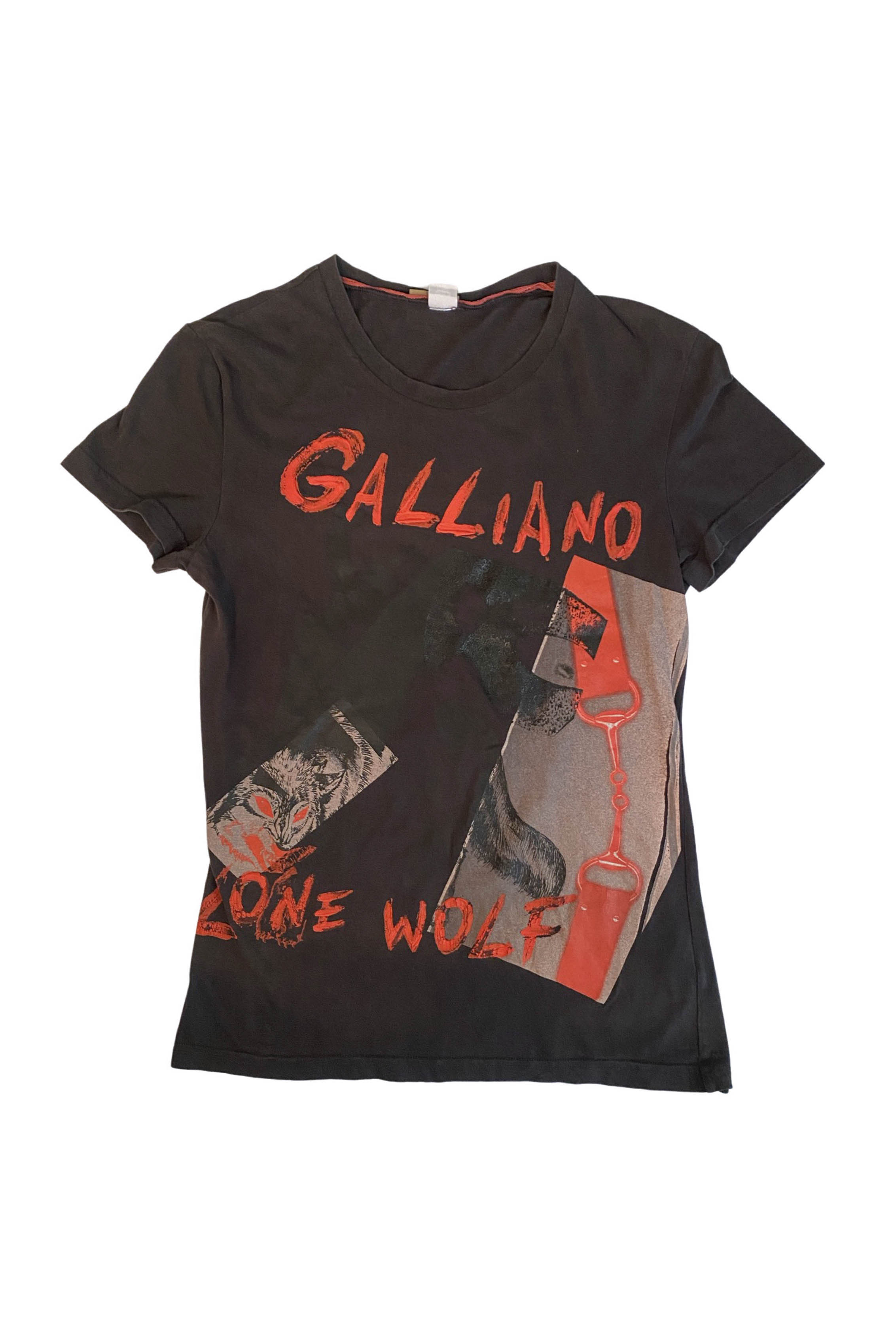 A John Galliano black cotton short sleeve t-short with red and grey paint detailing and "Lone Wolf" and "Galliano" printed on the shirt in a textured paint detail. From the John Galliano Menswear Spring / Summer 2001 ready-to-wear collection.