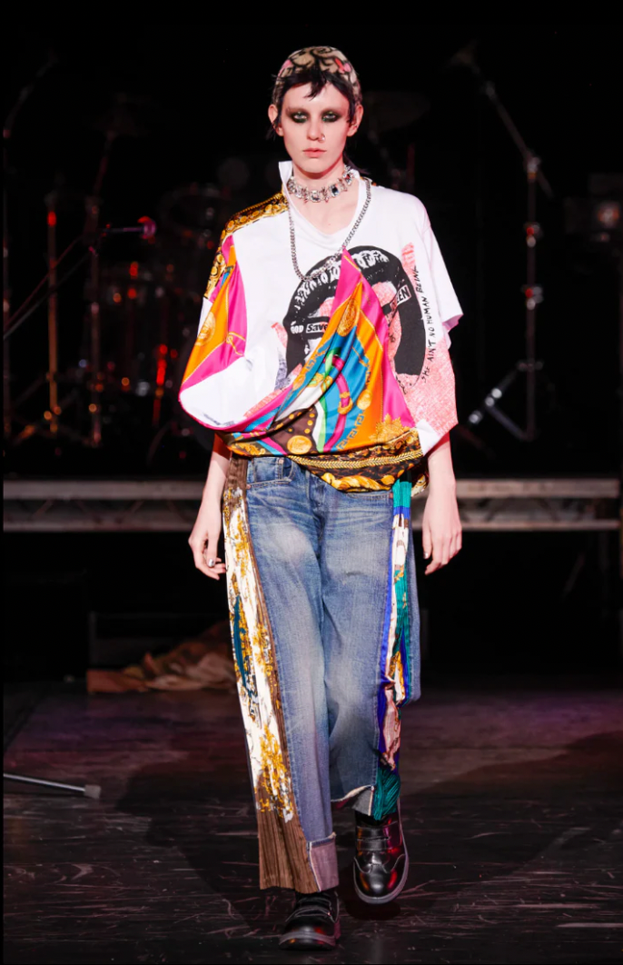 Junya Watanabe Multicolor Print Silk Scarf "God Save the Queen Deconstructed T-Shirt with Silver Chain Detail FW2021