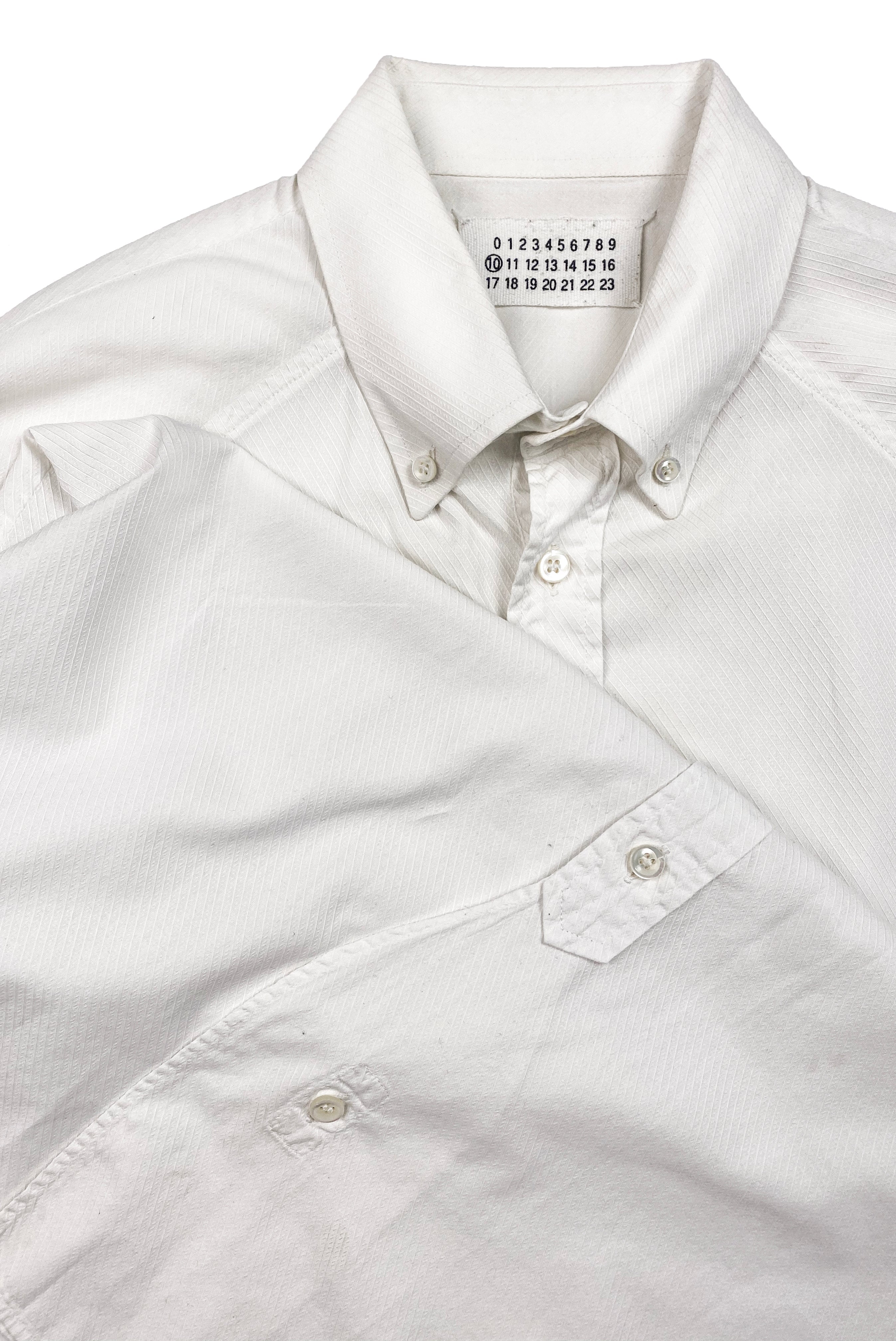 A Maison Margiela menswear classic textured white cotton button-up shirt. The collared shirt has classic dress shirt buttons going down the front to turn into a curved seam detail and a final button closure. The cuffs of the sleeve have a single button closure.