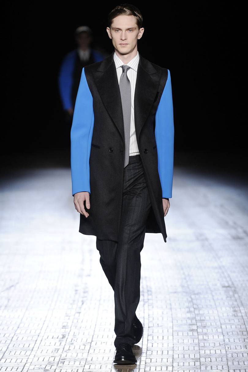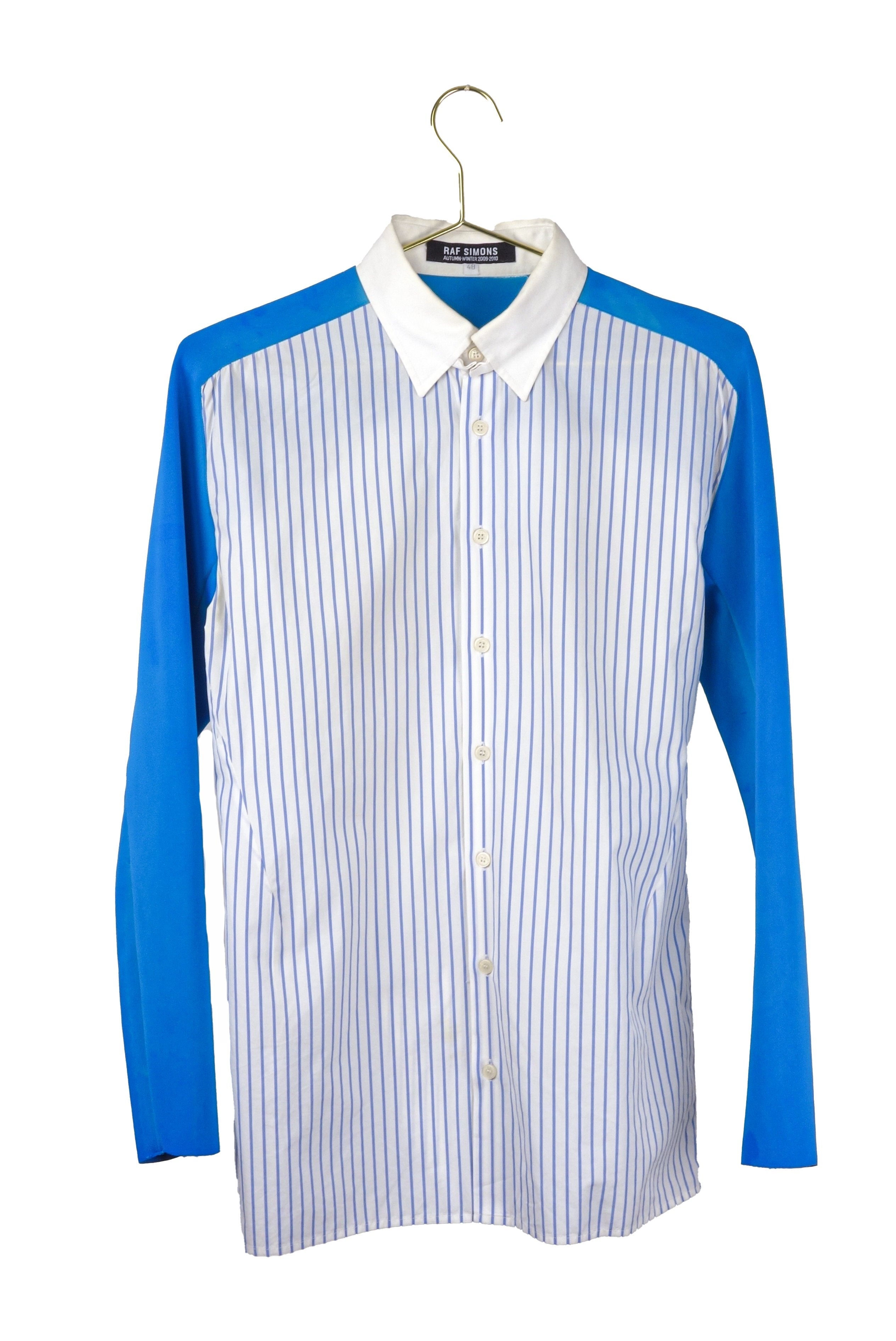 A Raf Simons pinstripe pattern cotton button-up shirt with a contrast white collar. The shirt has bright azure blue neoprene shoulder and sleeve details. From the Raf Simons Menswear Fall / Winter 2009 collection.