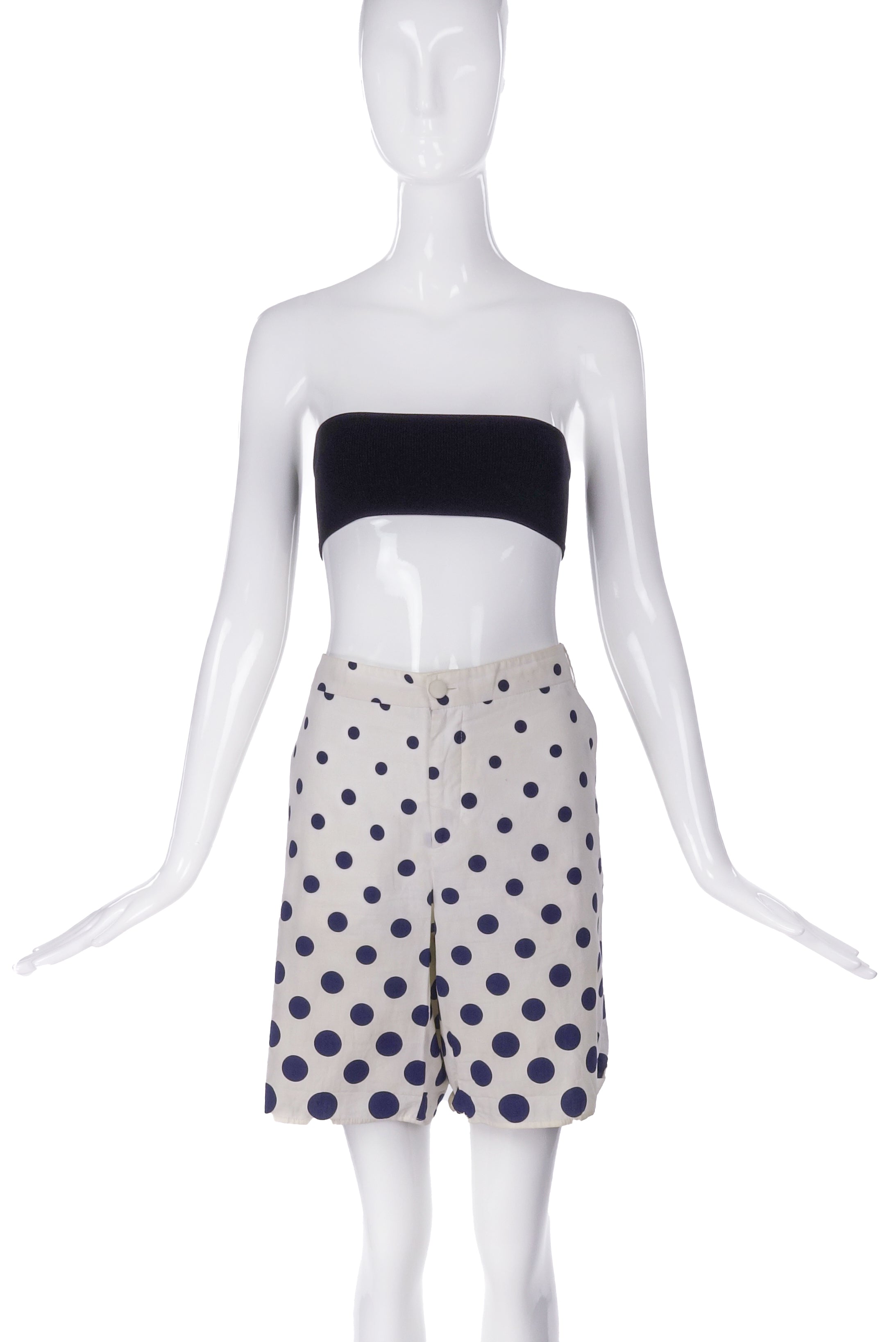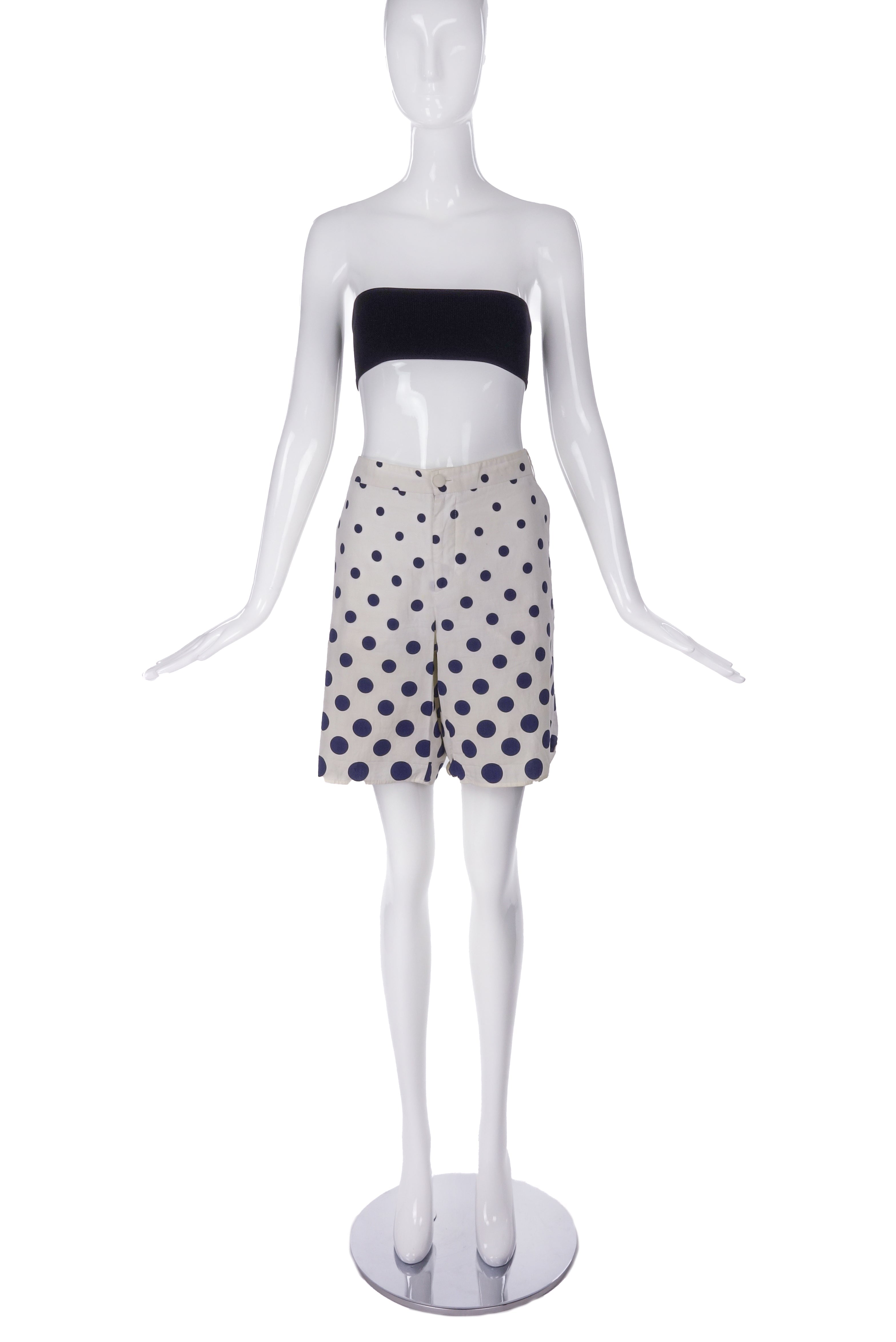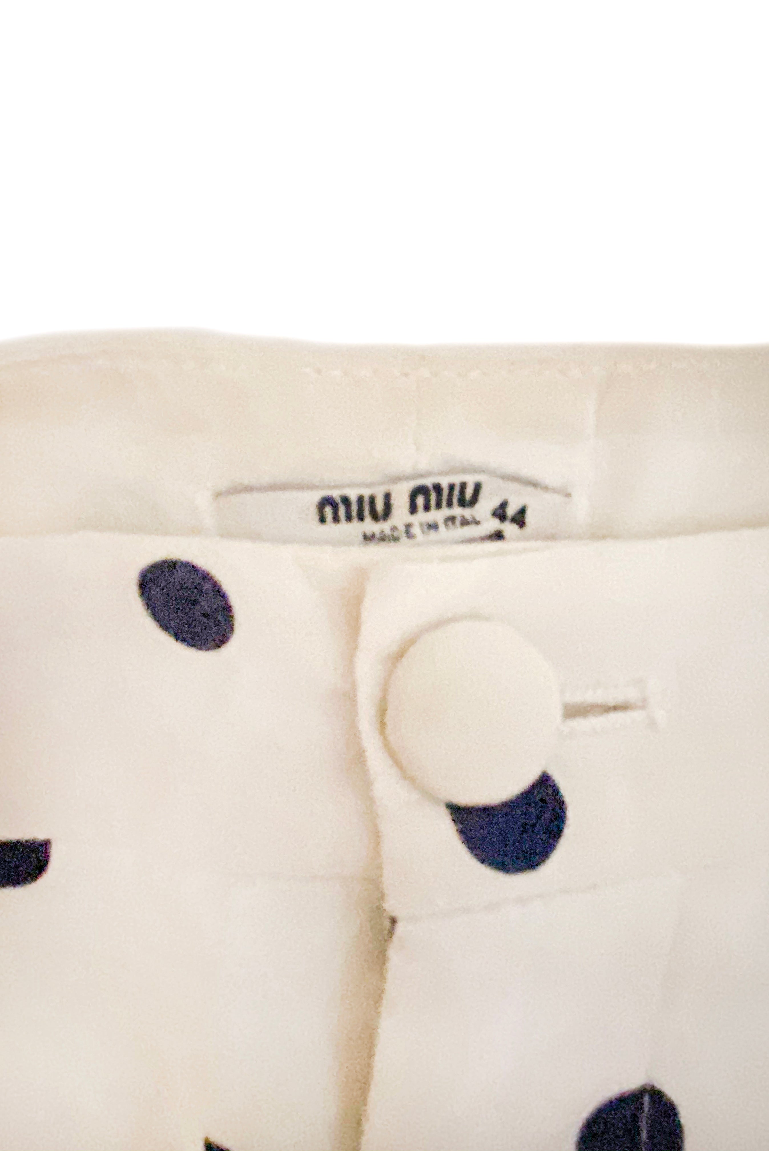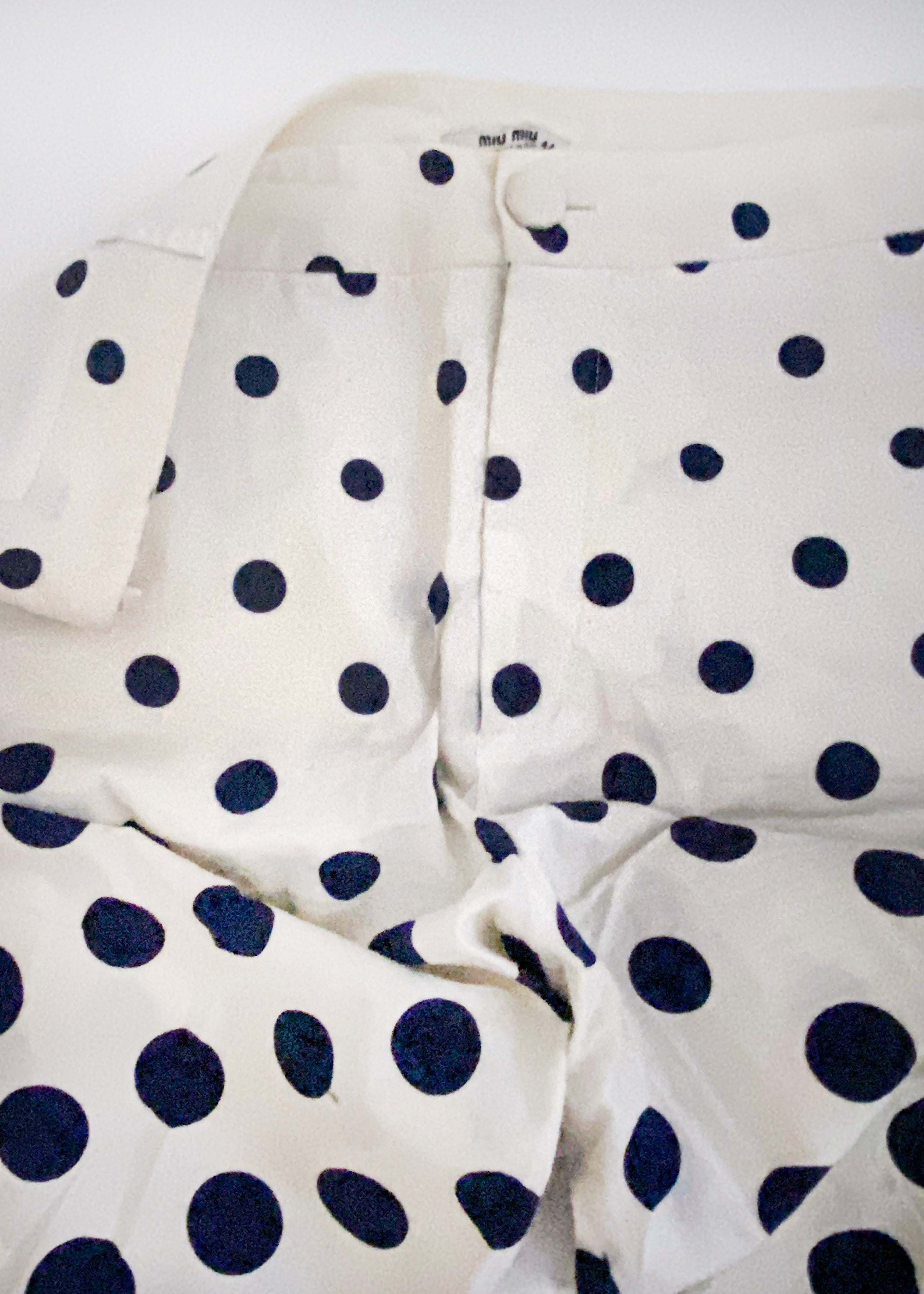 A Miu Miu white cotton Bermuda length short with blue polka dots graduating in size from large to small to create an "optical illusion" pattern. The shorts have a zipper and a white button closure in the front.