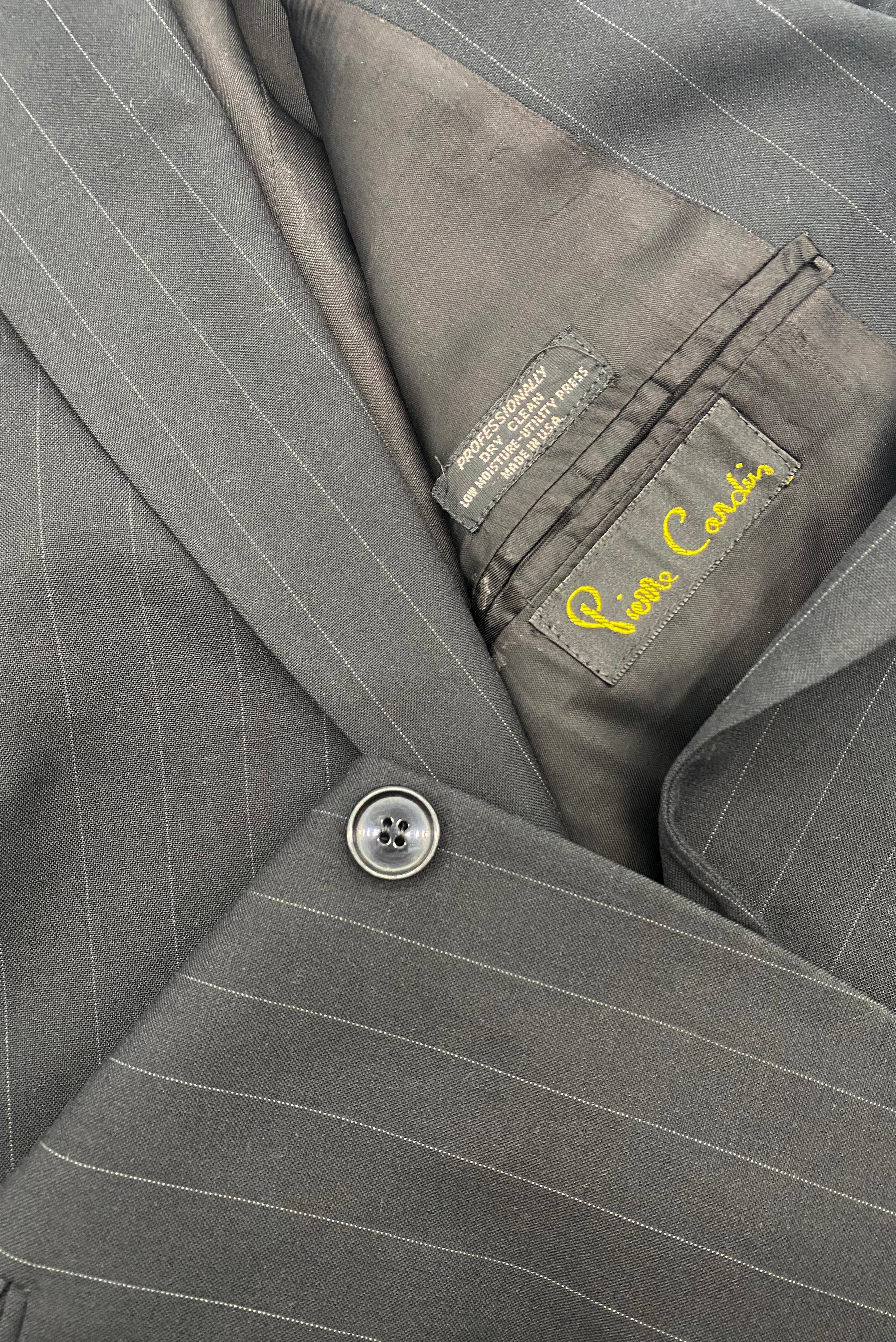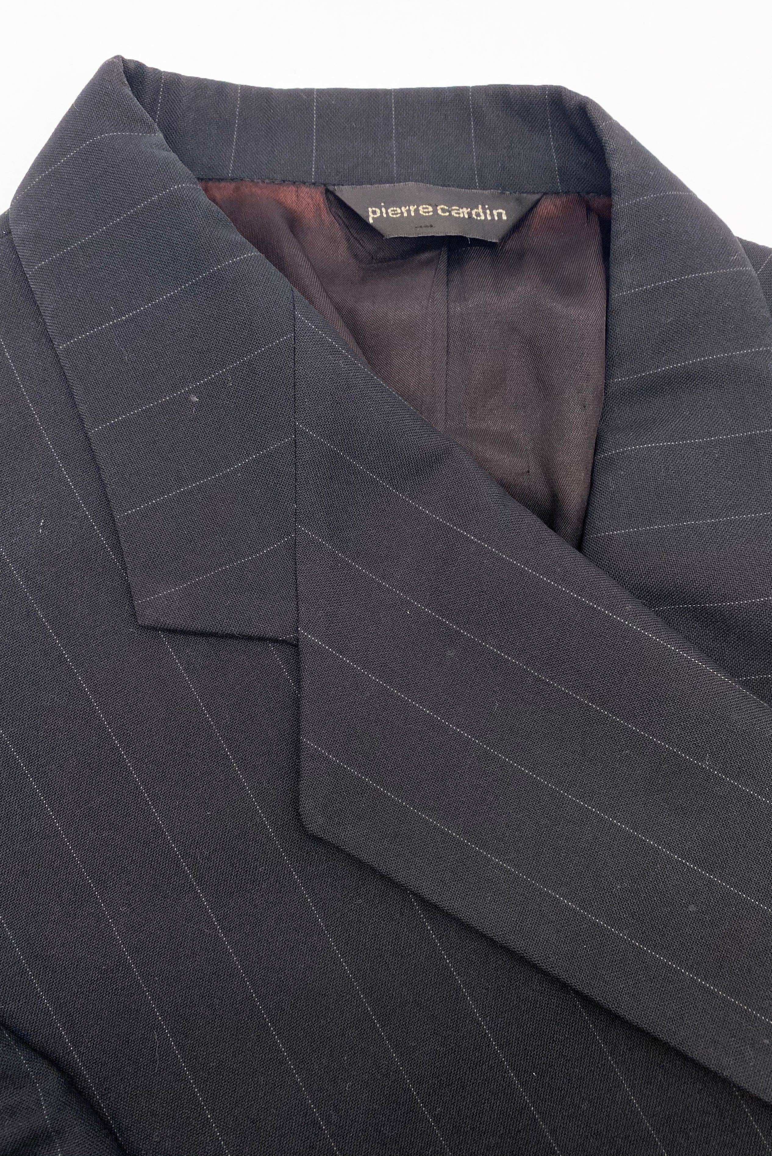 A vintage Pierre Cardin menswear black pinstripe single breasted blazer with a notched lapel. The jacket has two black buttons down the front, a breast pocket on the left side of the jacket and two welt pockets on either side of the lower half of the jacket.