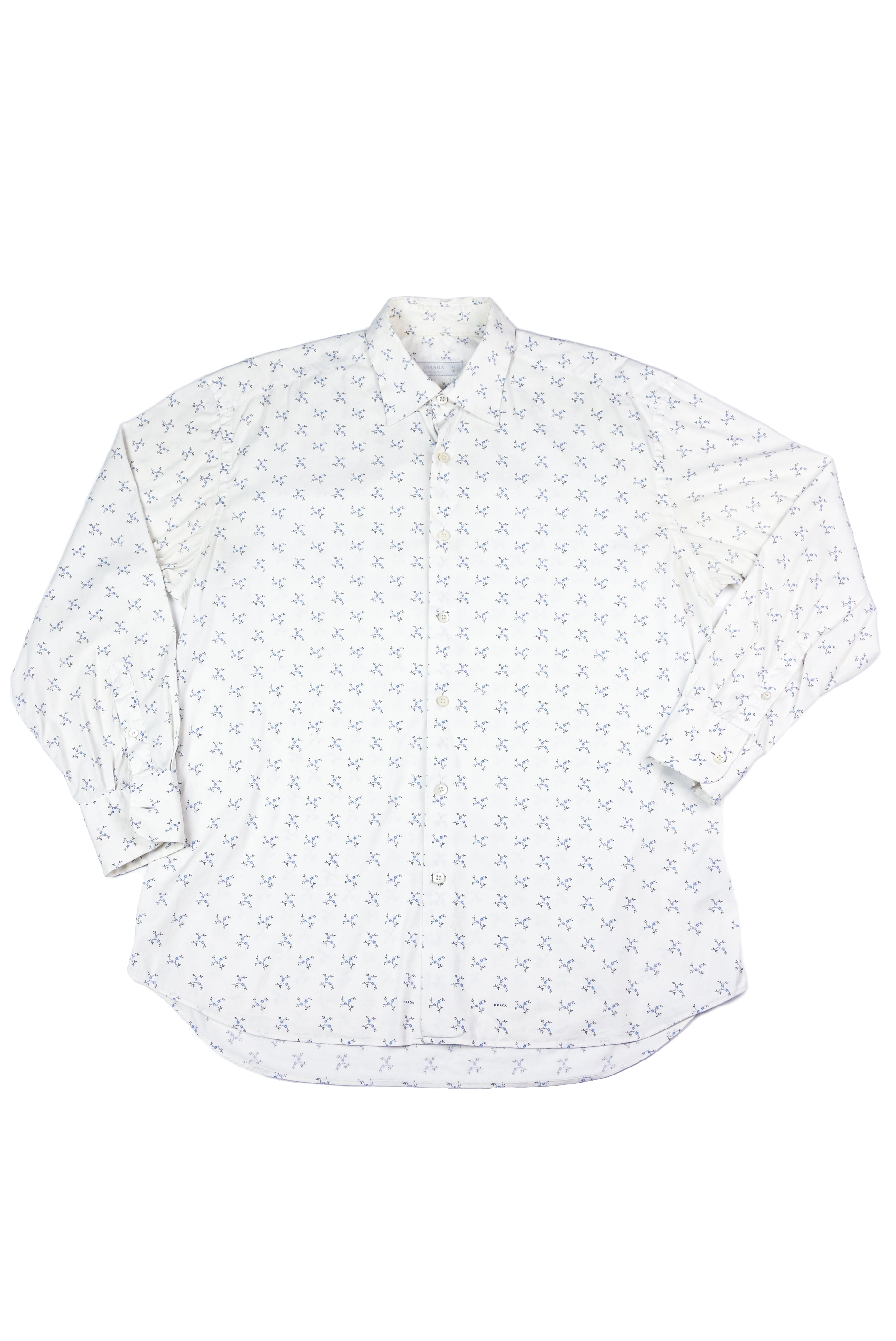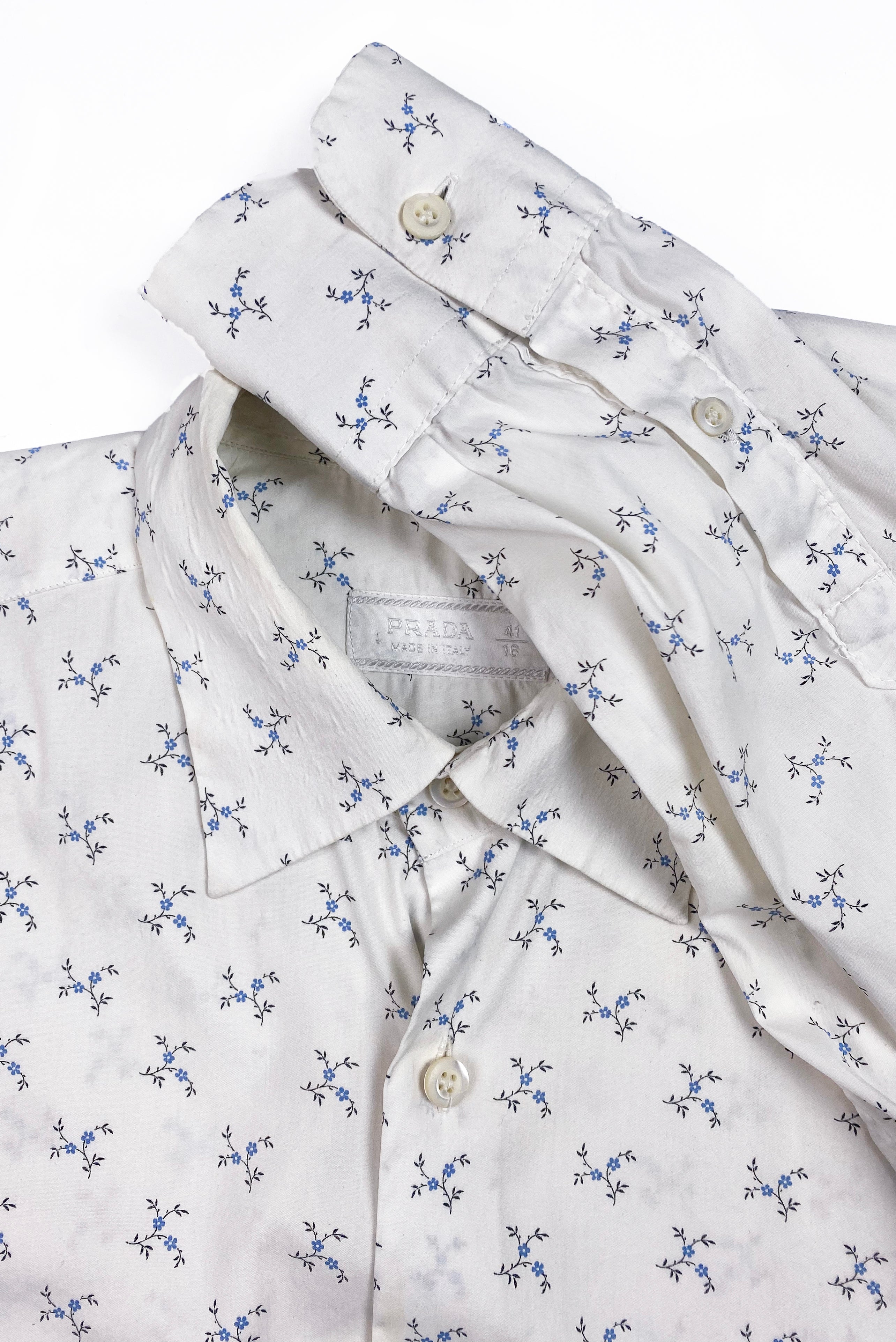 A Prada Menswear white cotton classic button up shirt with collar. The shirt has a Prada logo at the collar of the shirt that is mixed in with the delicate "Cornflower" print throughout the shirt.