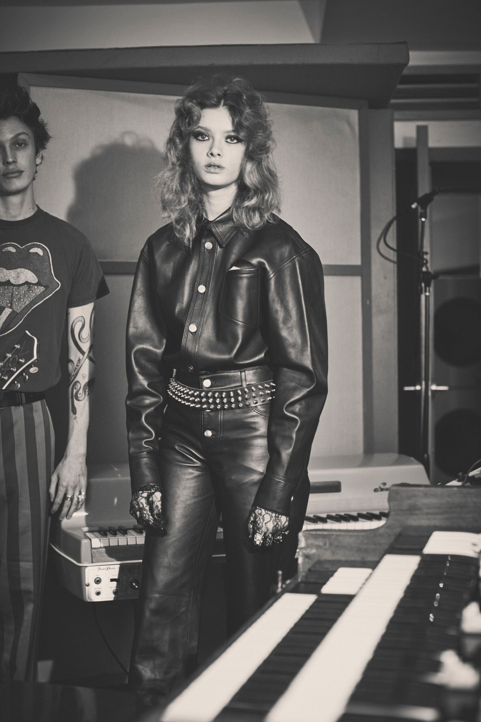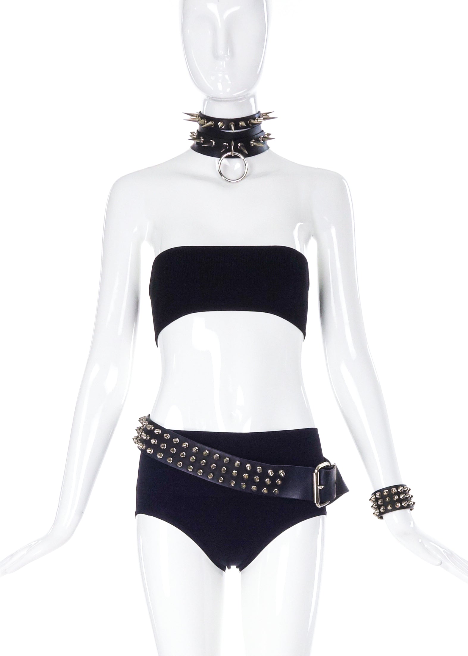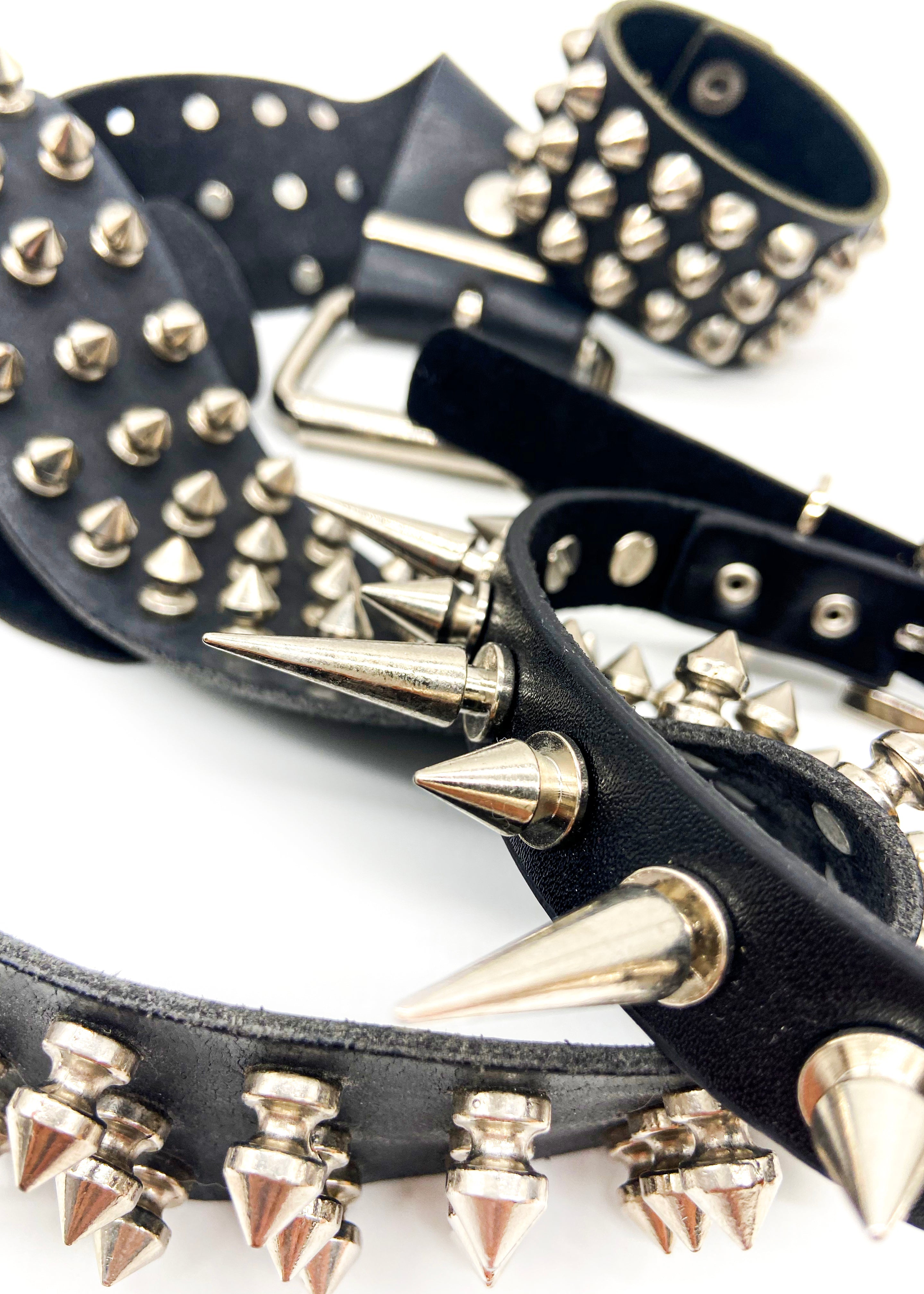 A Collection of leather jewelry embellished with punk style studs. The collection includes a silver studded belt with a silver buckle, a leather choker with different sized silver spikes and a leather cuff bracelet embellished with silver studs and two snap closures.
