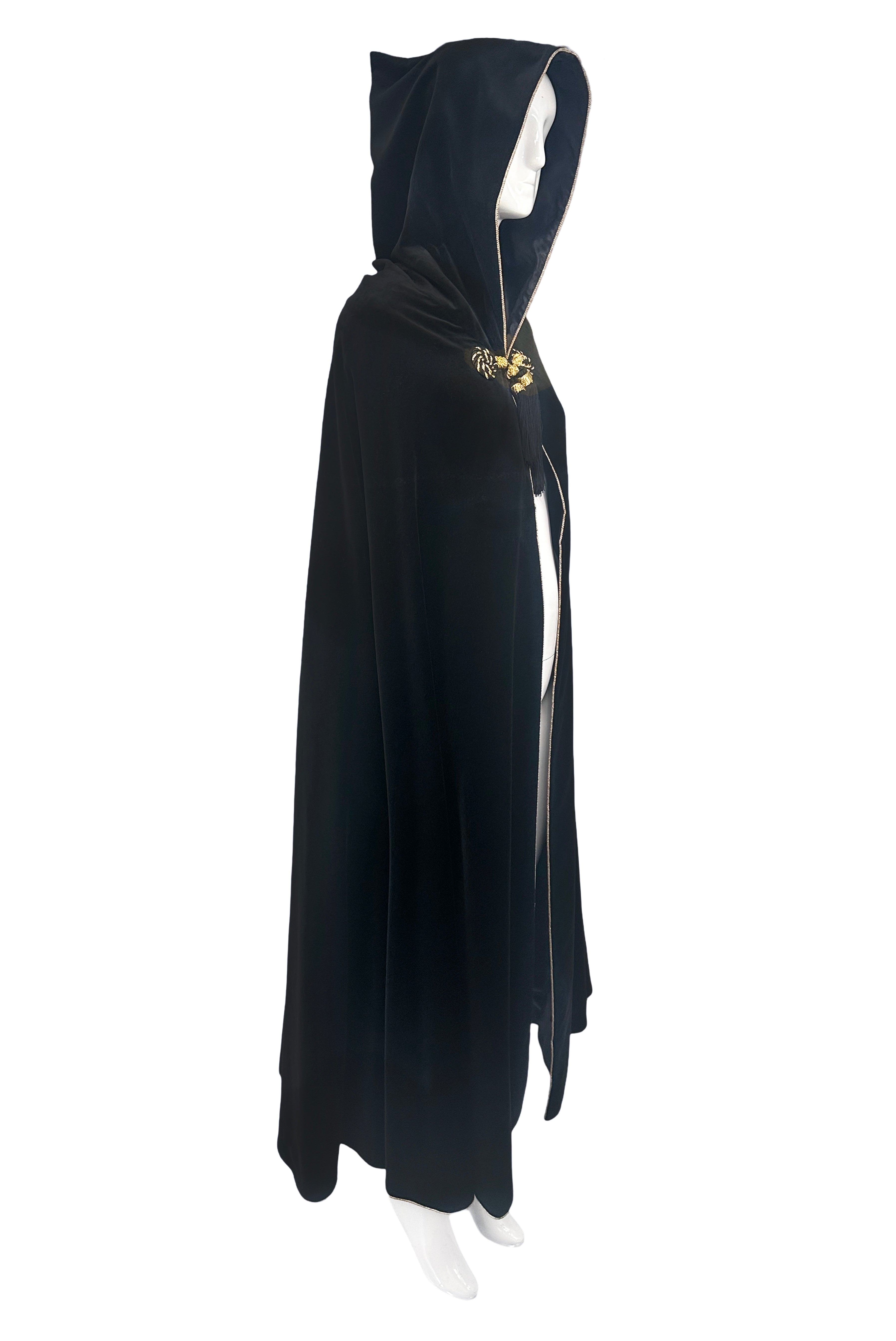 Saint Laurent Black Velvet Pointed Hood Gold Robe Trim Black Tassel 1970's Cape Coat