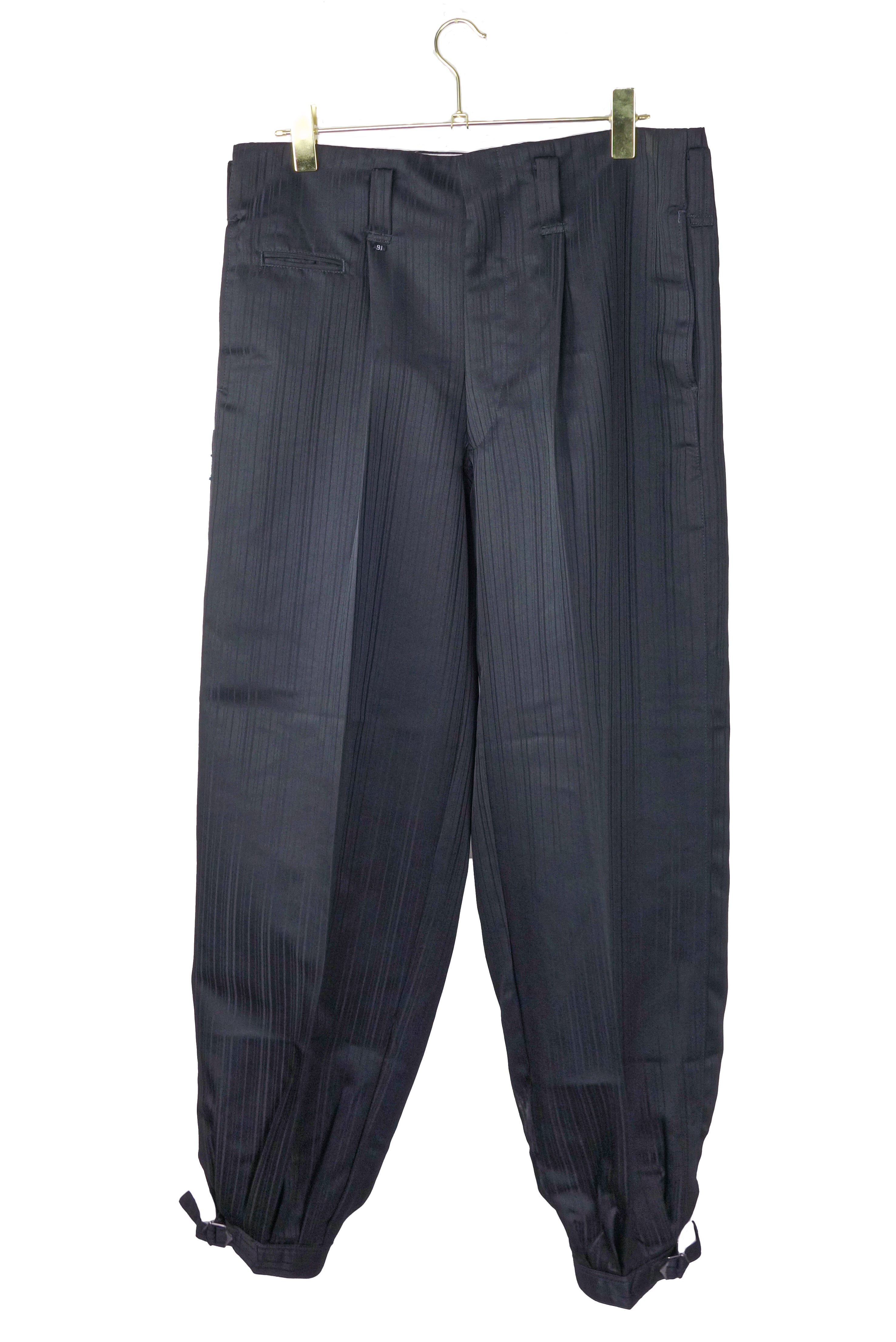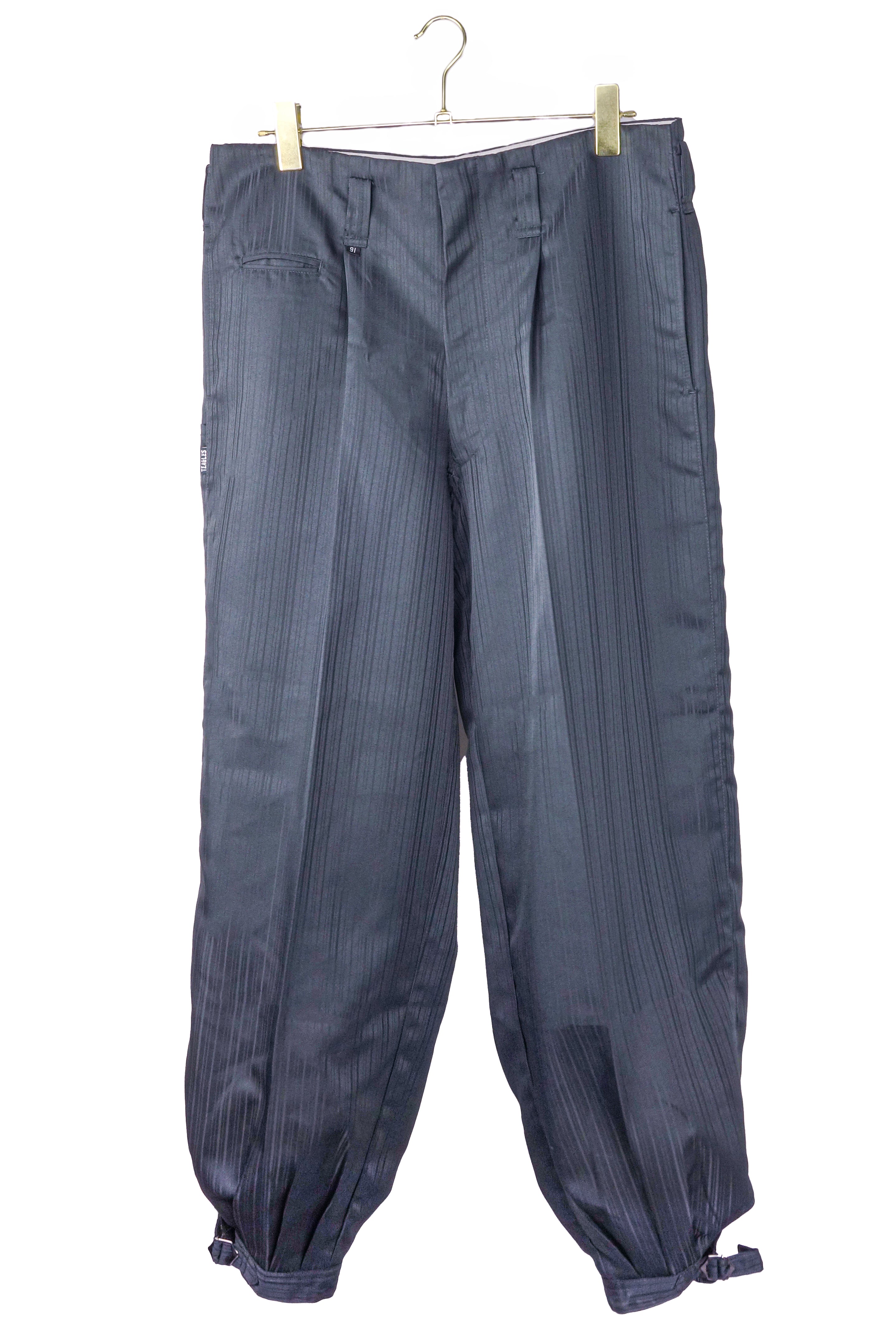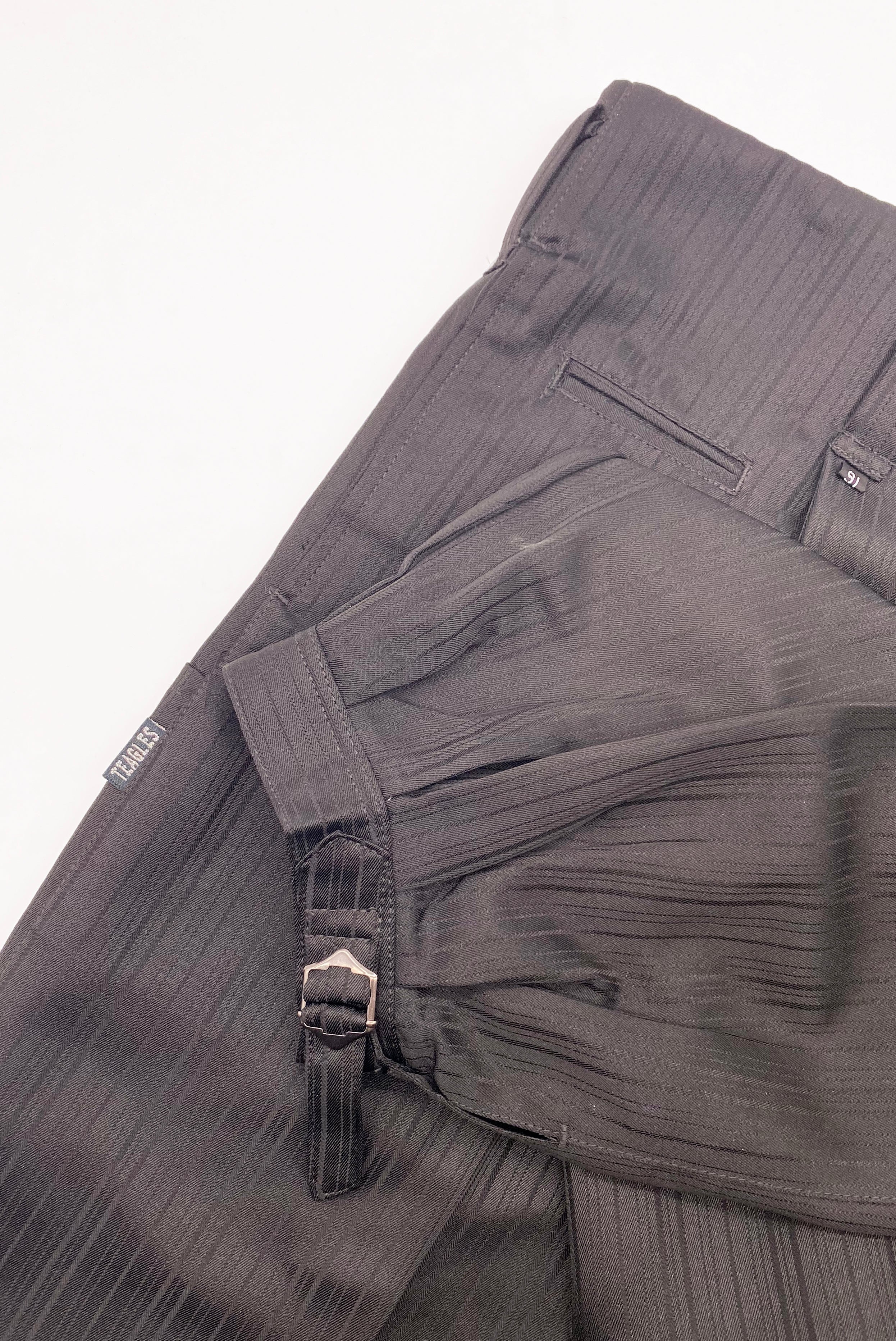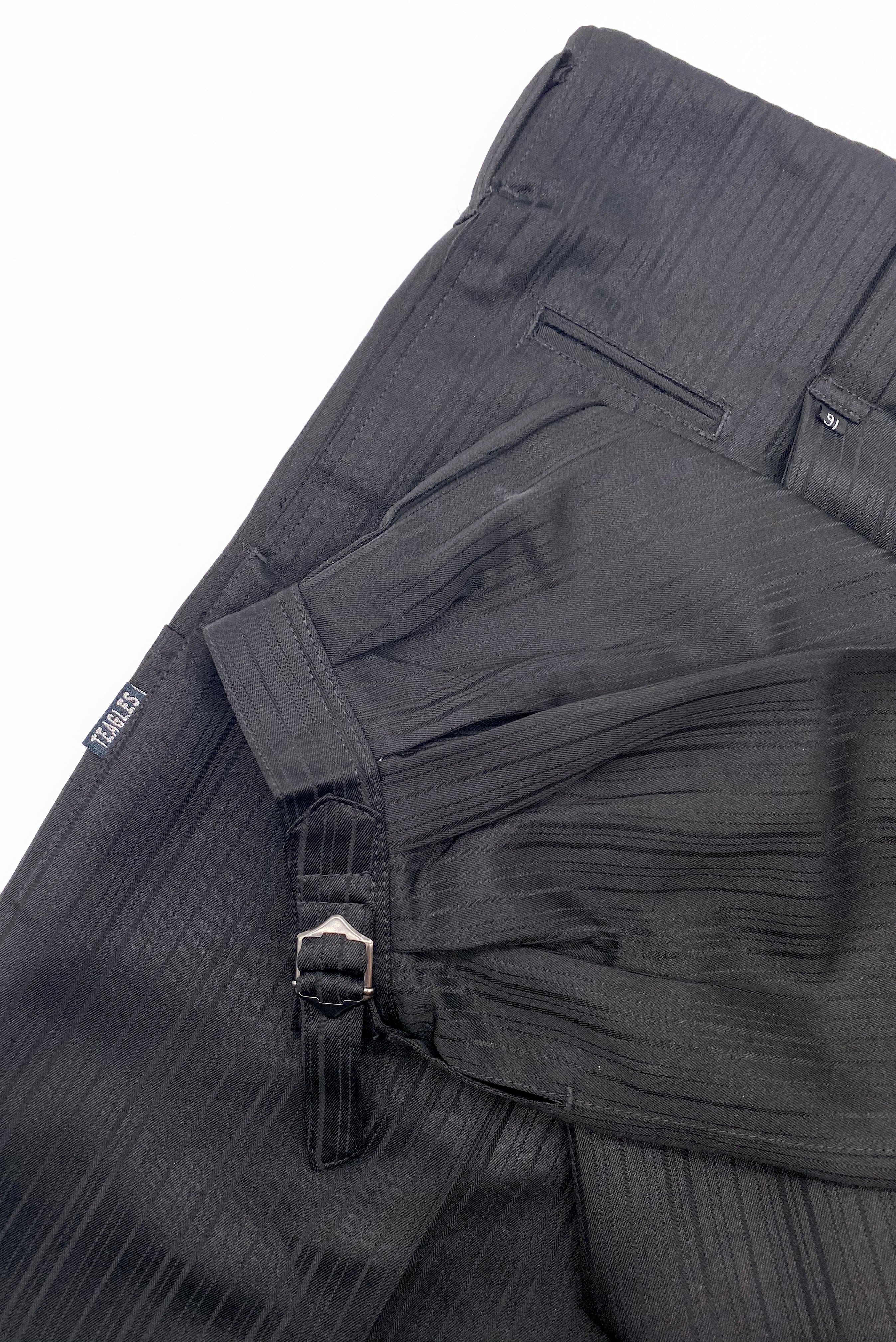 A pair of Teagles black nylon harem trousers with a jacquard pinstripe detail in the fabric. The trousers are from a cult Japanese streetwear label Teagles. The have a buckle at the hem of the pants with an adjustable tie to create a dramatic "Hammer" style silhouette.