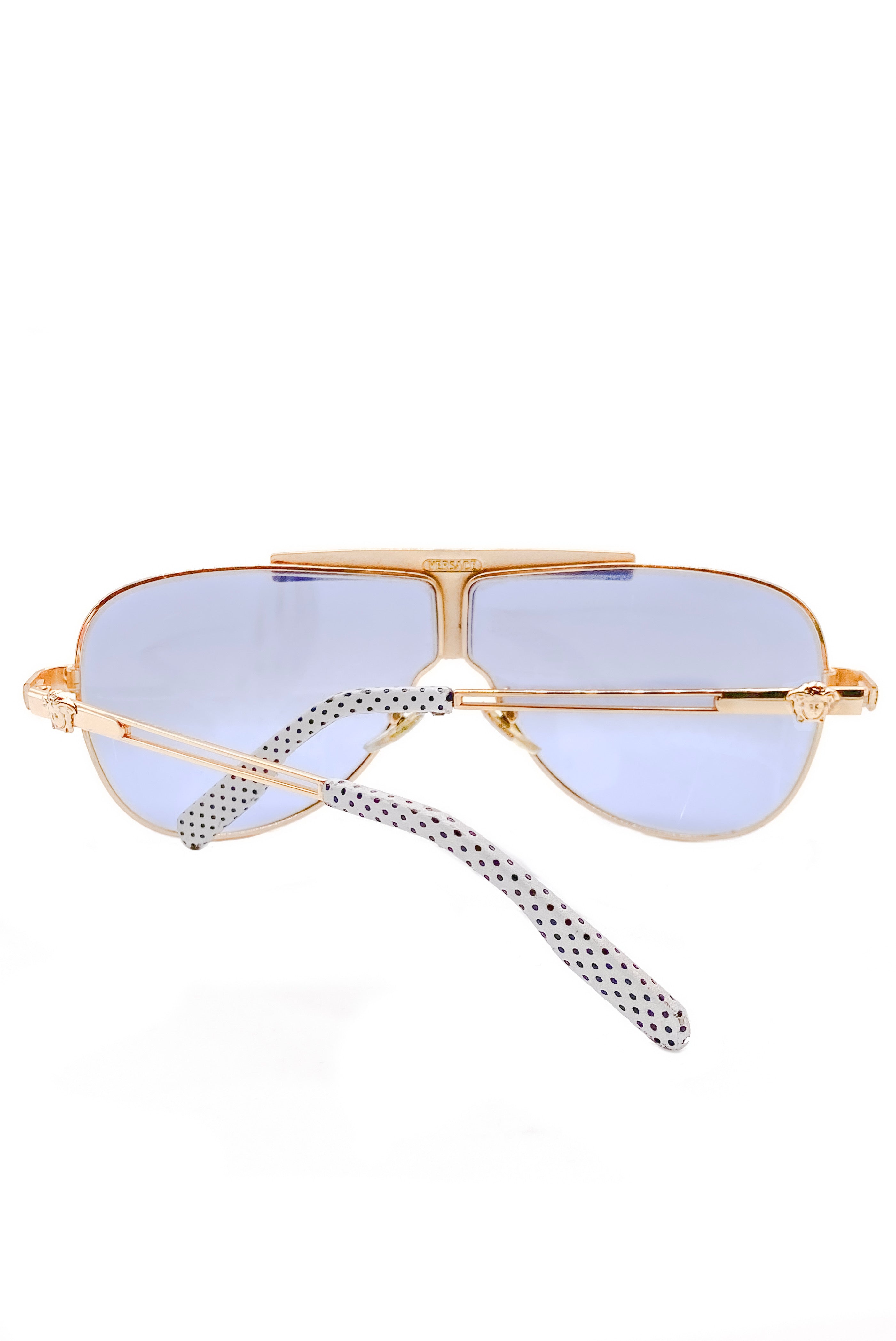 A pair of Versace avviato style sunglasses with gold frames and blue toned lenses. The center of the sunglasses are high-lighted with a t-shaped white perforated leather detail. The white perforated leather detail also encase the earpieces of the temple and on each side of the temples there is a classic Versace Medusa in gold.