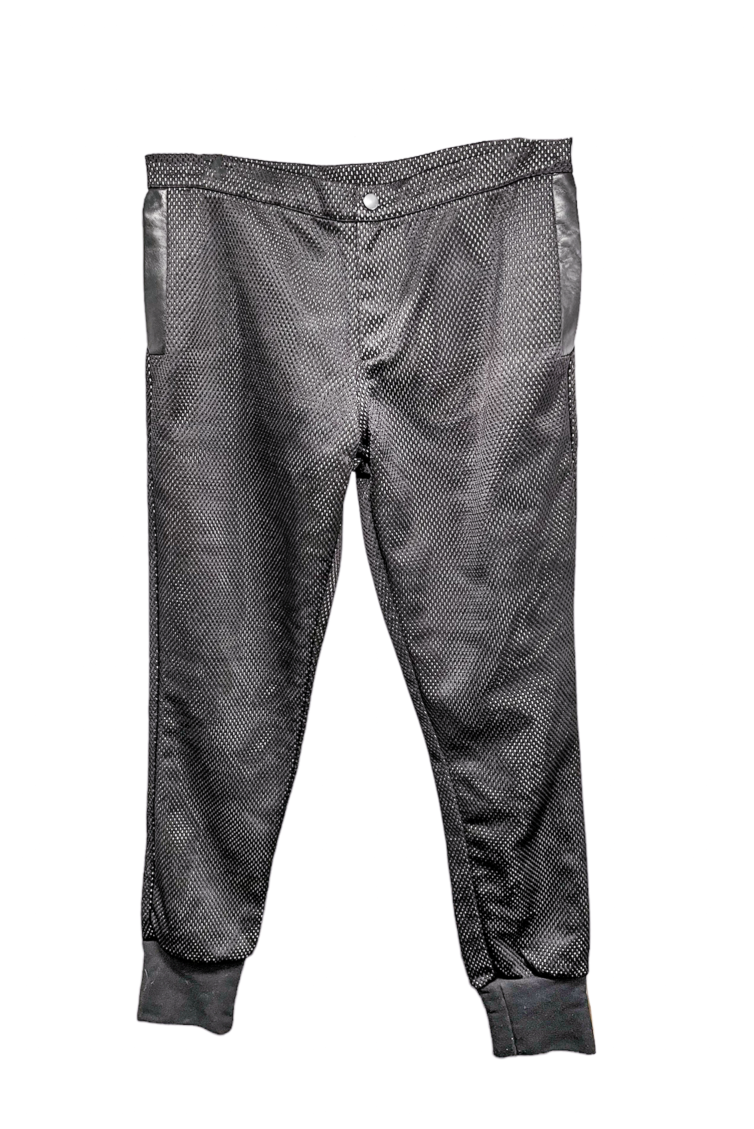 Vintage Black Mesh Fishnet Jogger Pants with Silver Metallic Lining and Leather Details