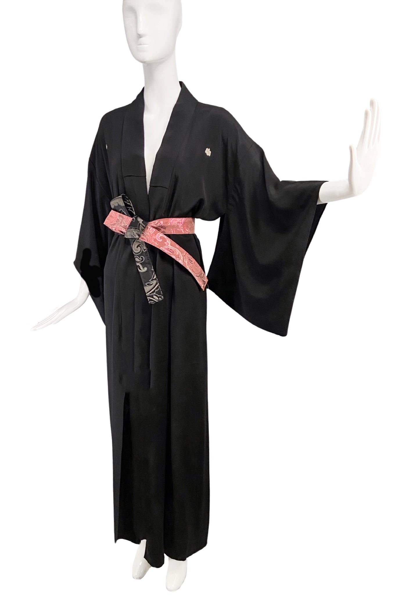 Vintage Black Silk Very Thin Long Kimono with Pink / Black Wrap Belt