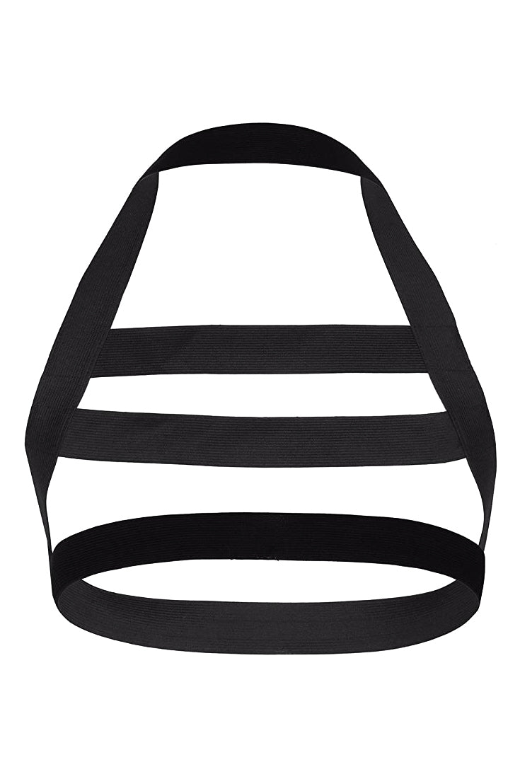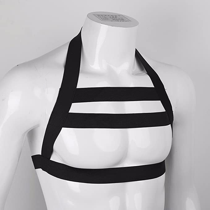 A vintage black elastic harness top with three horizontal straps across the chest.