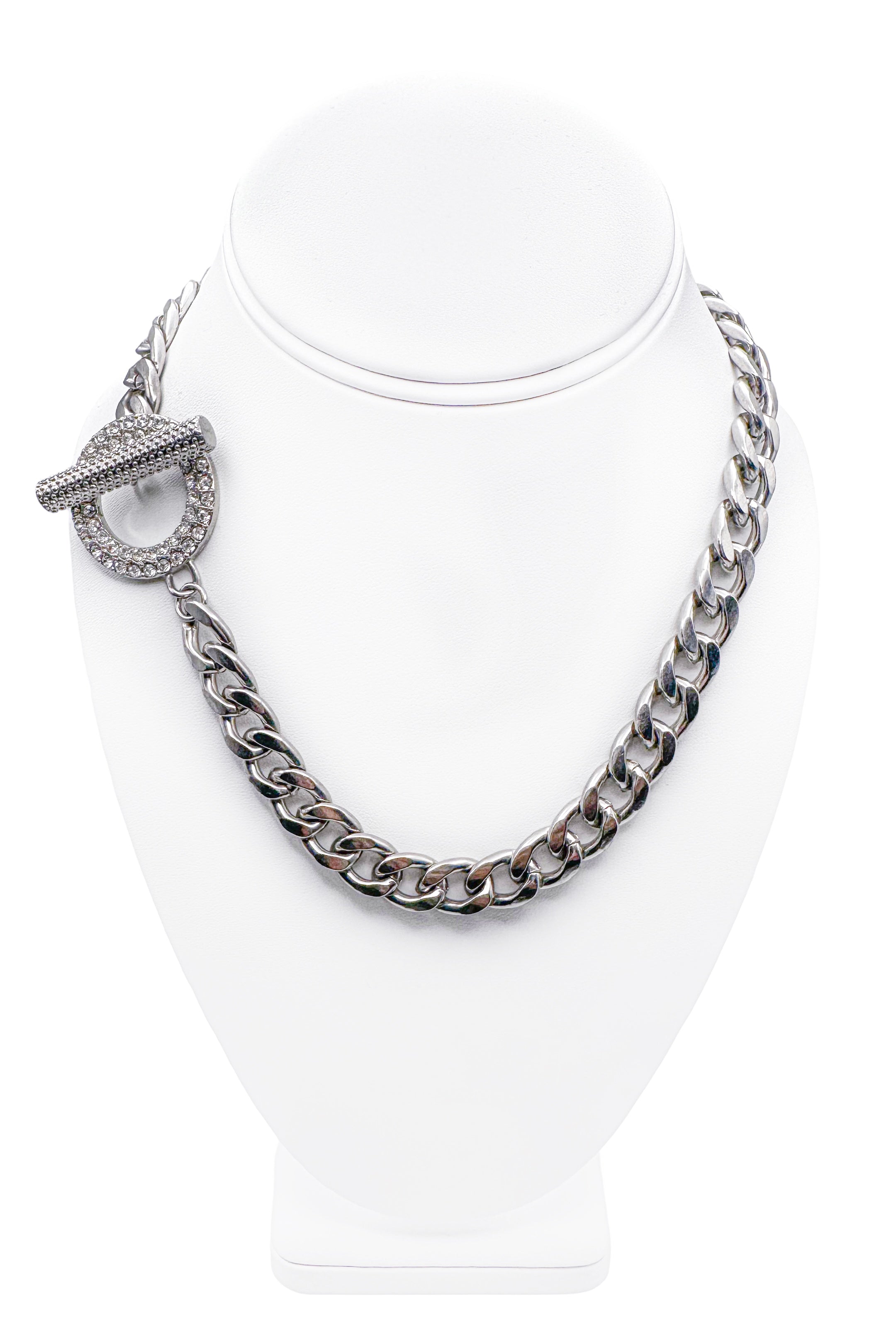 Vintage Silver Metal Curb Chain with Crystal Circle & Bar Closure Necklace