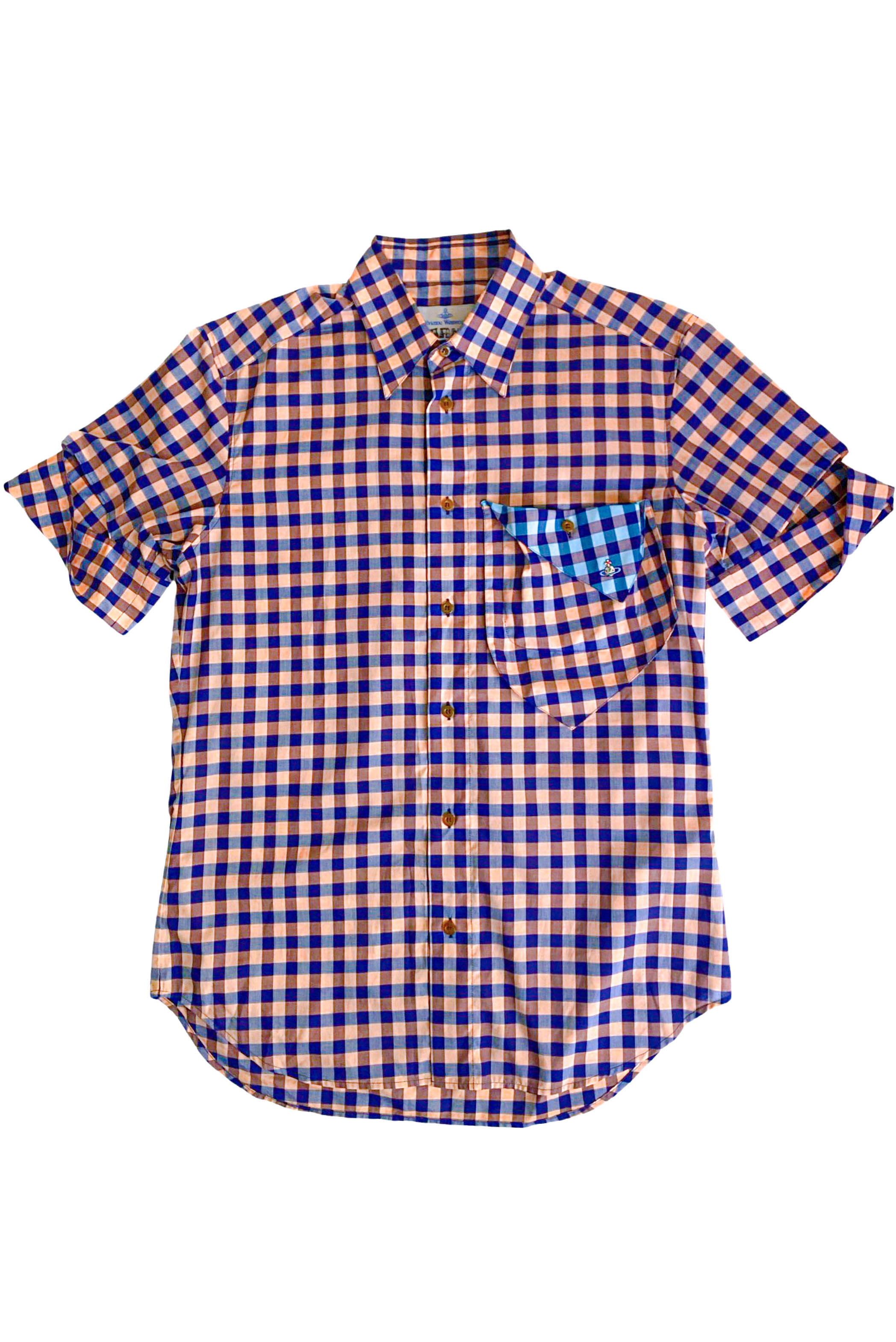 A Vivienne Westwood menswear blue and pink check print short sleeve button-up shirt. The cuffs of the shirt are partially deconstructed from the shirt and give it a single twist detail. The left breast picket of the shirt is abstractly asymmetrically shaped and have a twist up pocket flap in a contrasting bright blue color.