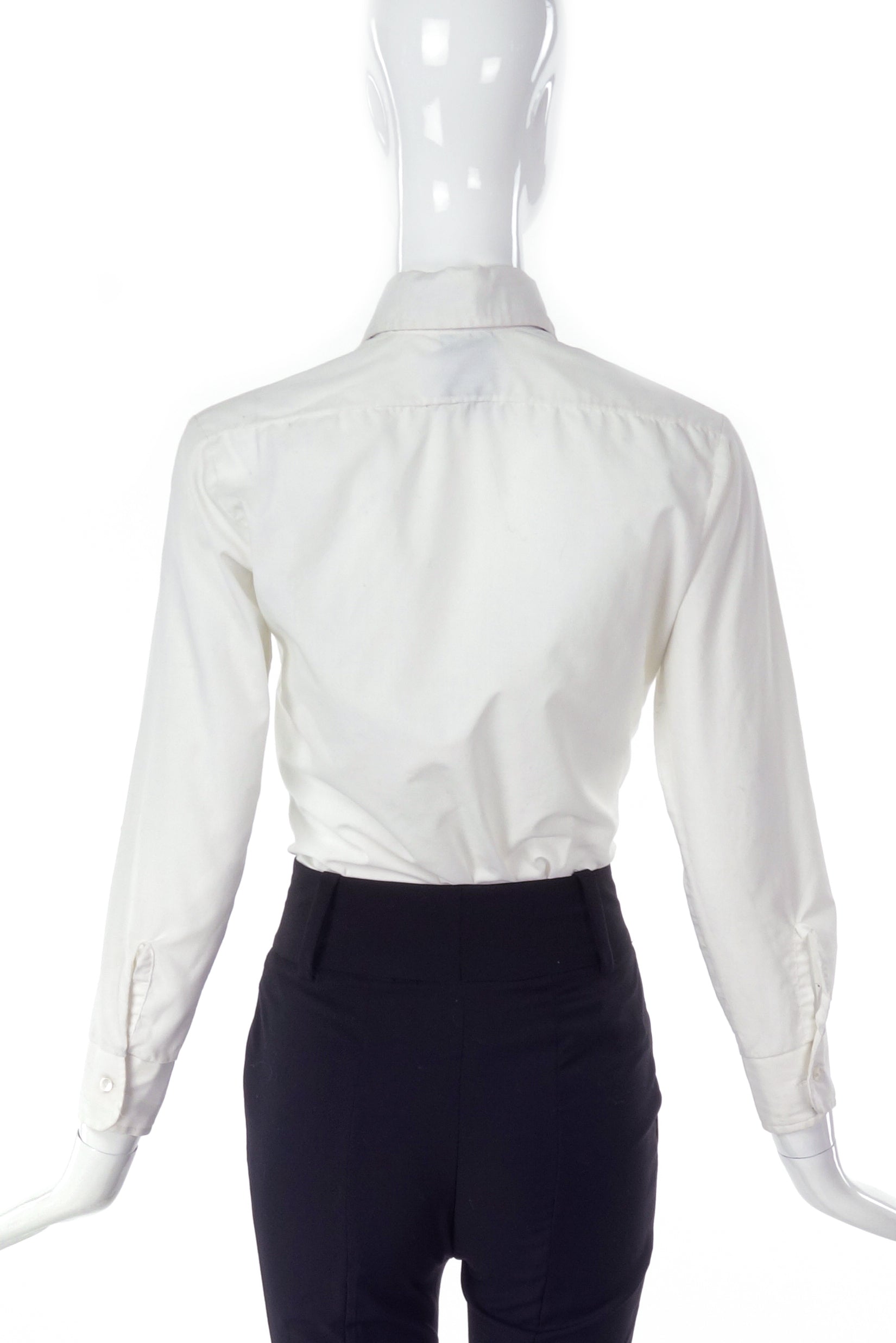 A vintage white cotton button-up women's dress shirt. This shirt has the uniquely called "penny round" collar. Circa 1970's.