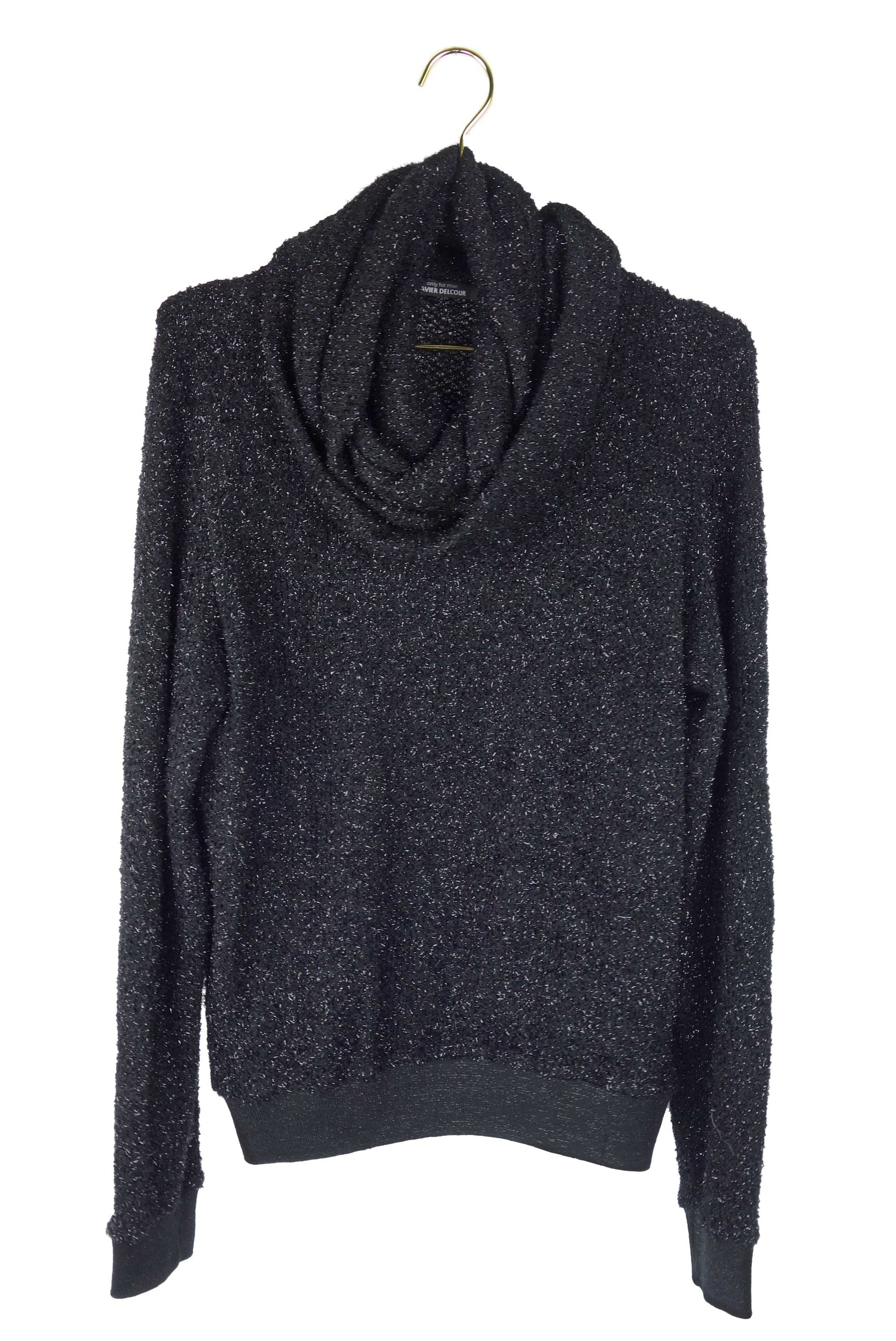 A Xavier Delcour black lurex knit sweater with a wrap around cowl collar. The sweater has rib knit cuffs at the sleeve and at the hem. The sweater has a a crew neckline with a rolled collar, there is a wrap around "scarf" like collar that creates a cowl turtleneck.