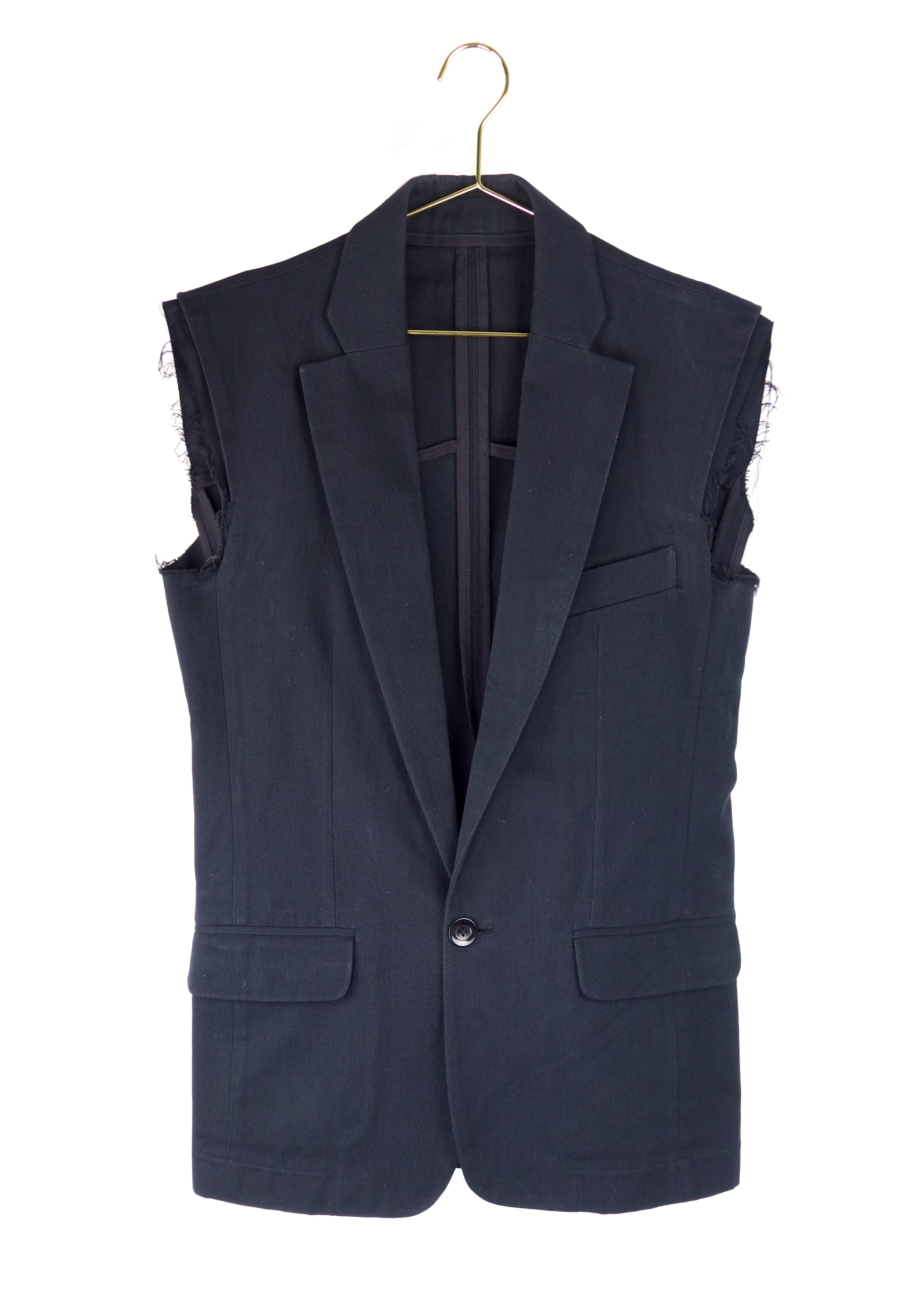 A Xavier Delcour black sleeveless single breasted blazer with a notched lapel. The jacket has a single button closure and two flap pockets on either side of the jacket. The arm holes have a deconstructed edge detailing with a single vent in the back of the jacket.
