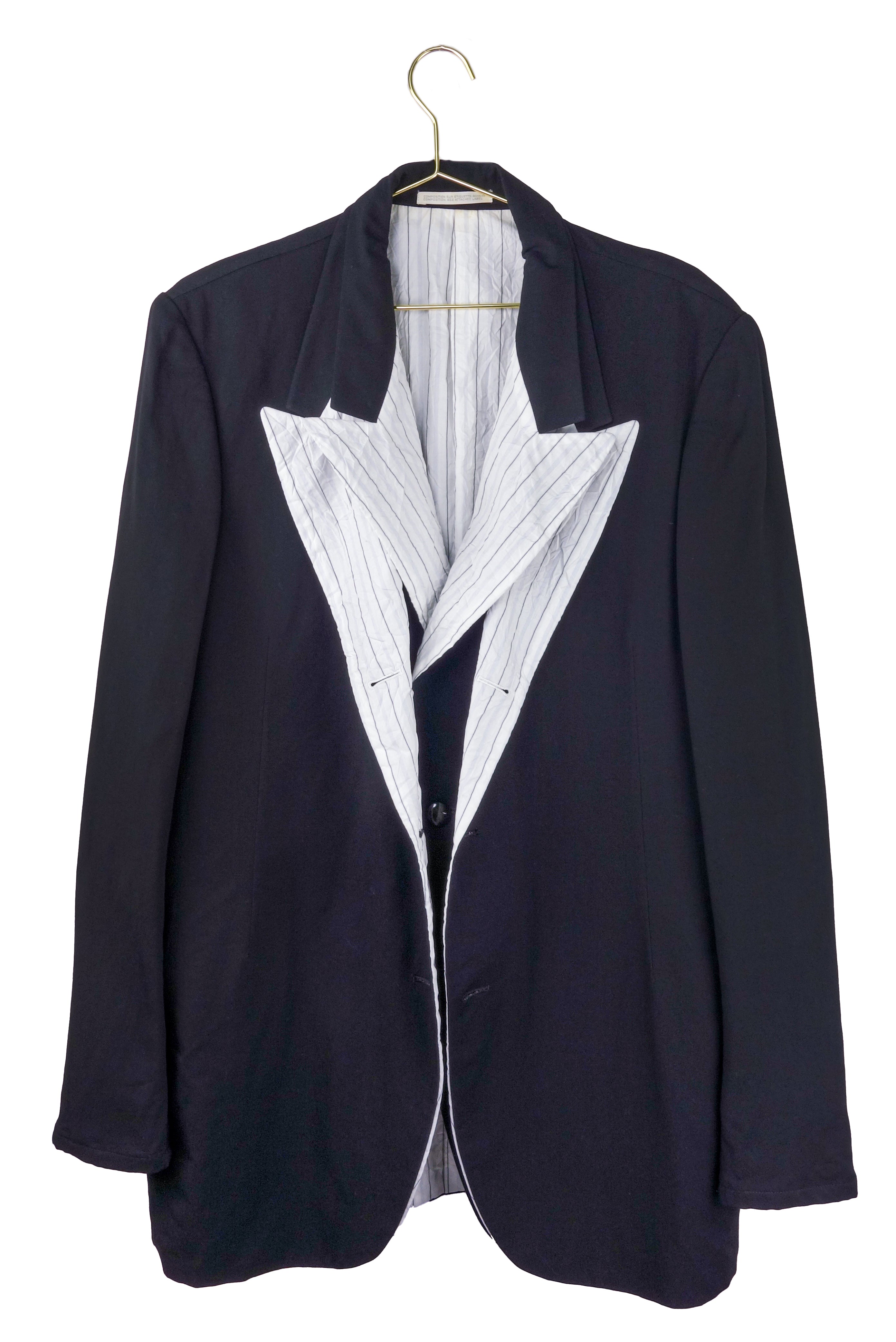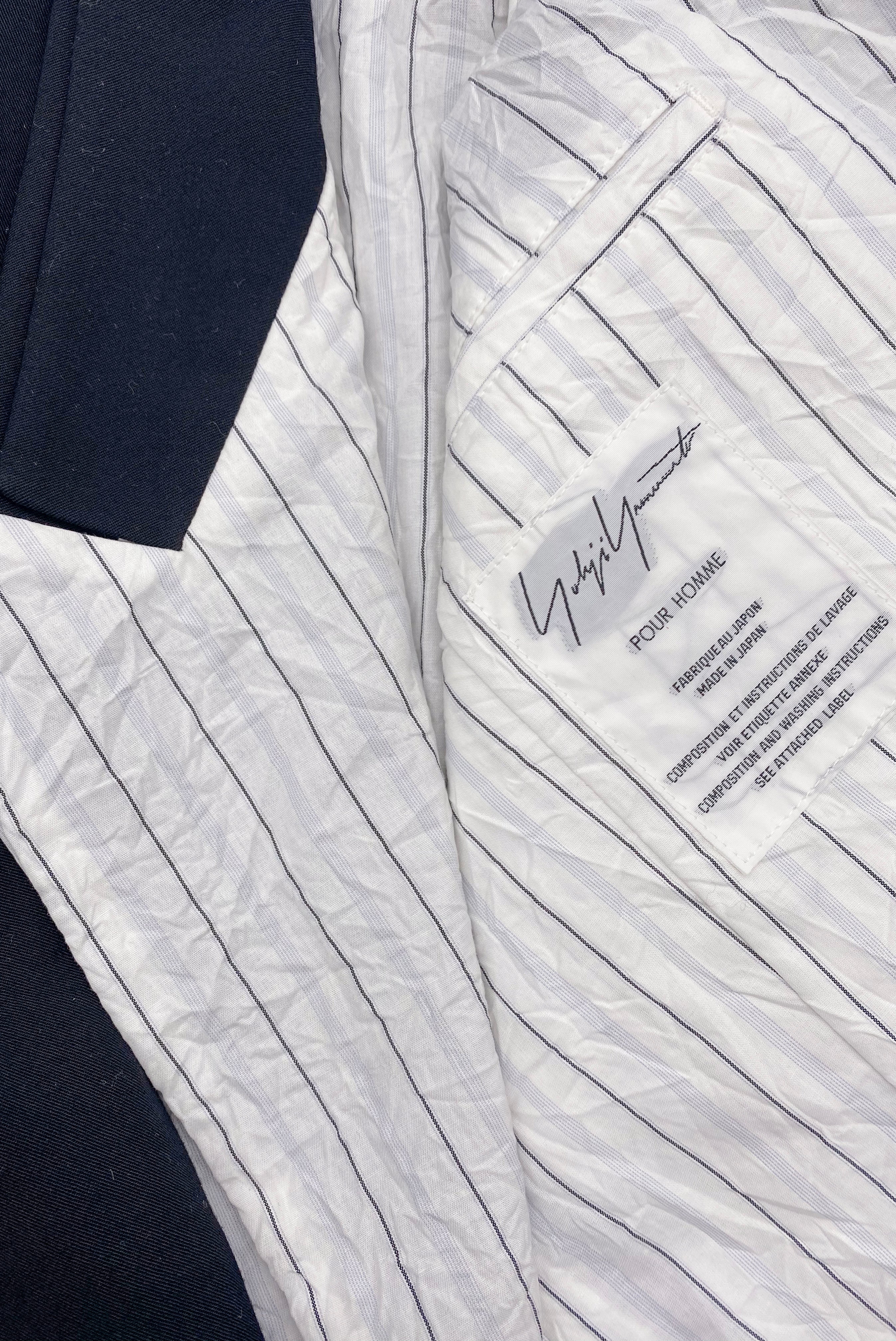 A Yohji Yamamoto double lapel, double layer single breasted blazer. The jacket has a unique double layer peak lapel with a white pinstripe cotton detailing which is the same as the lining of the jacket. The blazer has two layers to it to create the illusion of two jackets worn over each other. There are three rounded black buttons down the right side of the interior jacket.