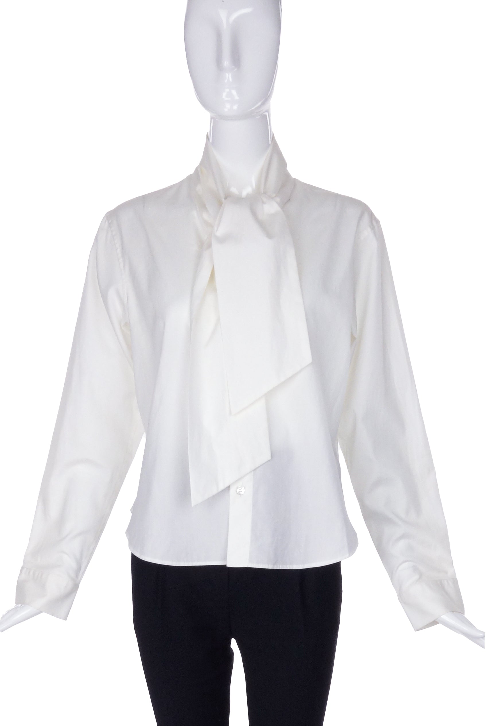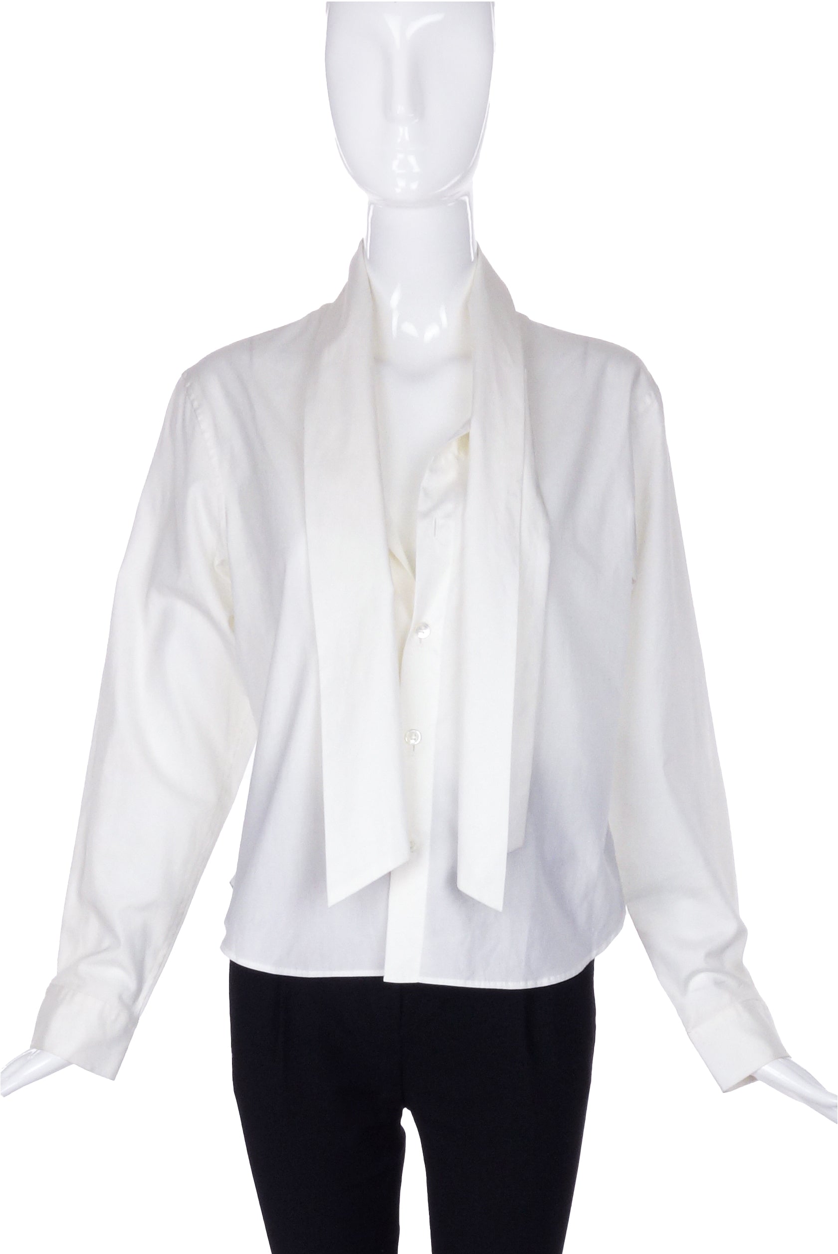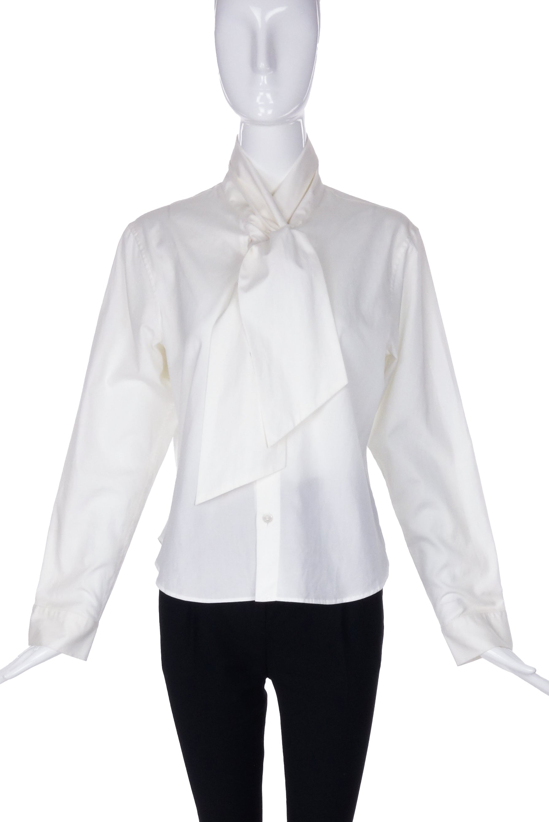 A vintage Yohji Yamamoto white cotton button-up menswear style blouse with a neck tie detail. The shirt has multiple ways to manipulate the neck tie. There are slits in the collar for the ties to pull through and overlap each other and create a high neck shawl collar. The ties can be folded over into an oversize jabot like tie. The ties of the shirt can also be left undone in a scarf like manner.