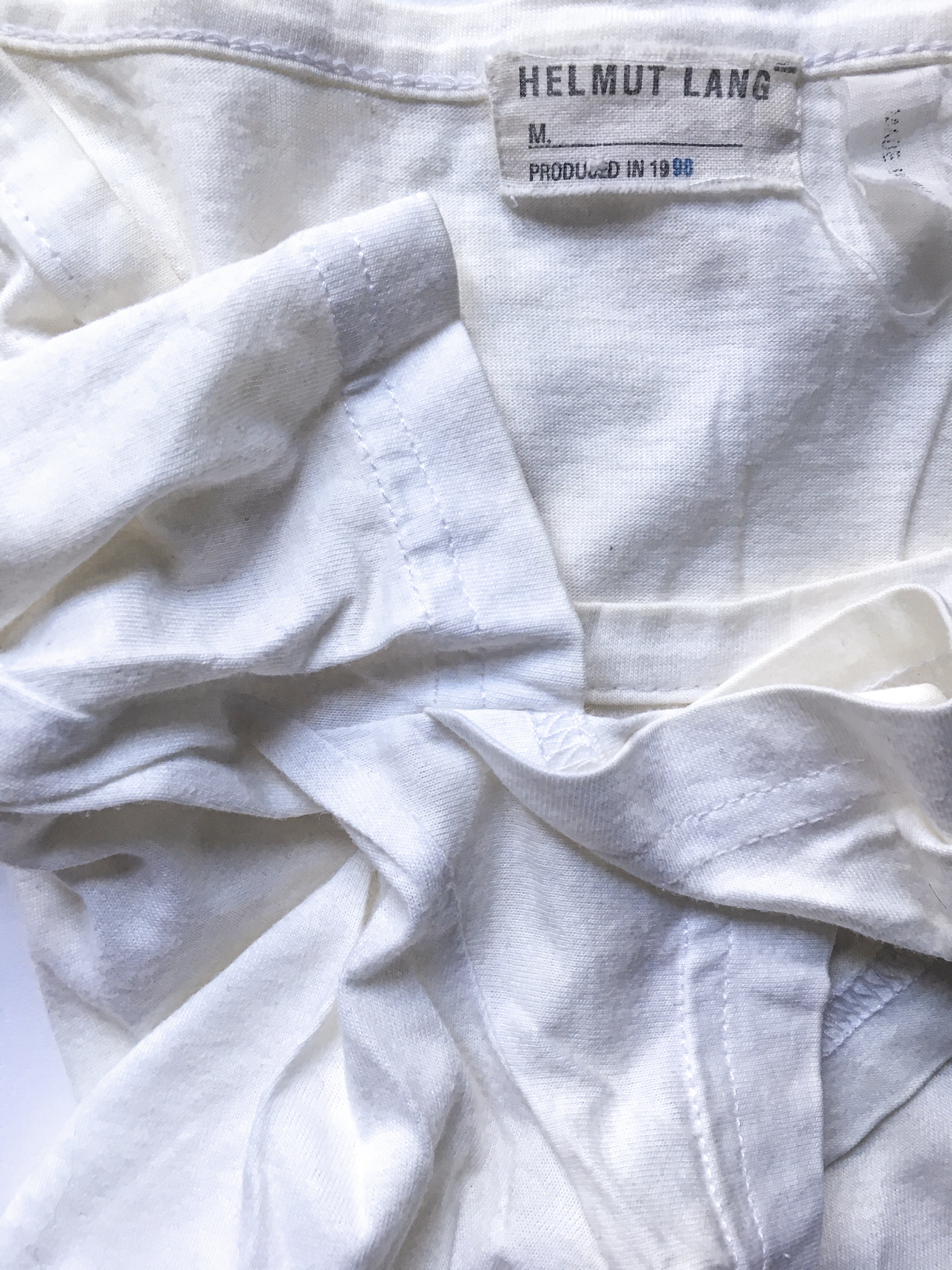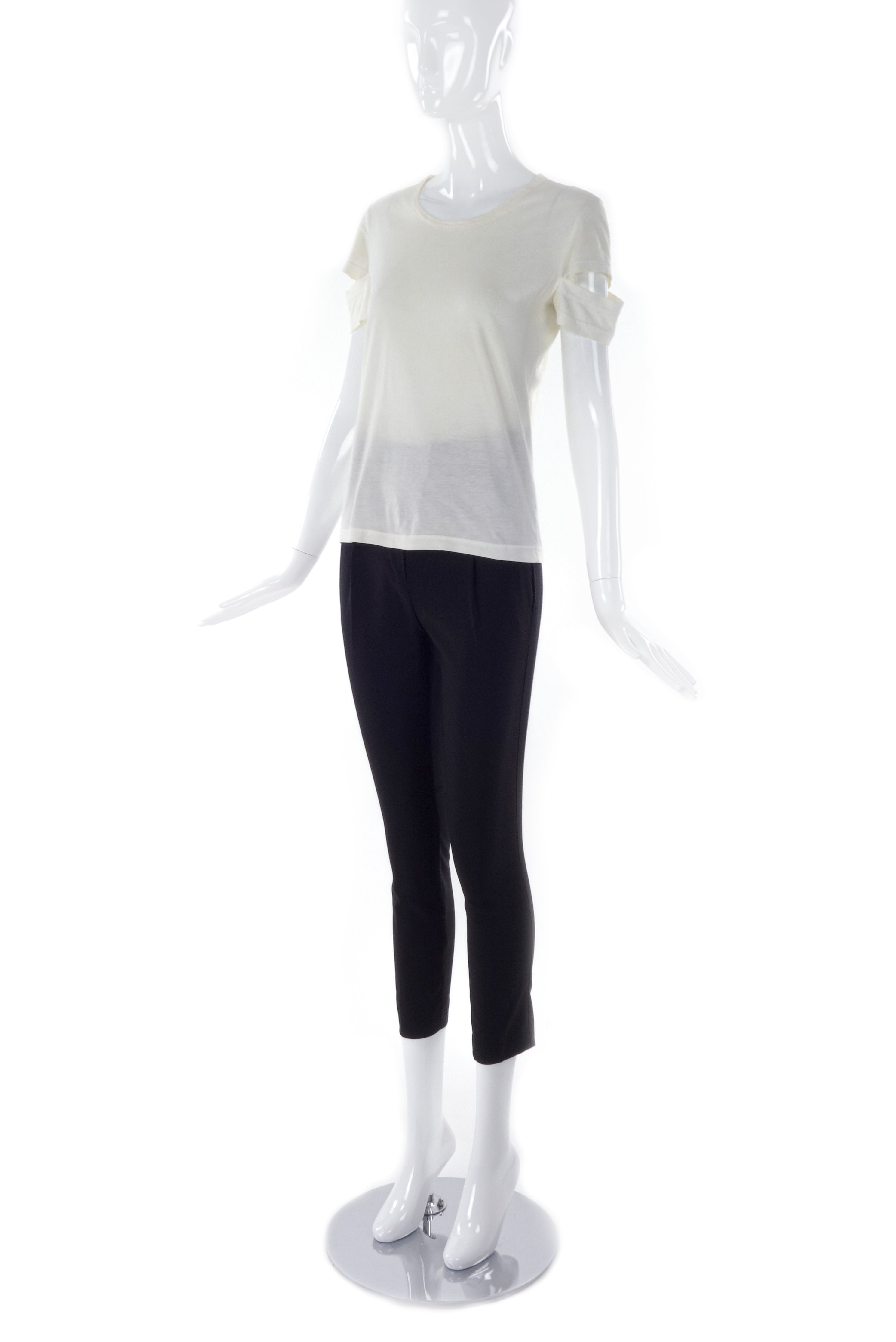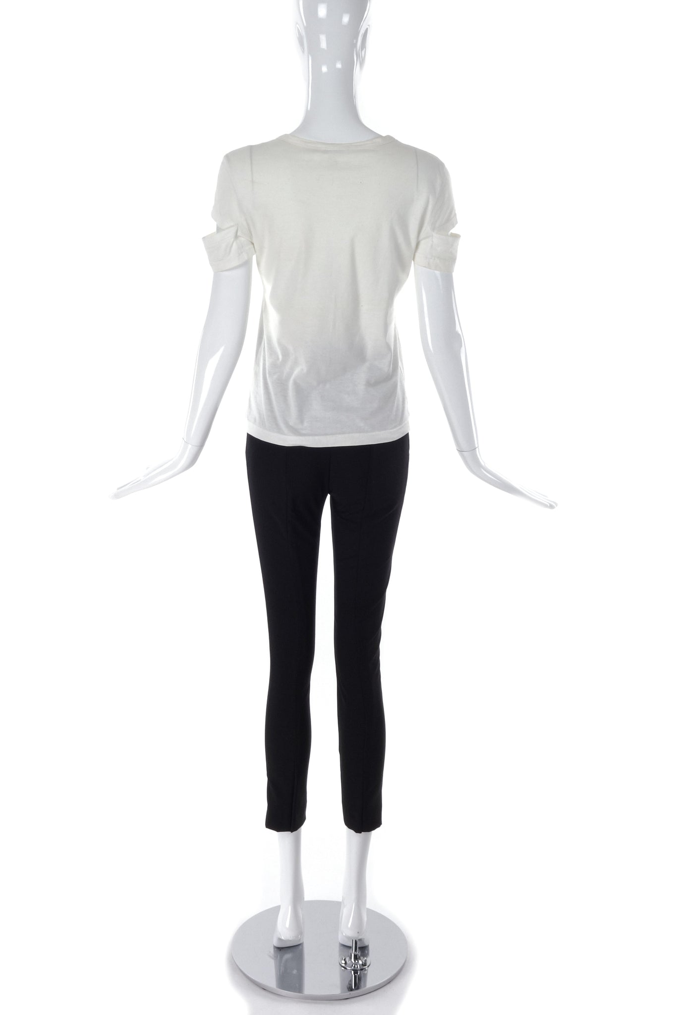 A Helmut Lang white cotton minimal short sleeved t-shirt with a cut-out detail on the sleeve. Produced in 1998.