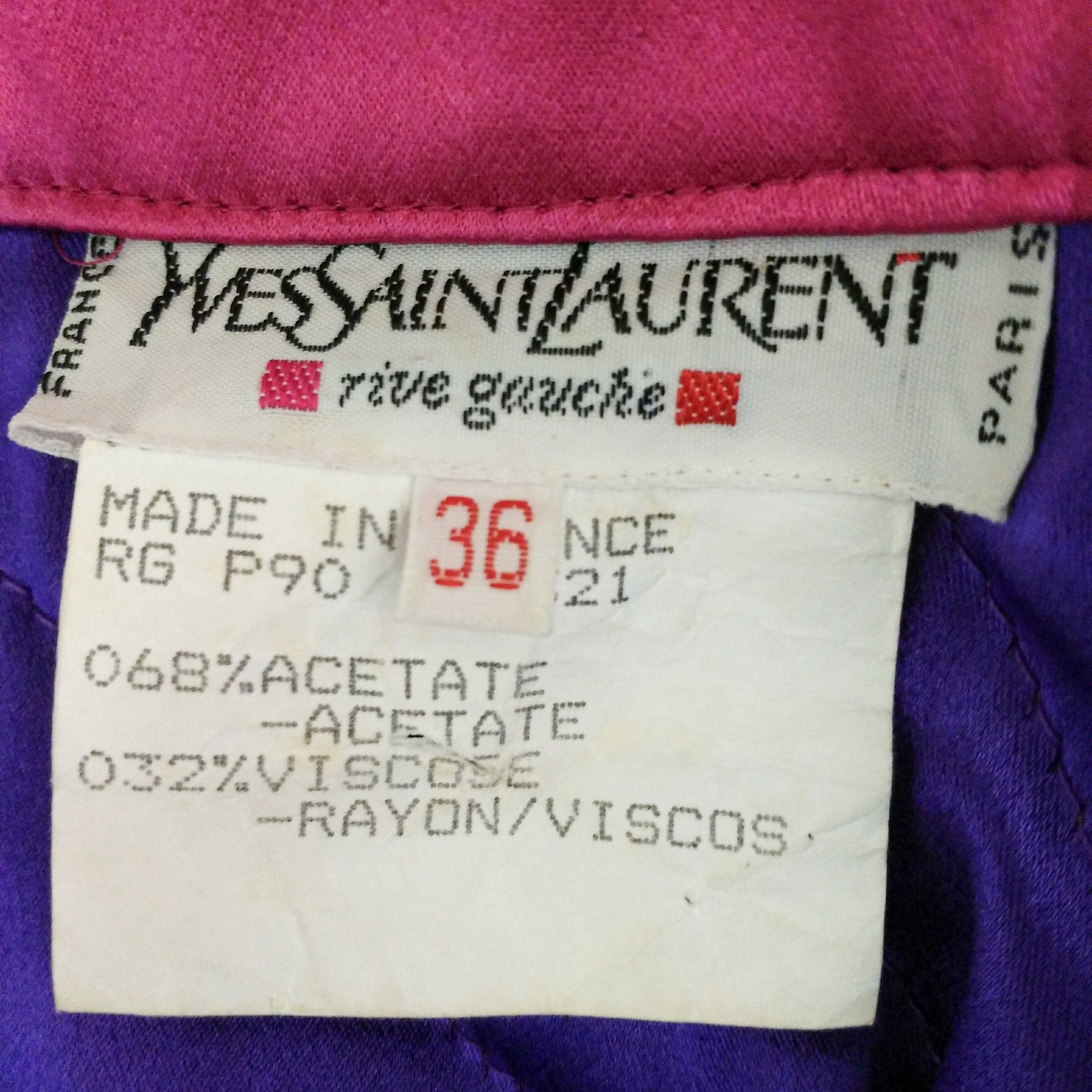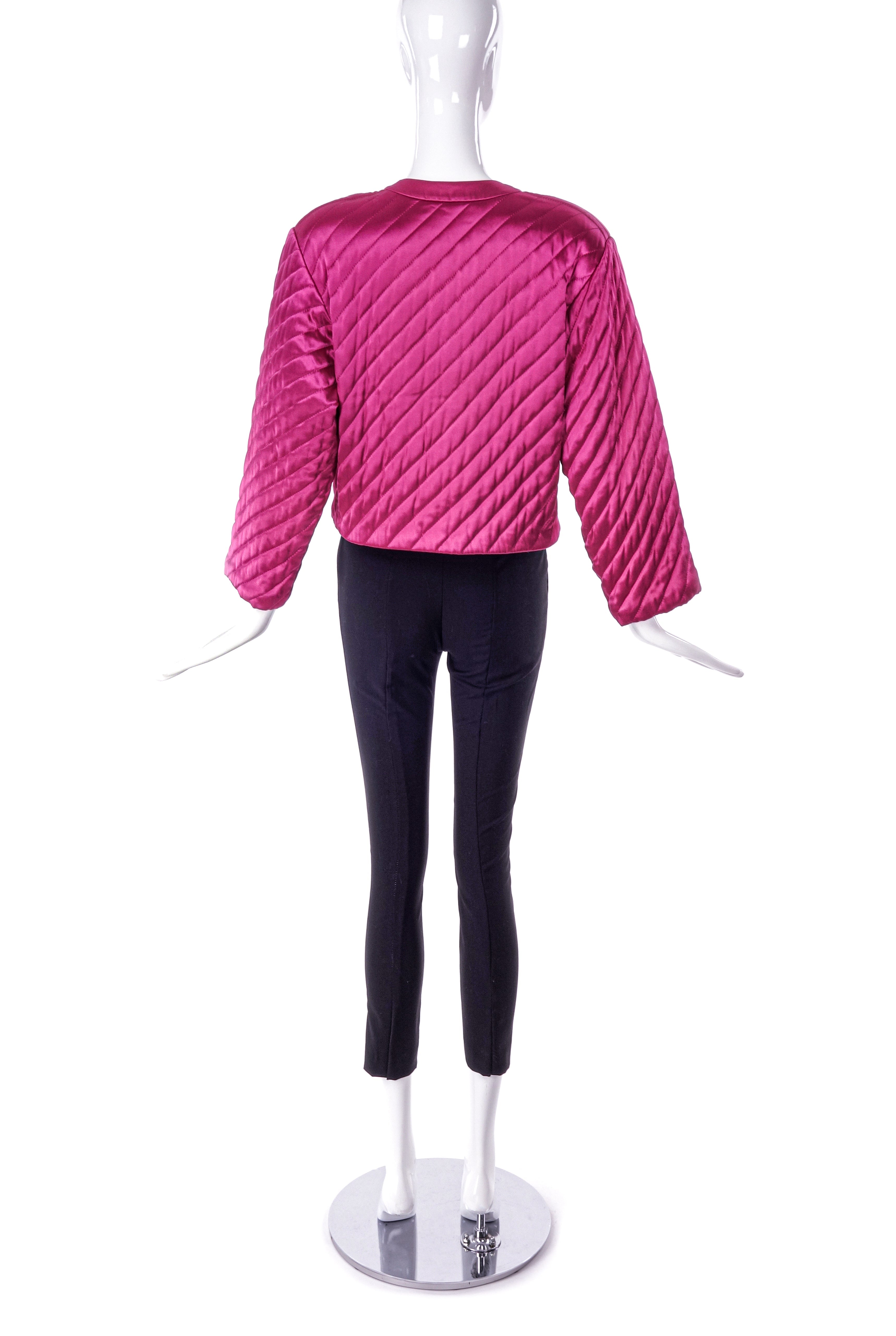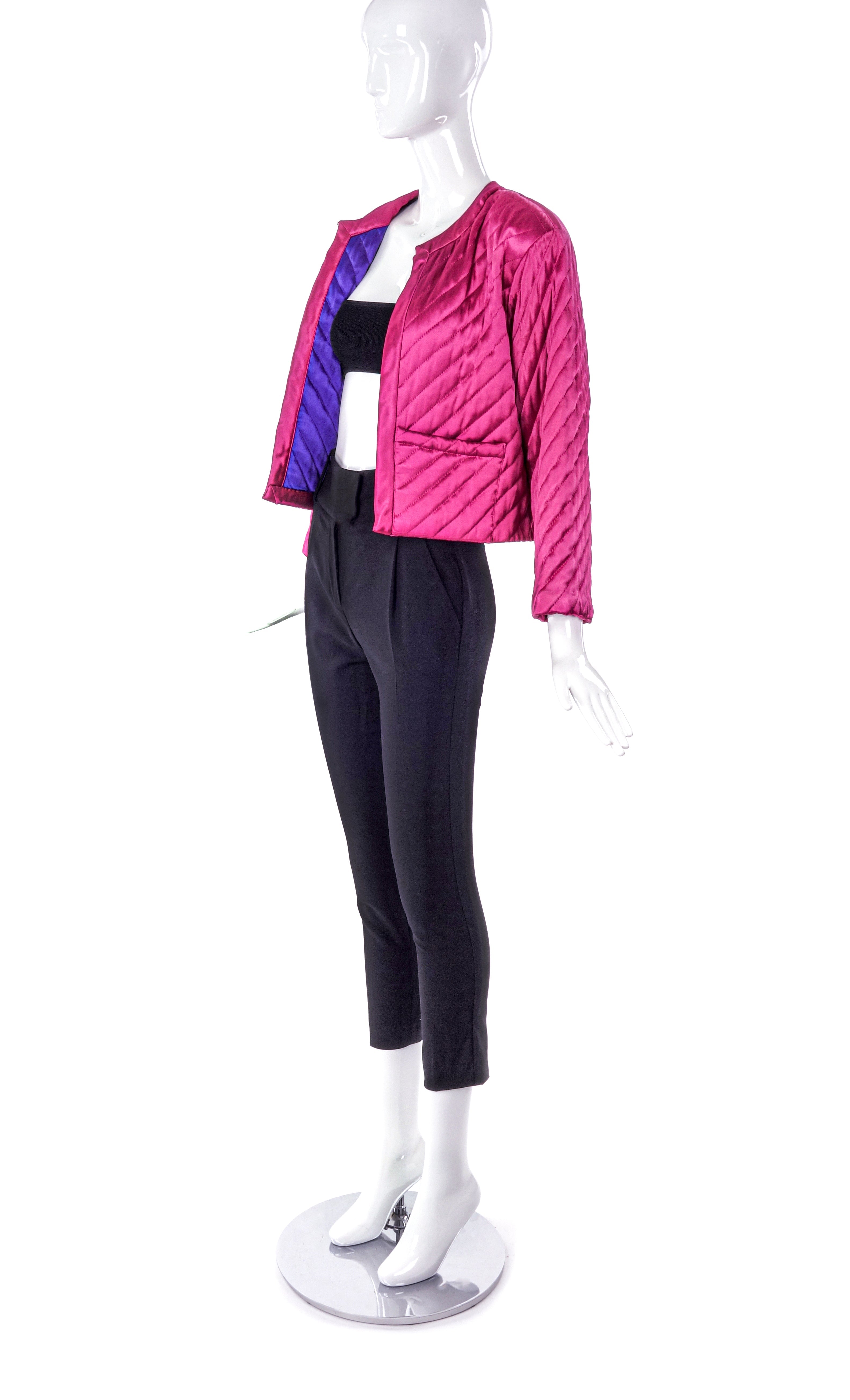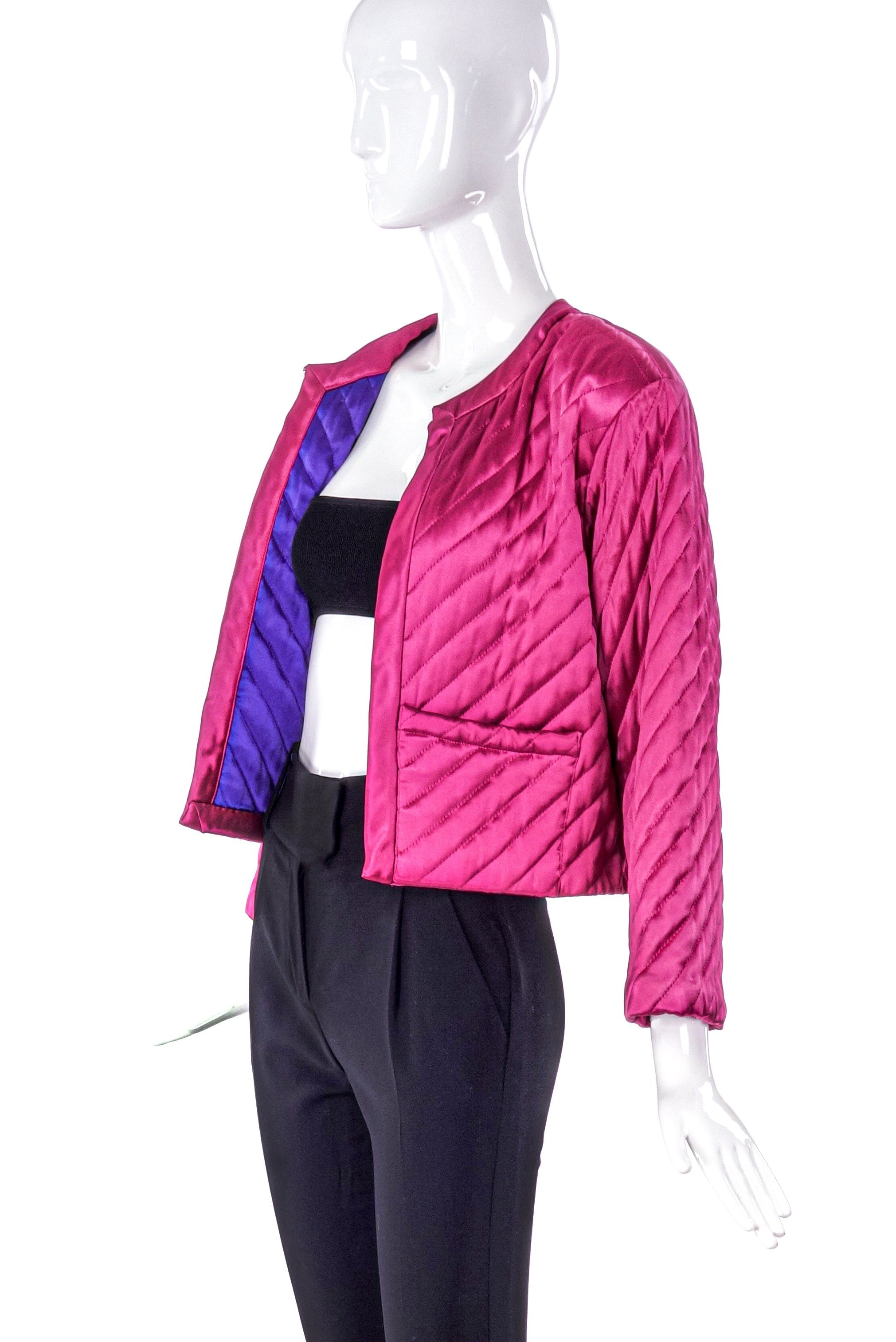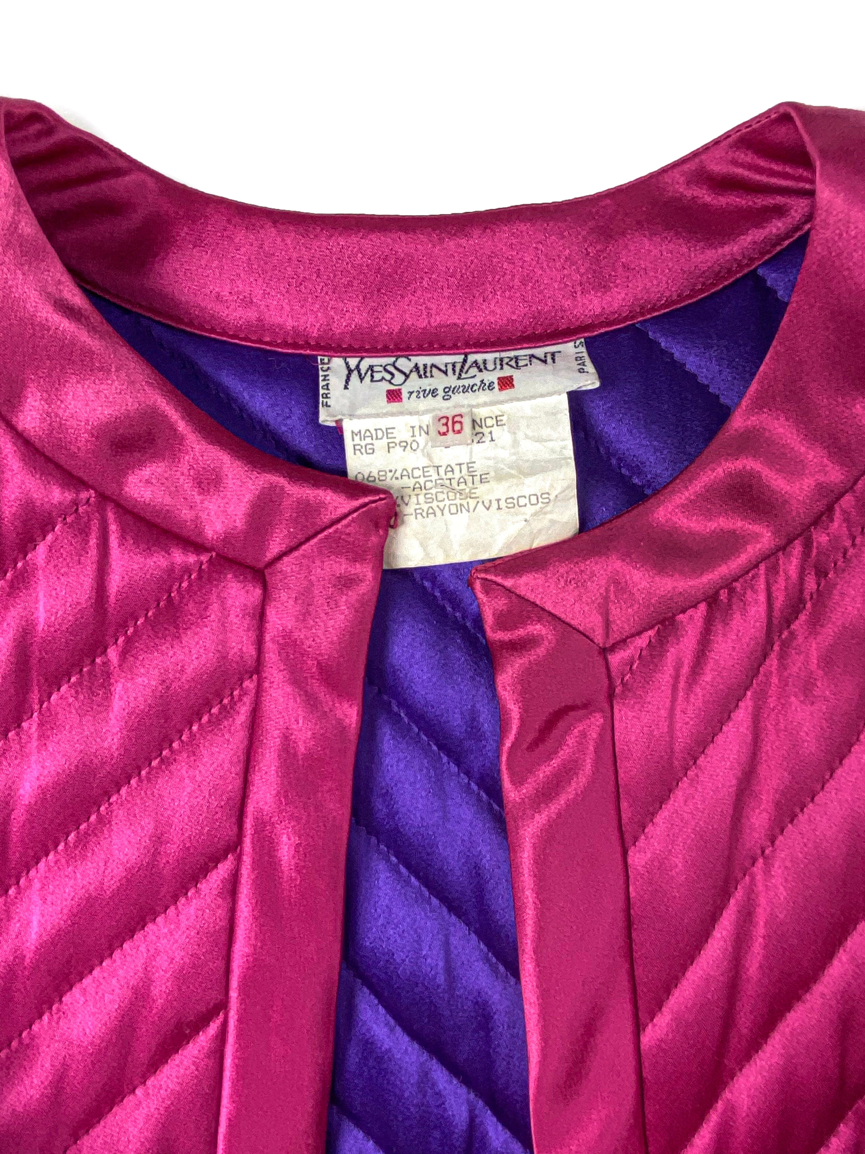 An Yves Saint Laurent Rive Gauche pink satin jacket with a quilted texture. The jacket has a mandarin collar with a hook and eye closure at the neckline. Jacket has a vibrant purple lining that is also a quilted texture. There are two open pockets on either side of the jacket. Circa early 1990's.